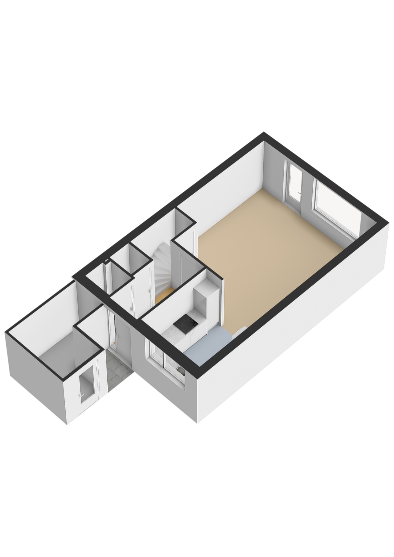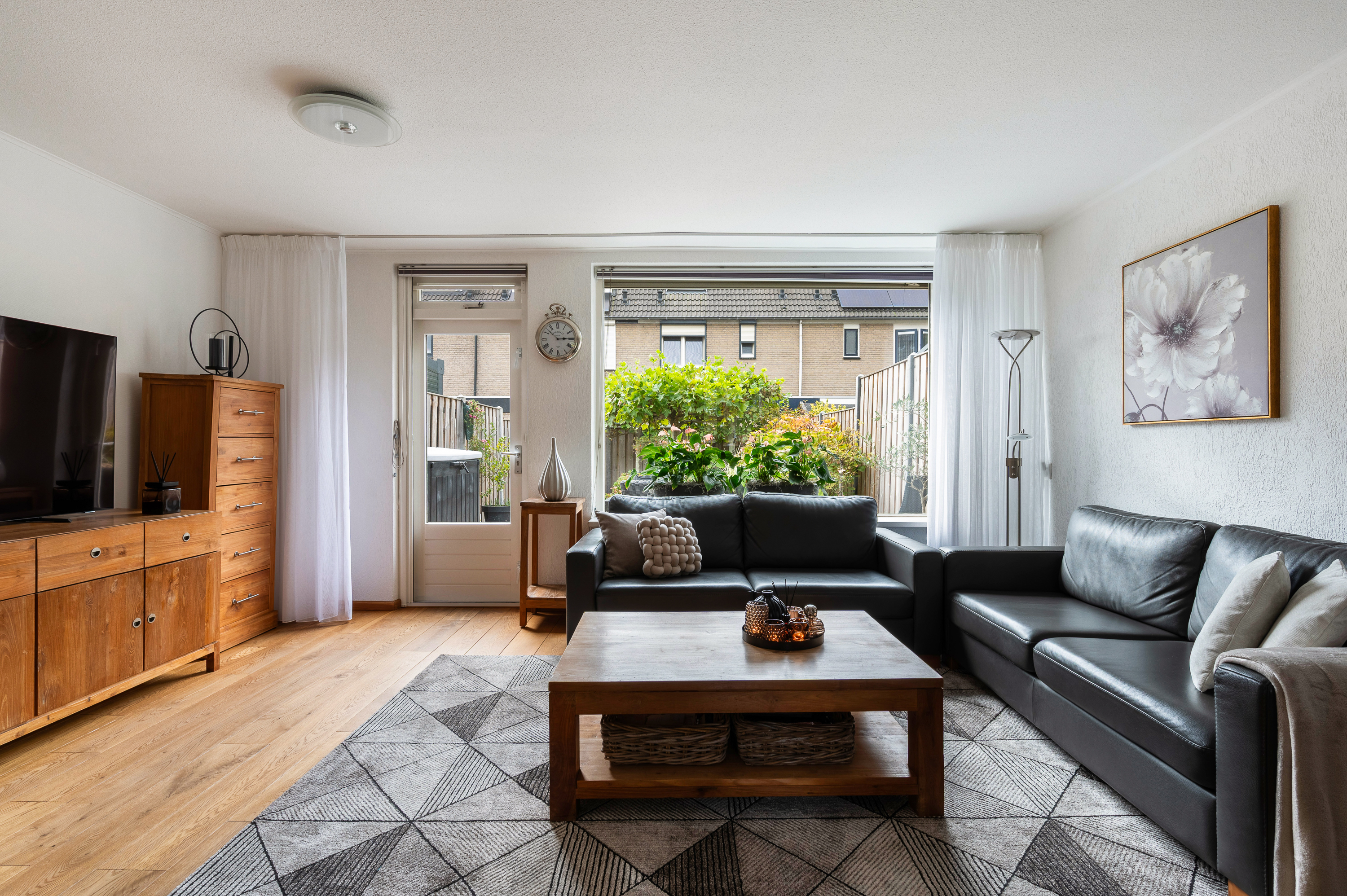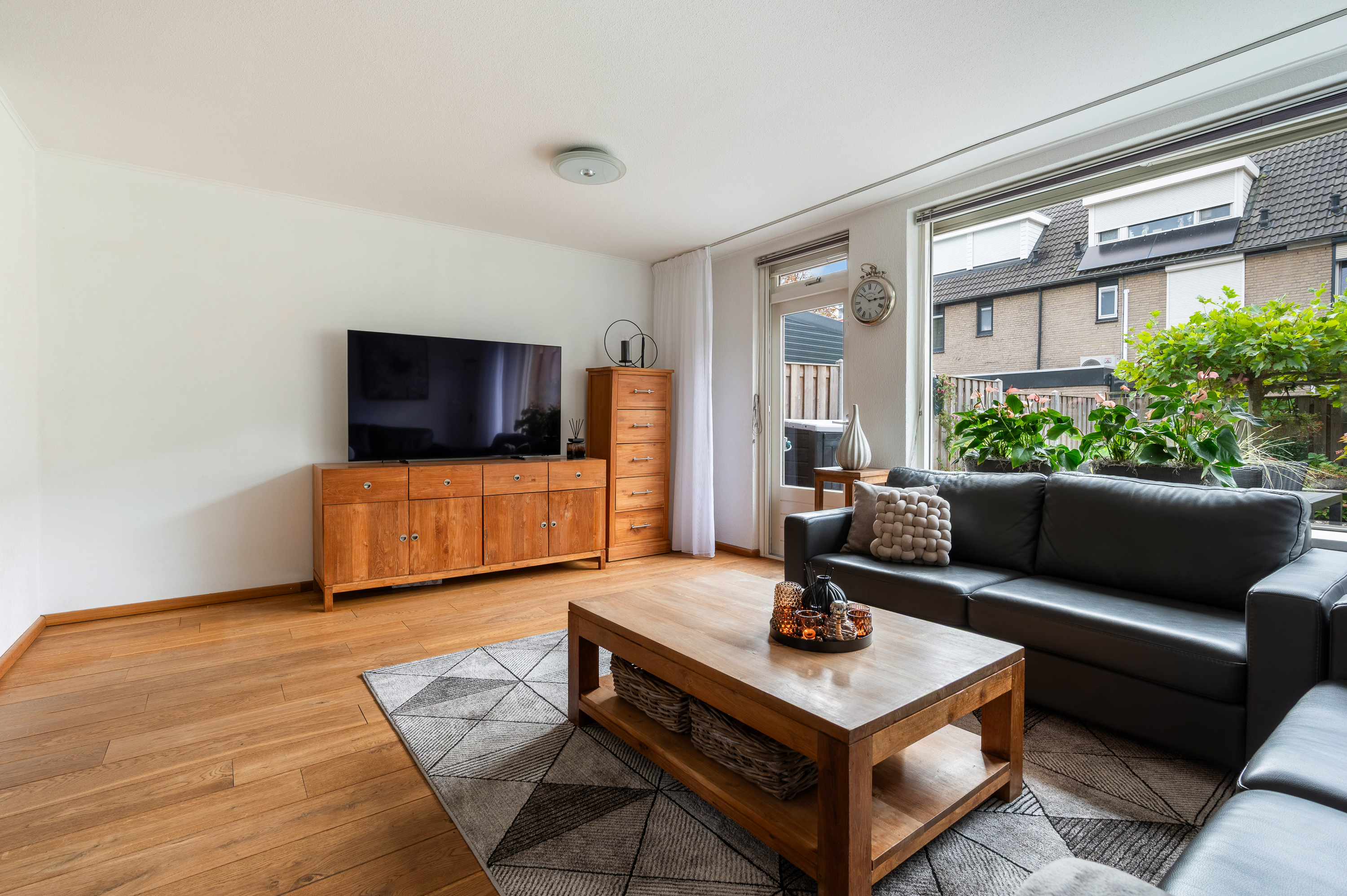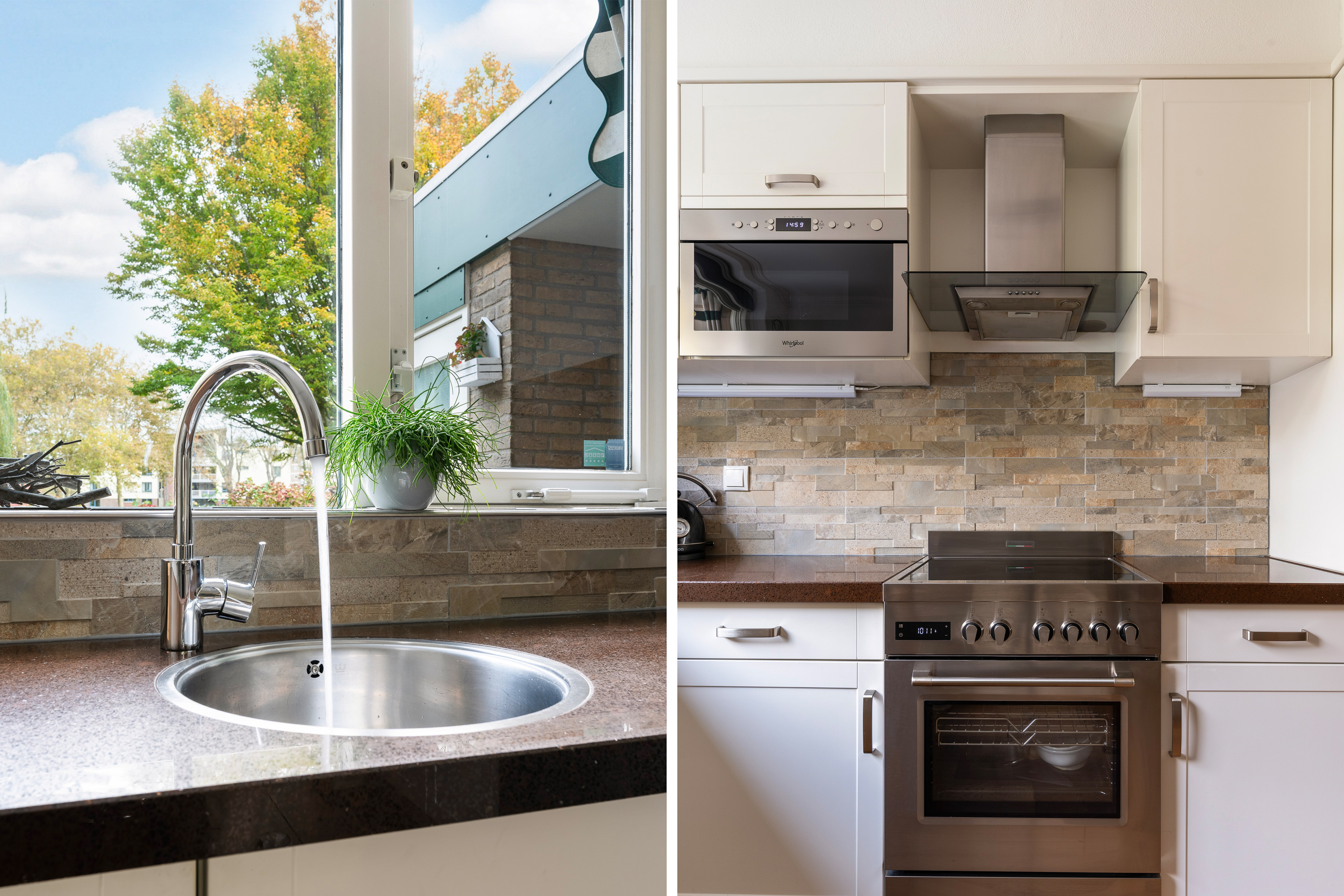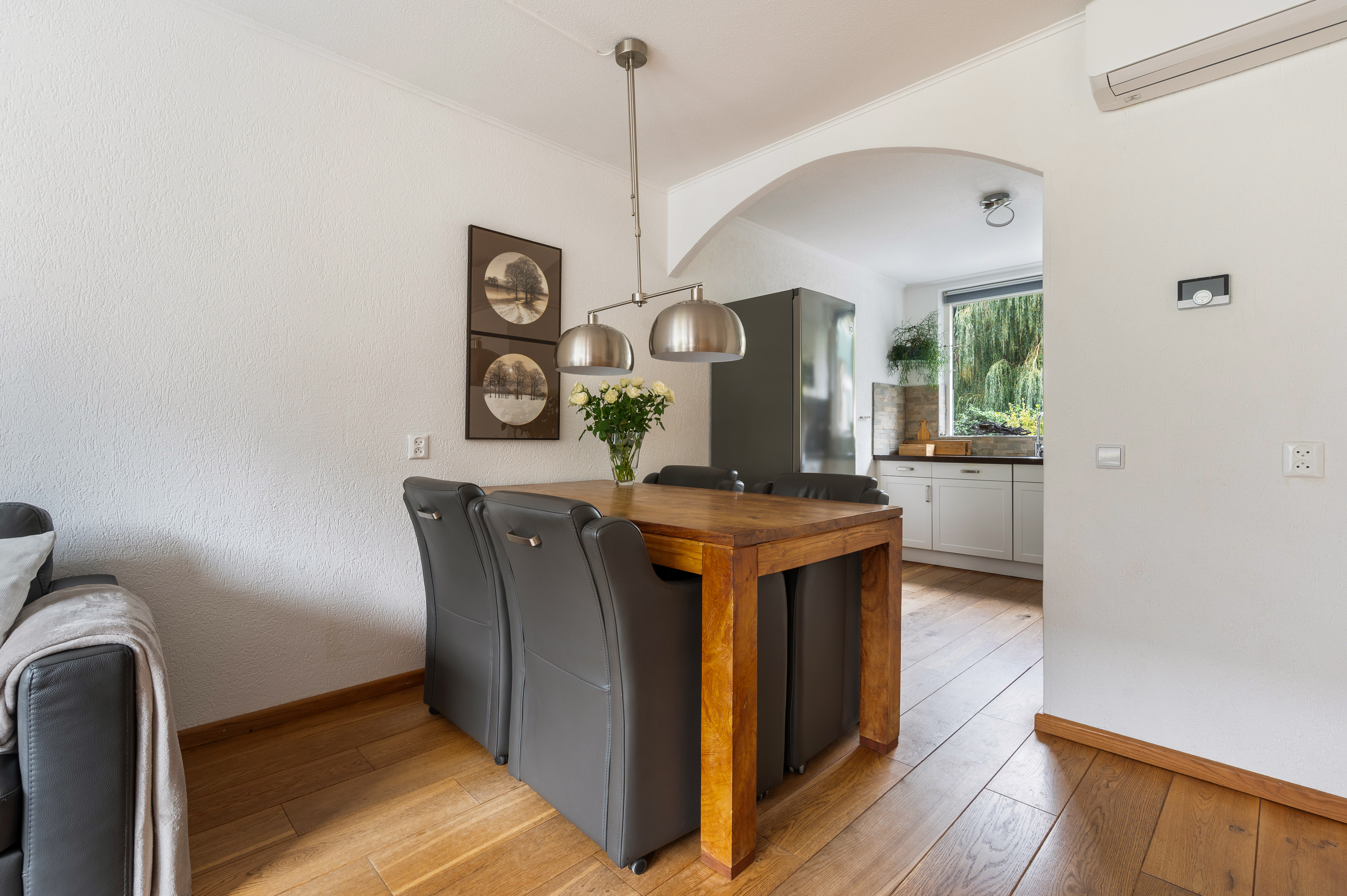 Woonkamer met trapkast en toegang tot de fijne achtertuin. In de woonkamer is een airconditioning geïnstalleerd, bouwjaar 2024, merk Mitsubishi. Aansluitend aan de voorzijde gelegen open keuken. De keuken is geplaatst in hoekopstelling en in 2024 voorzien van compleet nieuwe inbouwapparatuur, o.a. Boretti fornuis met oven en 4-pits inductiekookplaat, afzuigkap, magnetron, vaatwasmachine en koel-/vriescombinatie.