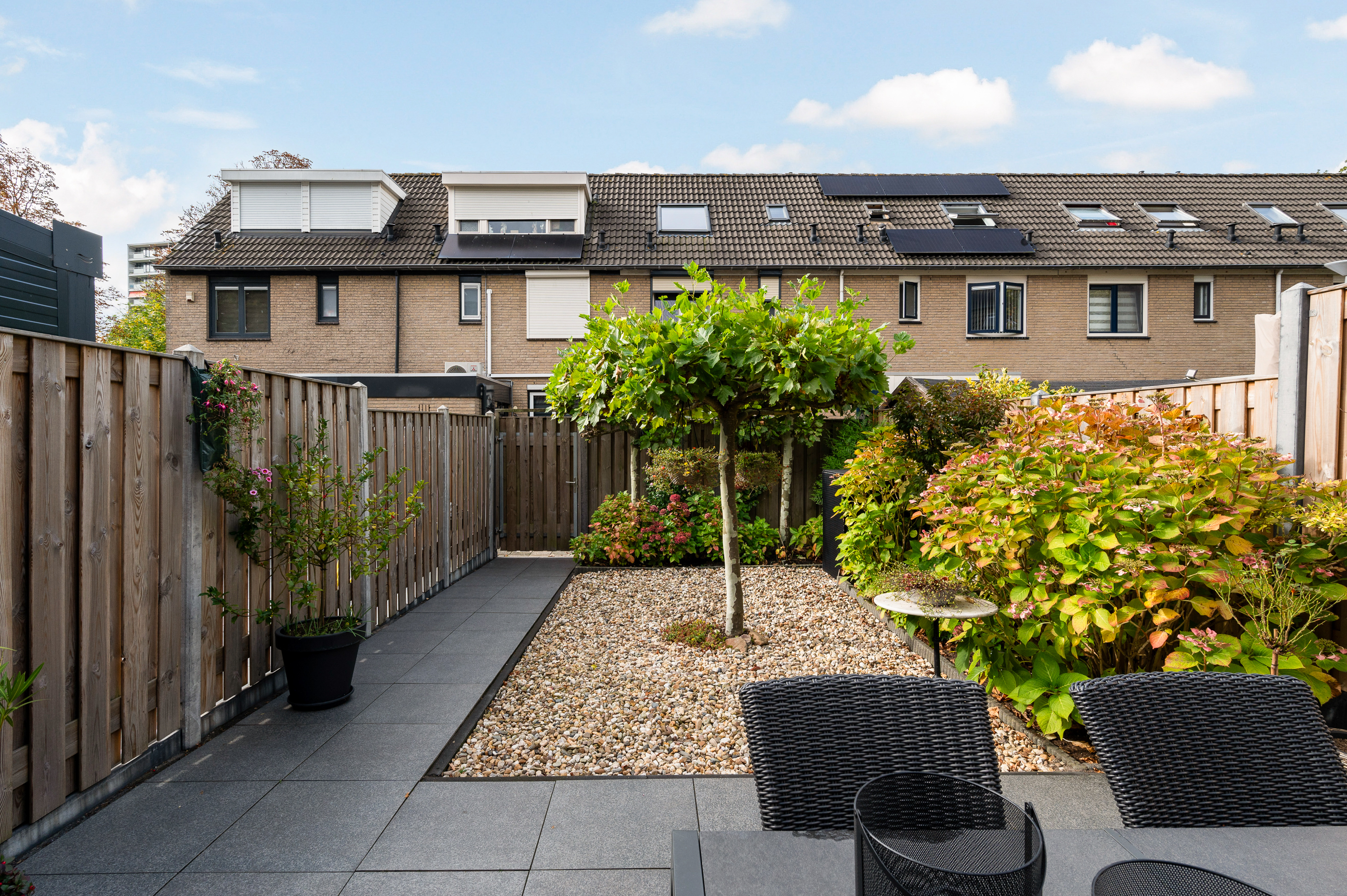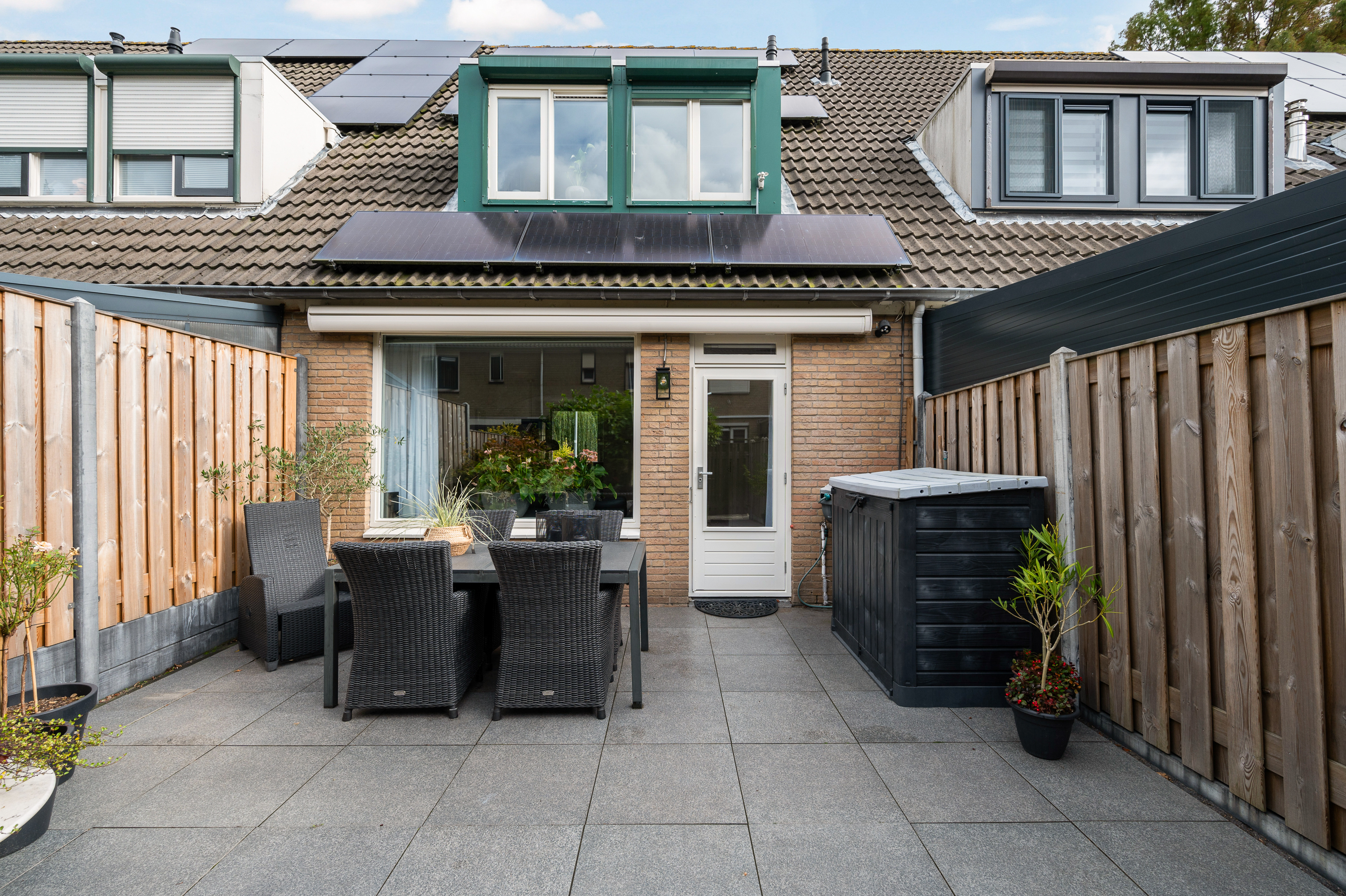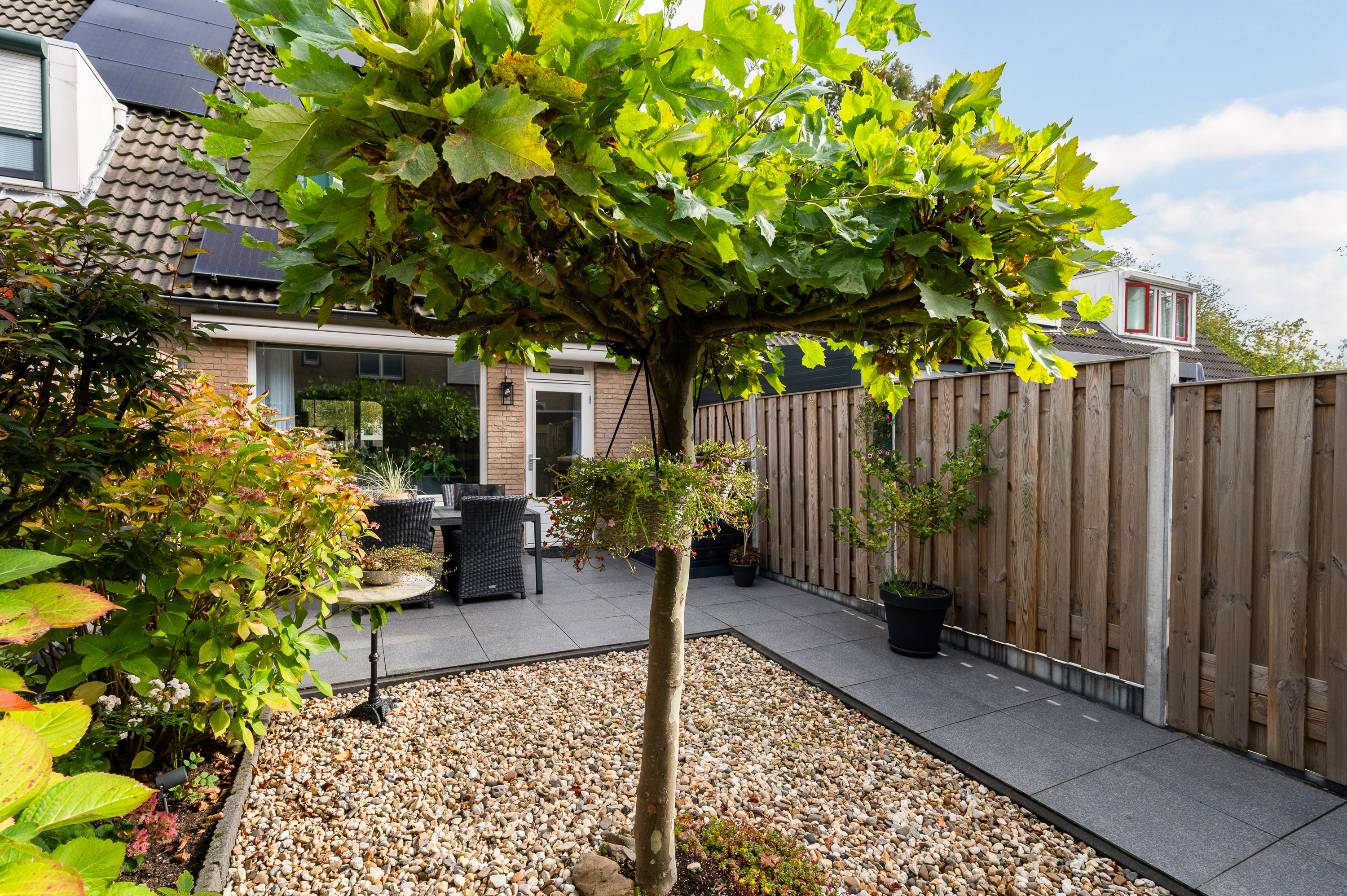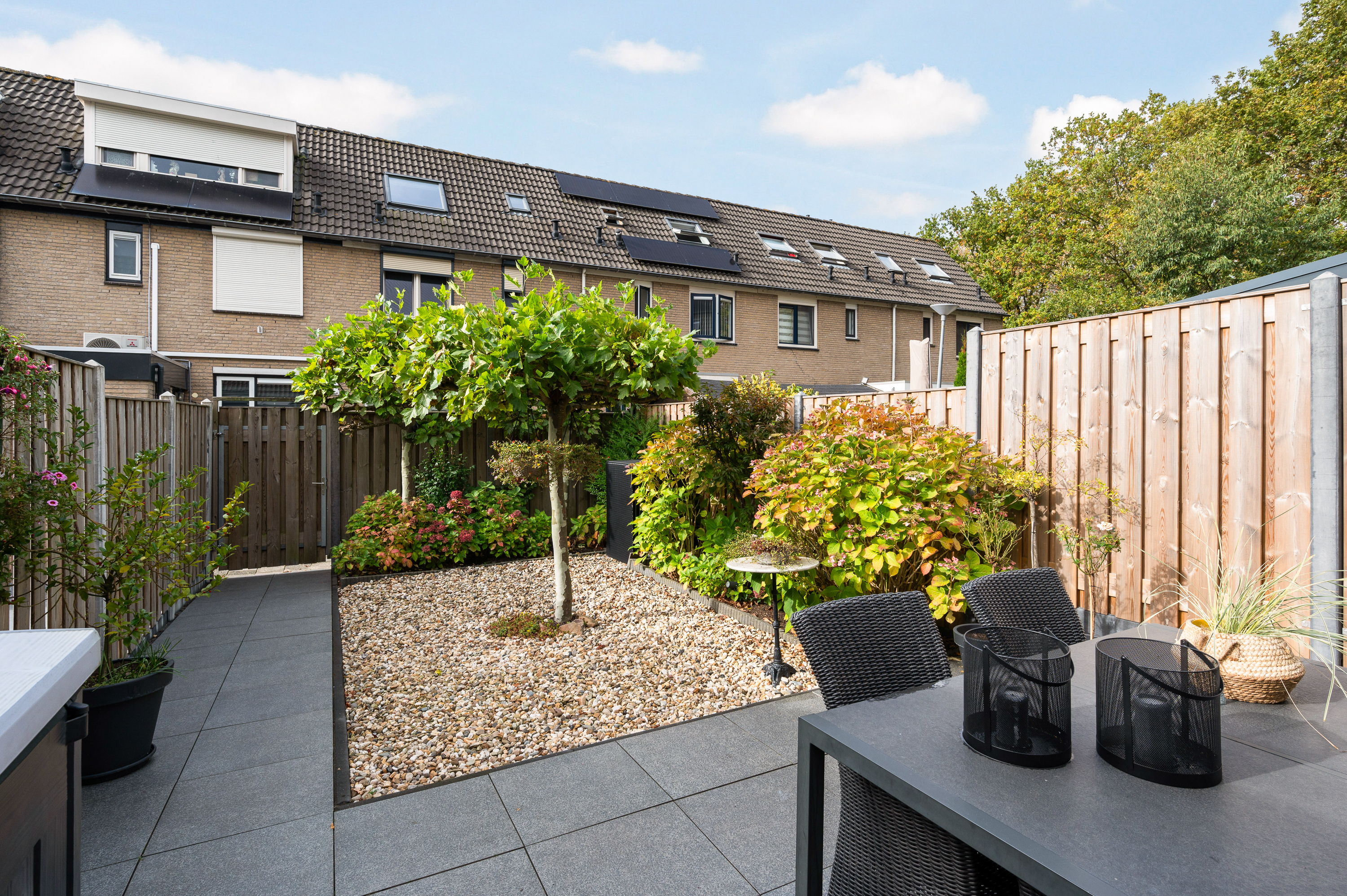 Fraai aangelegd en verzorgd, voorzien van keramische tegels, degelijke erfafscheidingen en achterom. Aan de achtergevel is een elektrisch zonnescherm aanwezig. Aan de voorzijde een markies. Aan de voor- en achterzijde voorzien van een waterkraan.