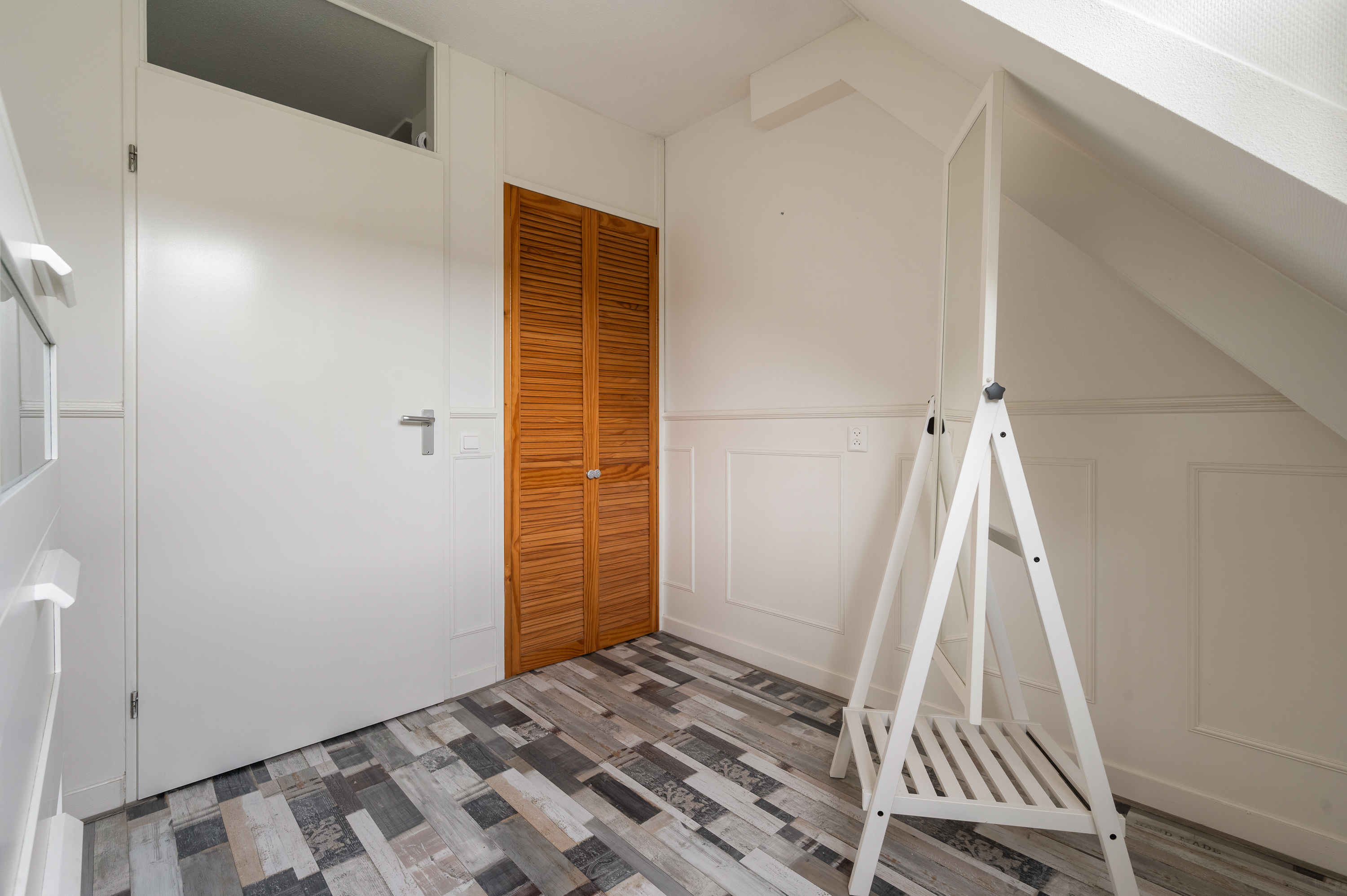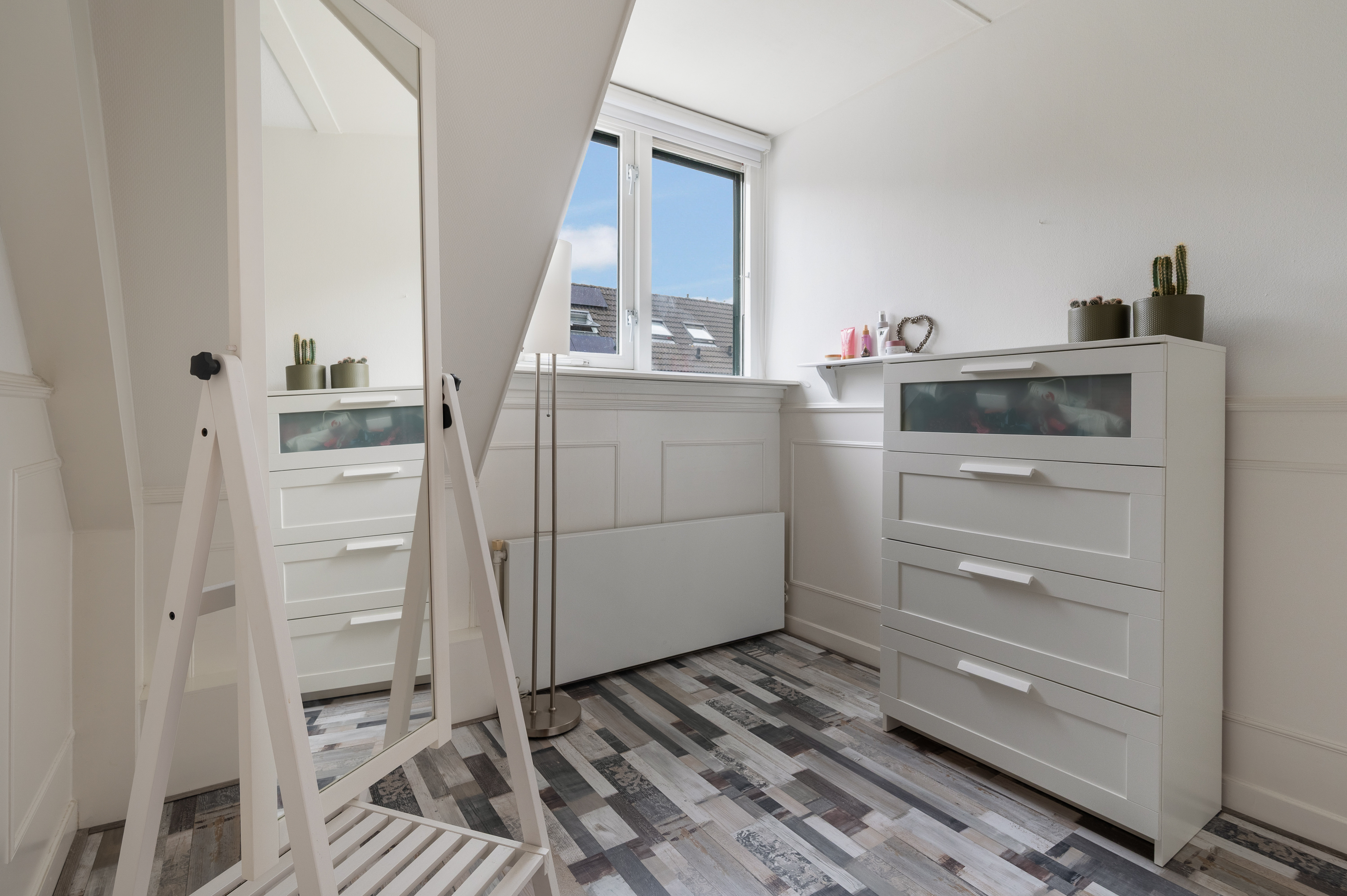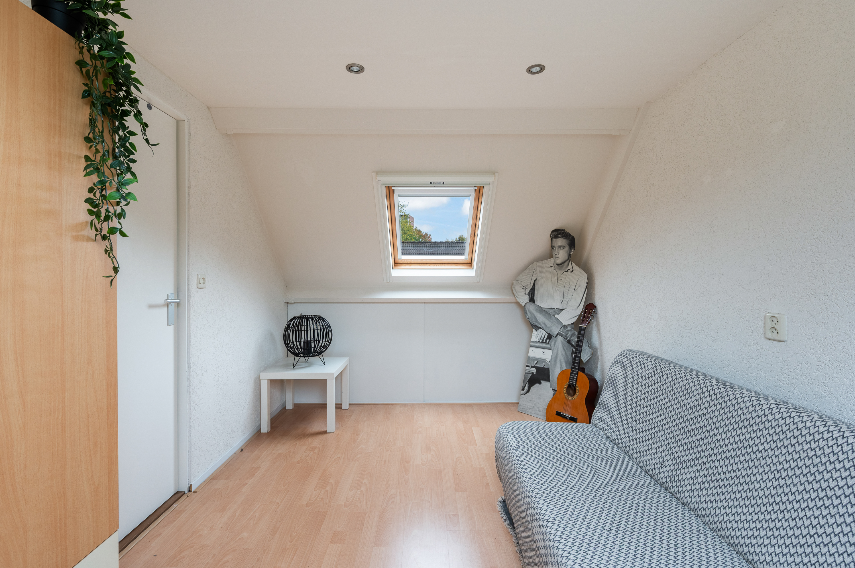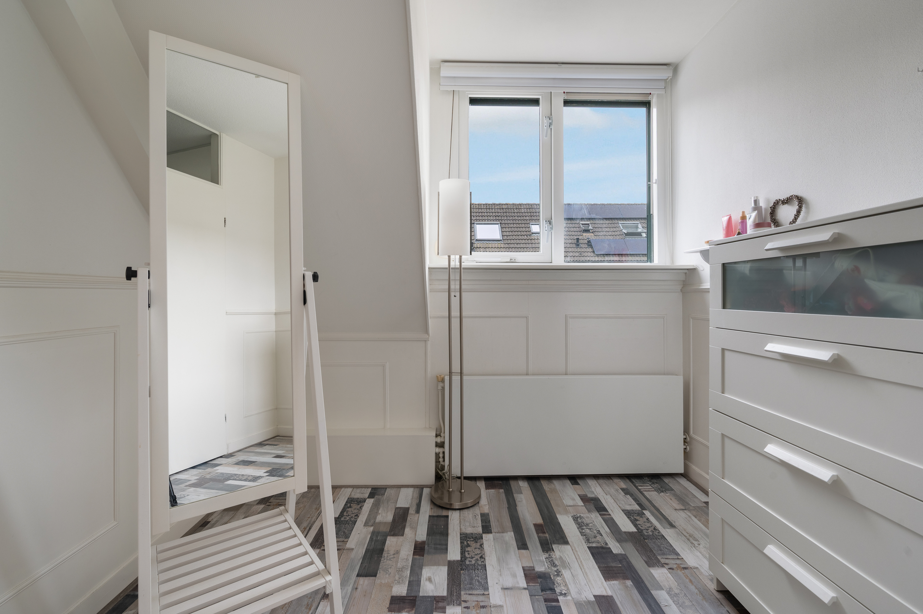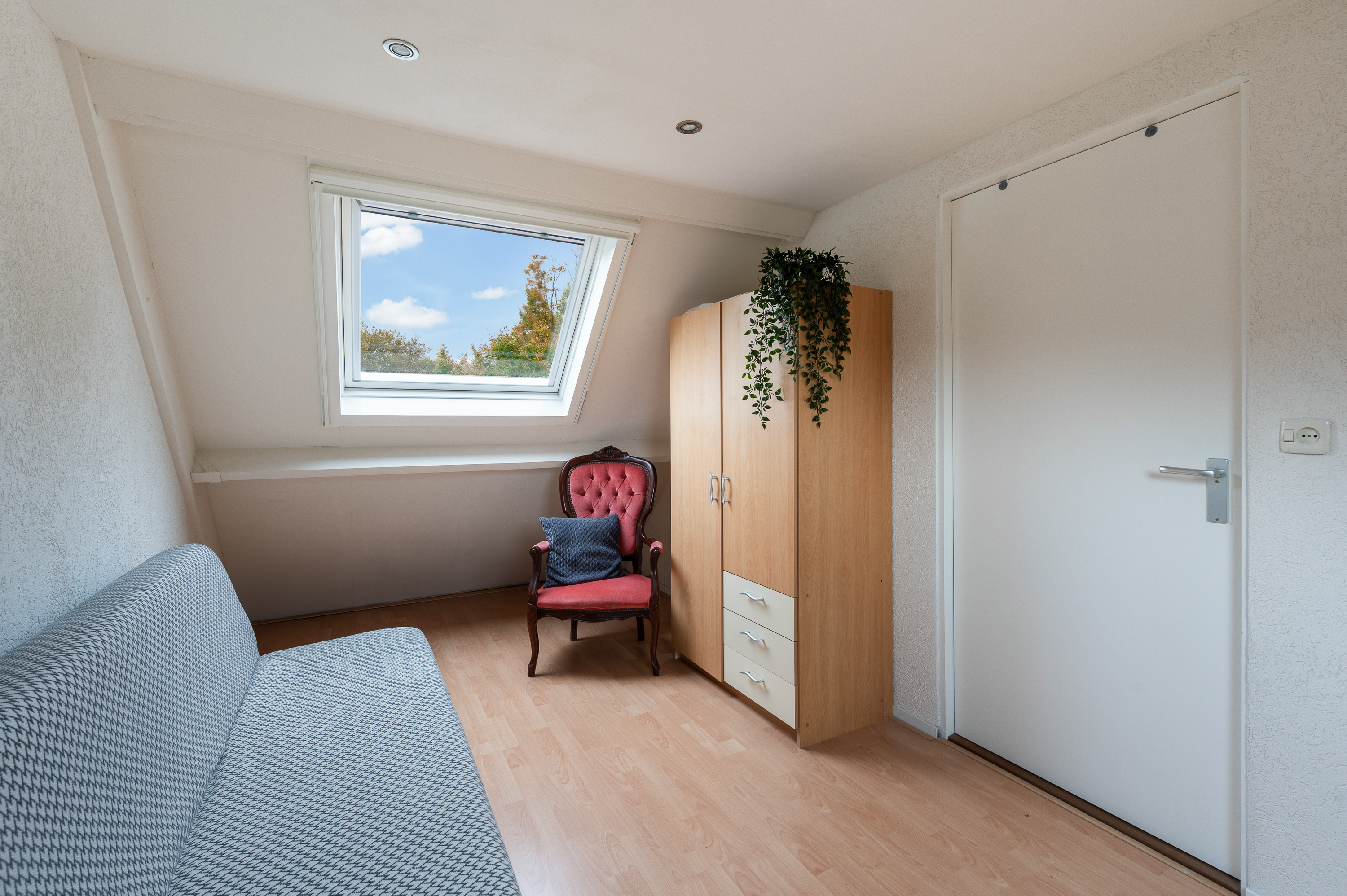 De vierde slaapkamer is aan de voor- en achterzijde voorzien van een groot dakraam, bergruimte achter knieschot. Bovenop de slaapkamer bevindt zich nog een puntje bergvliering.