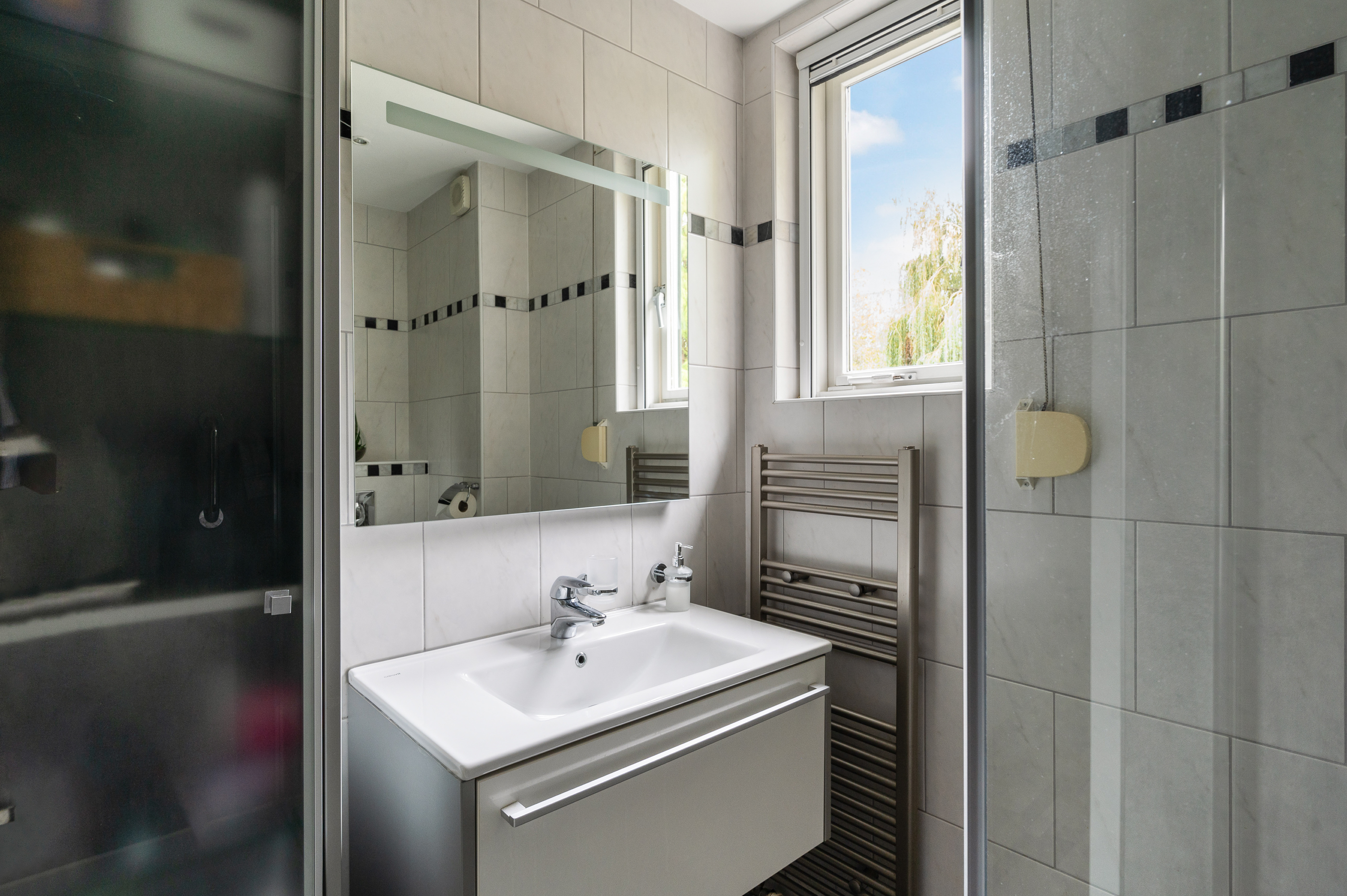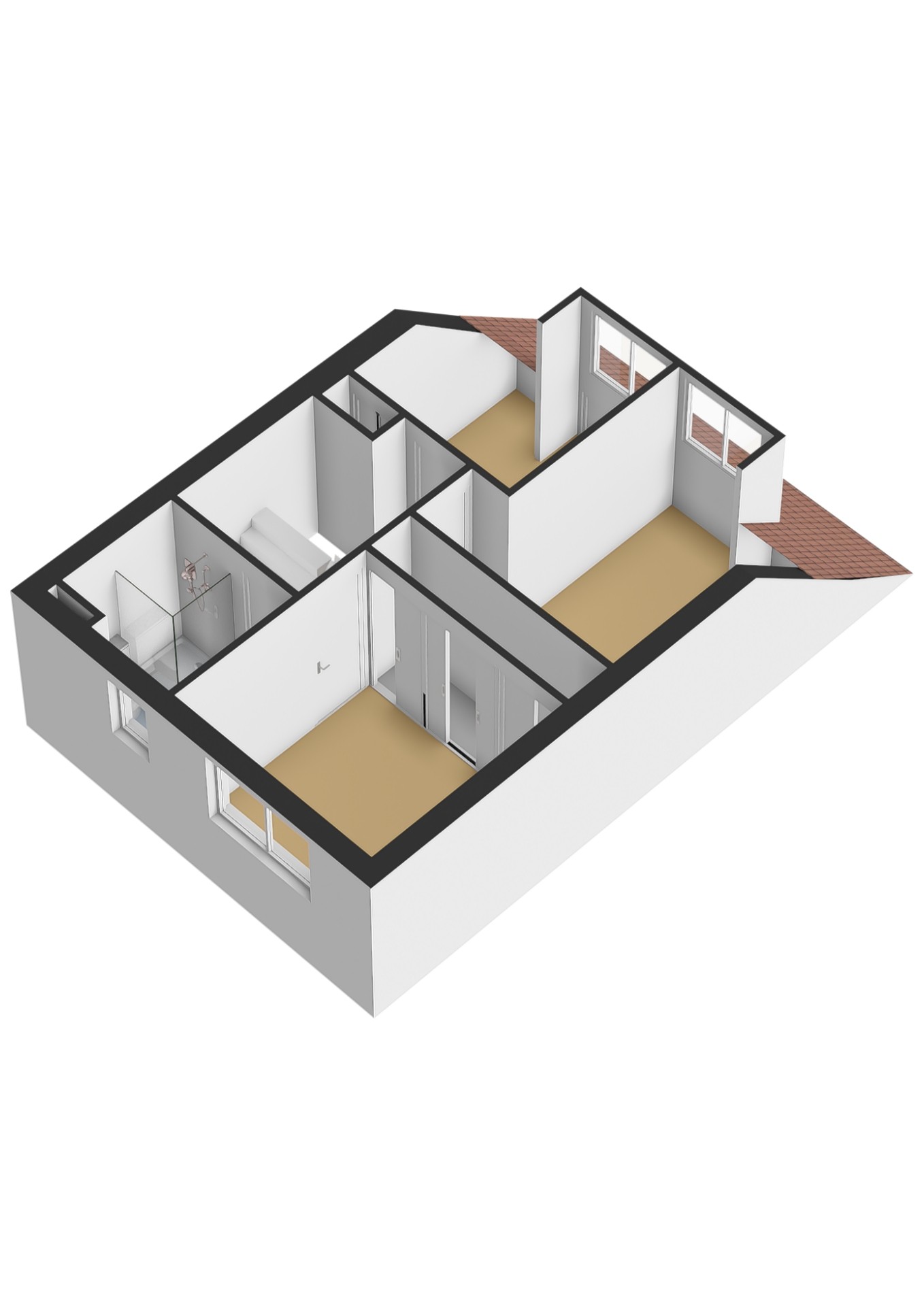 Overloop met vaste trapopgang naar de 2e verdieping. Ouderslaapkamer aan de voorzijde met 4-deurs schuifkastenwand en rolluik. Twee slaapkamers aan de achterzijde van de woning met dakkapel voorzien van rolluik. Tot aan het plafond betegelde moderne badkamer, voorzien van wastafelmeubel, douche met regendouche en glazen scherm, hangend toilet, stucplafond met inbouwverlichting en rolluik.