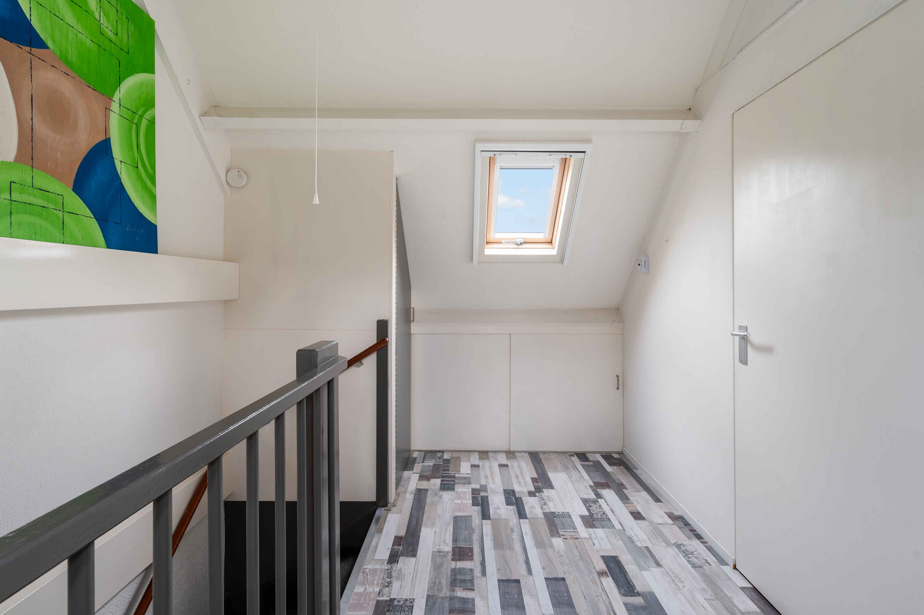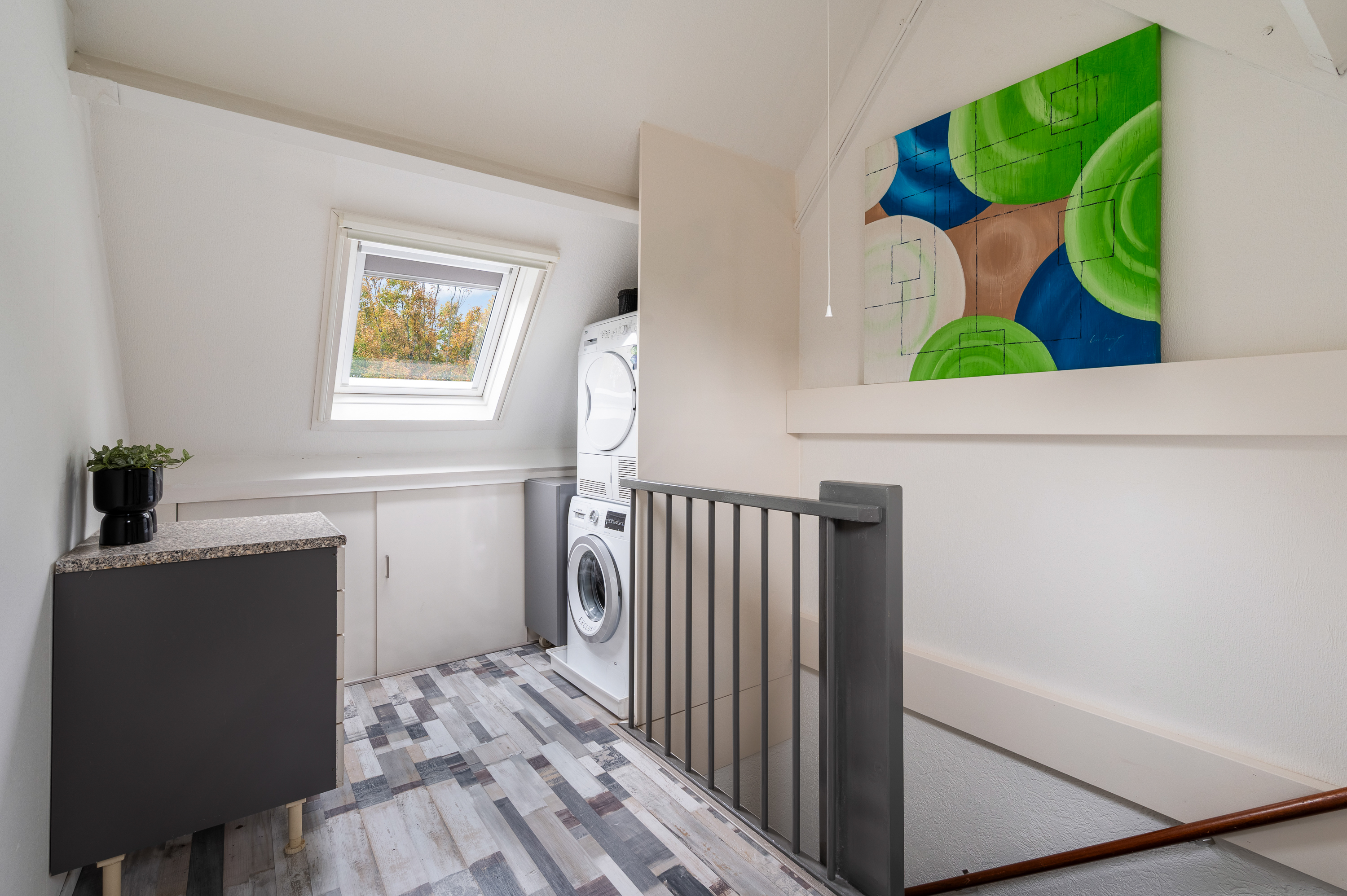 Overloop met dakraam aan de voor- en achterzijde, wasmachine aansluiting en omvormer van de zonnepanelen. De Remeha HR combiketel is in 2023 geplaatst.