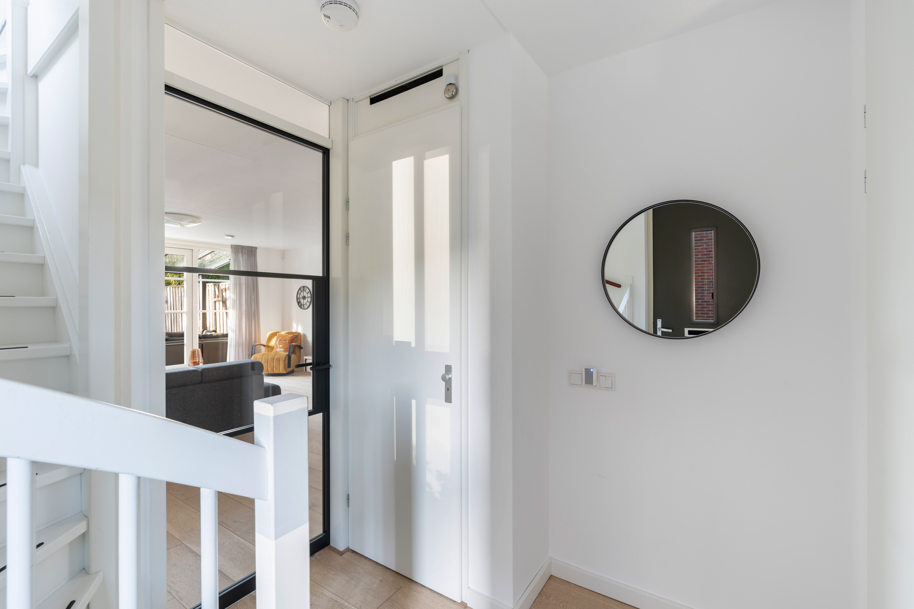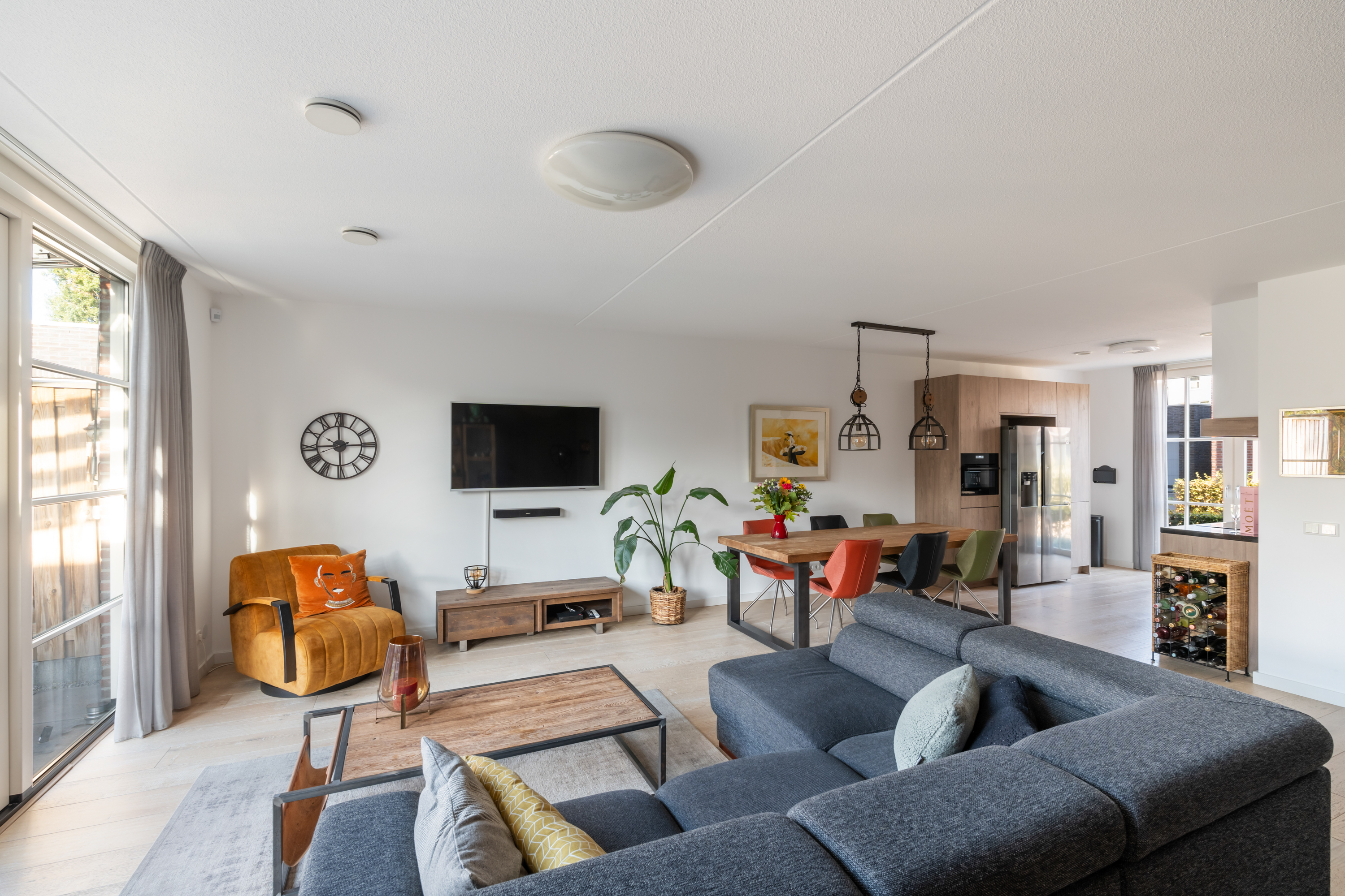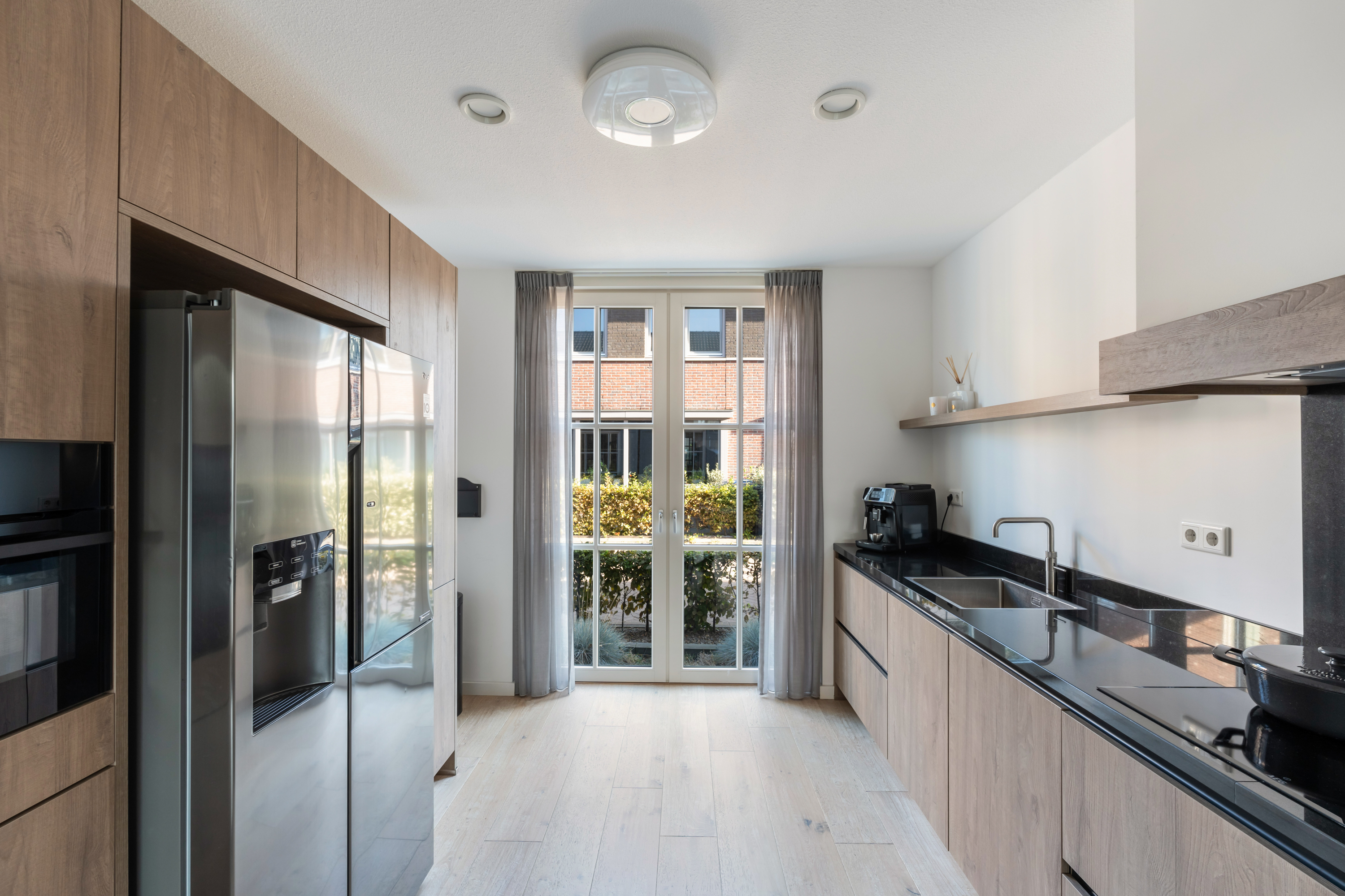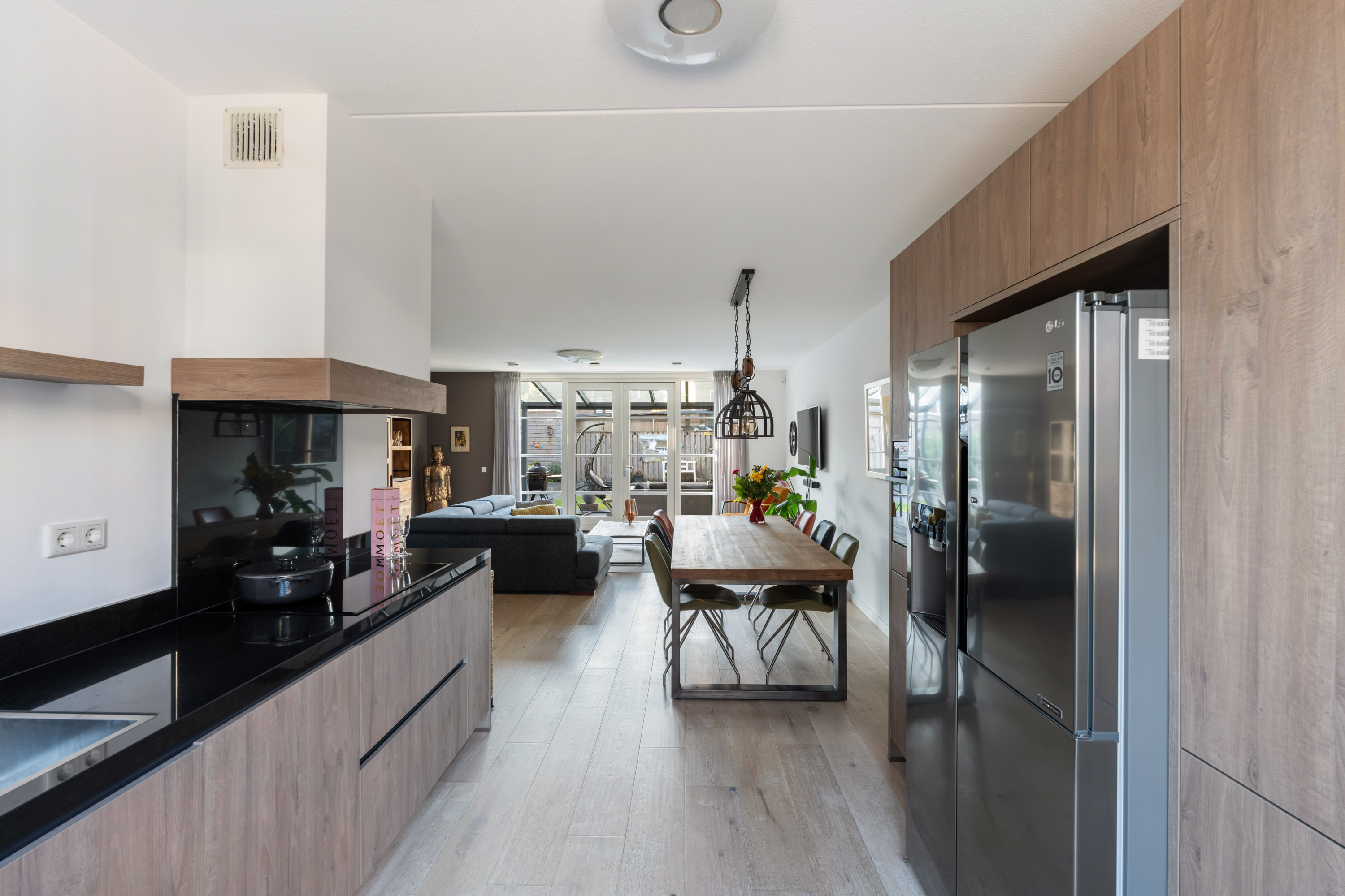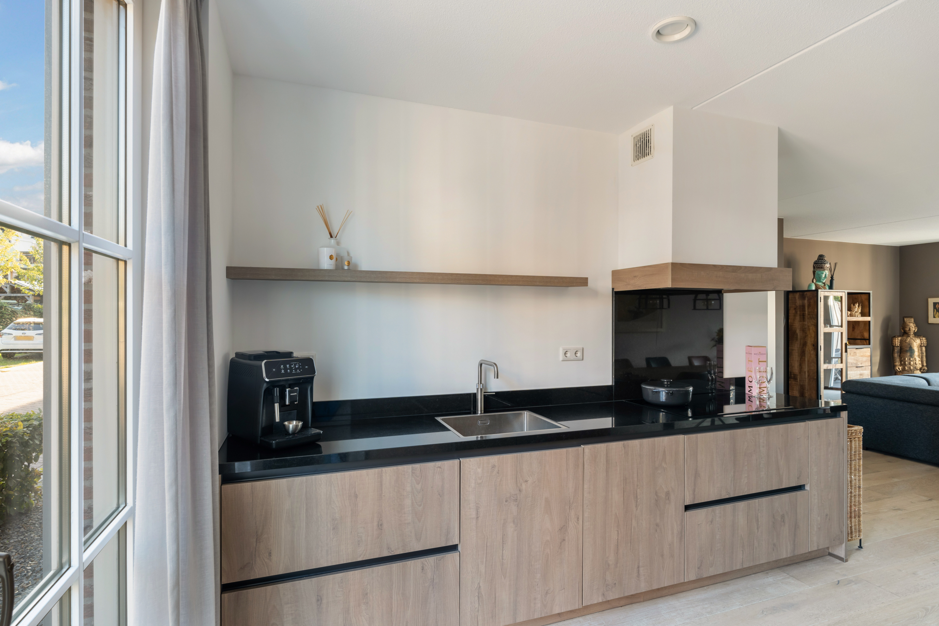 Entree hal met garderobekast, meterkast. Trapopgang naar de 1e verdieping. Luxe betegeld toilet met fonteintje. Via een zwart stalen/glasdeur “Gers” naar de heerlijk lichte woonkamer welke is voorzien van een glazen achterpui met openslaande deuren naar de zonnige tuin. Stucwerk wanden en een fijne trap-/bergkast. De luxe complete open keuken is aan de voorzijde gelegen en voorzien van een neutraal keukenblok aan beide zijden met voldoende kastruimte, lades, inductiekookplaat en afzuigkap. Amerikaanse koelkast, combi-oven, vaatwasmachine, natuursteen bovenblad en een quooker. Laag glas aan de voorzijde van de keuken met draai-/kiepramen. De gehele begane grond is voorzien van een fraaie houten vloer met een 3-groeps vloerverwarming.