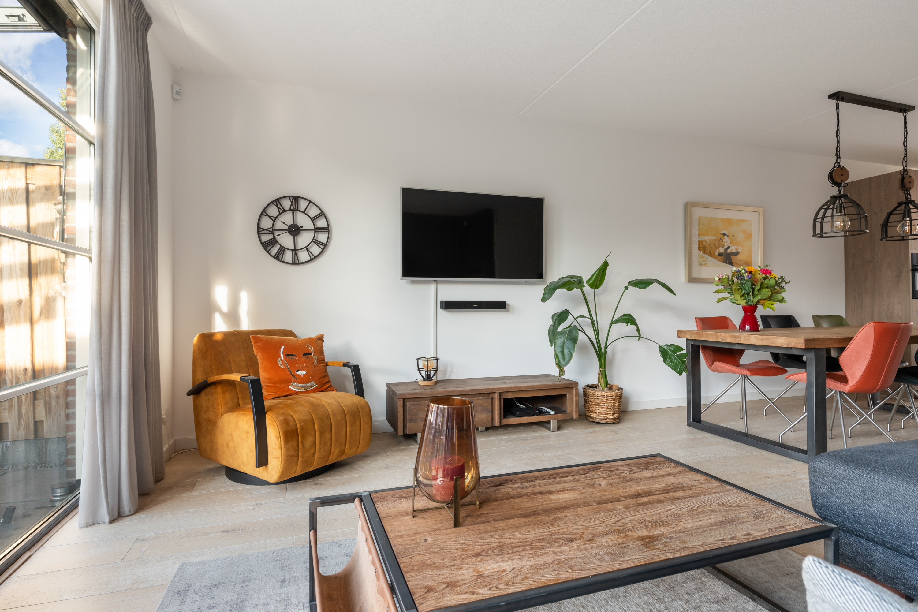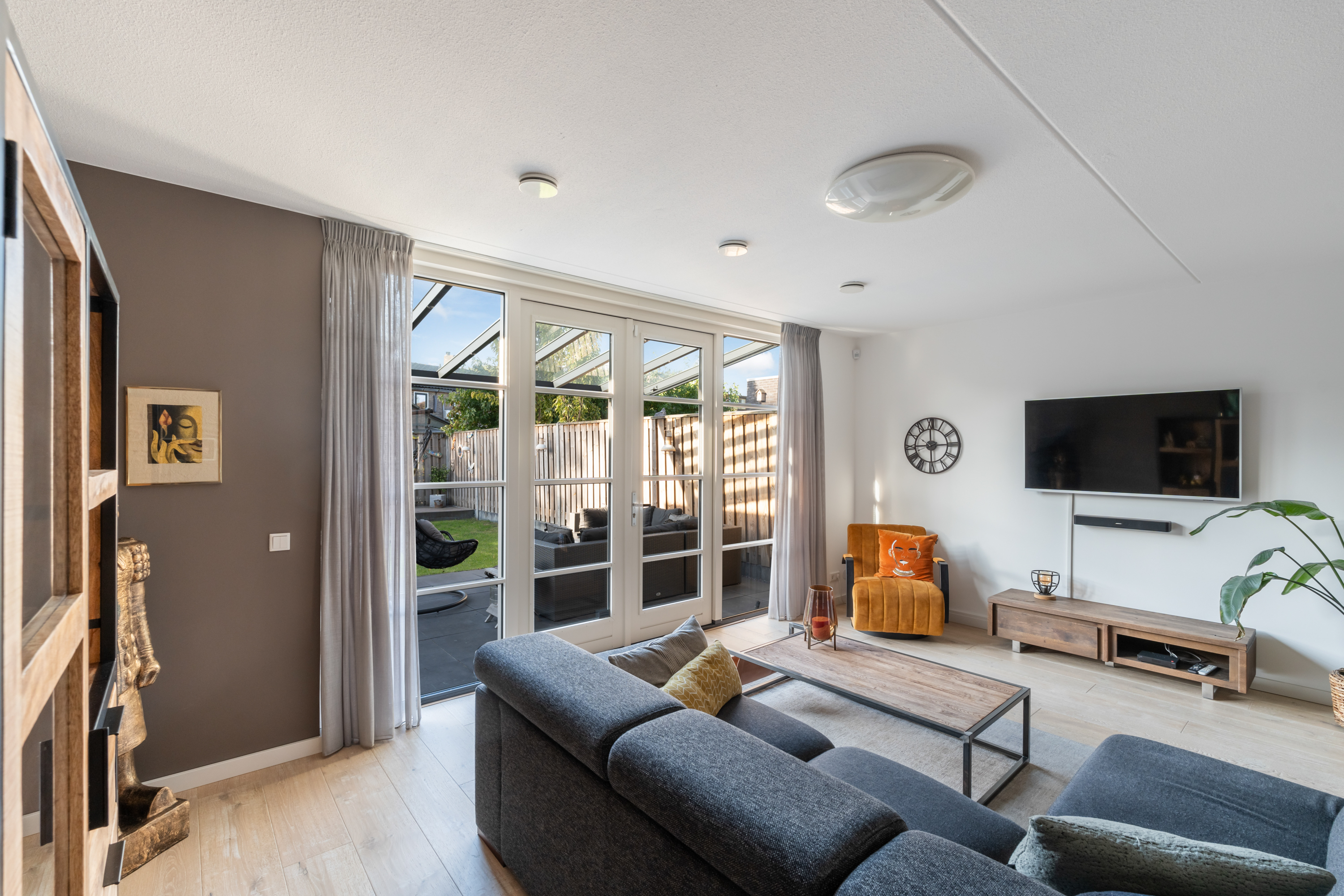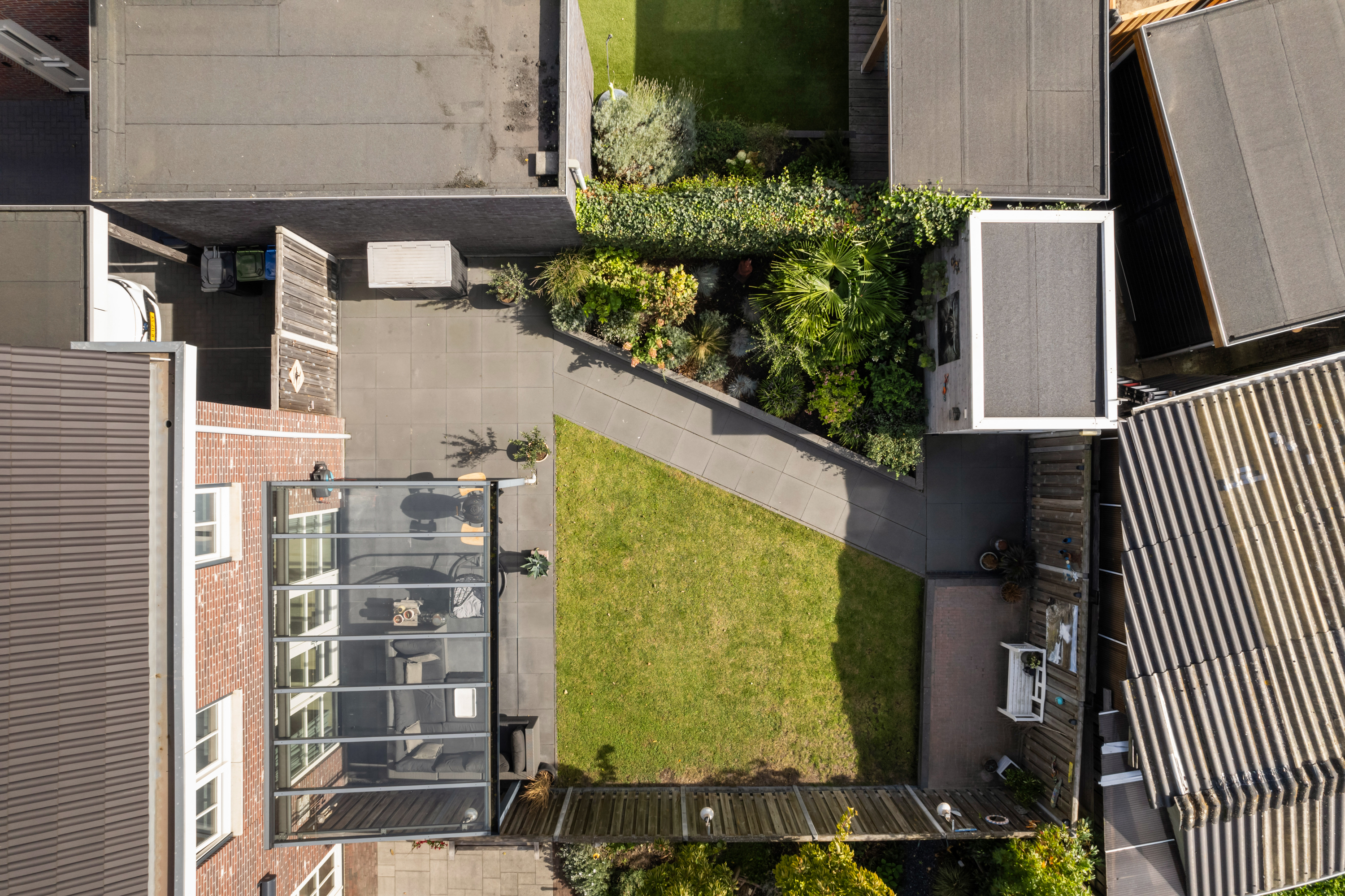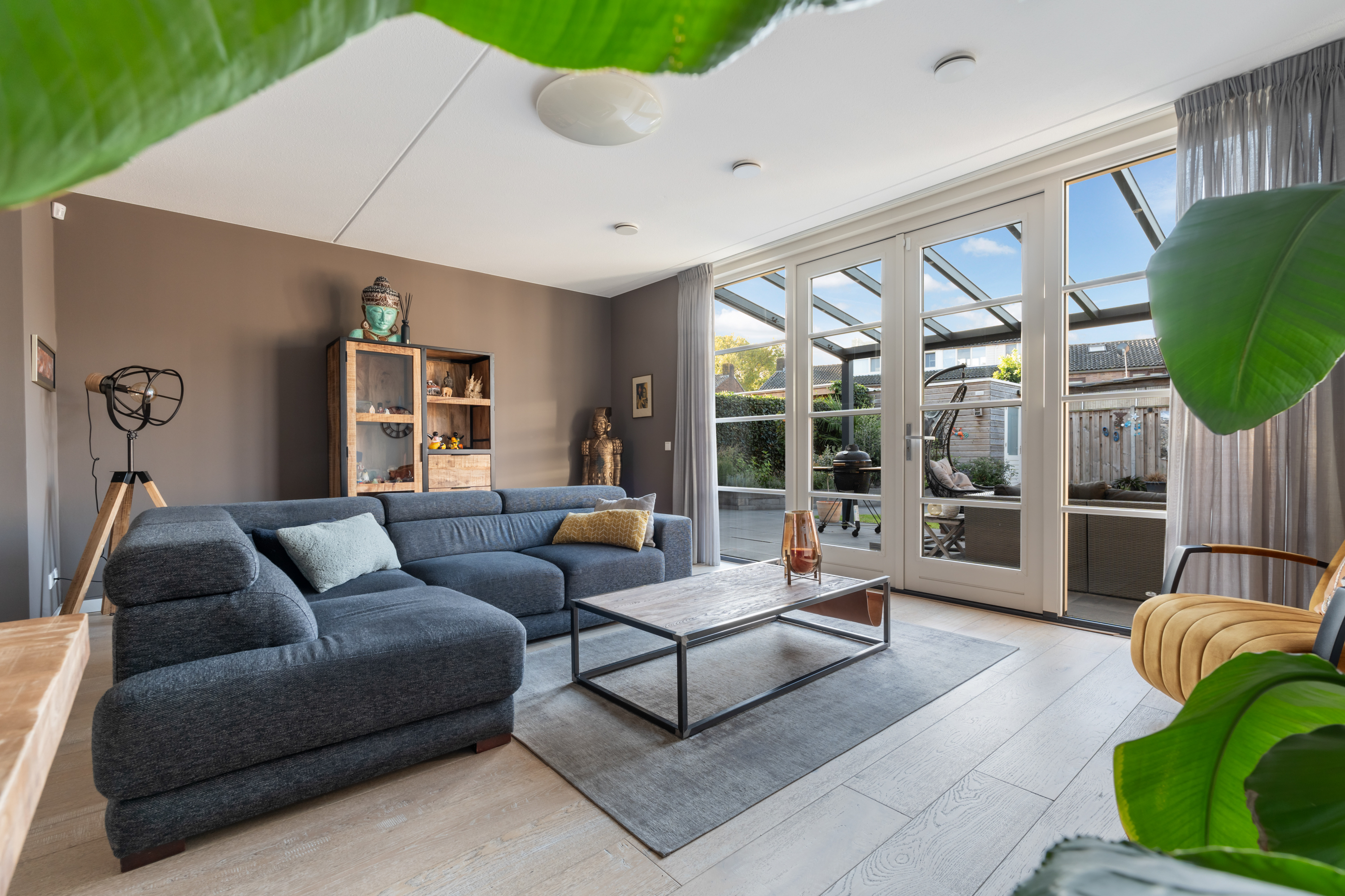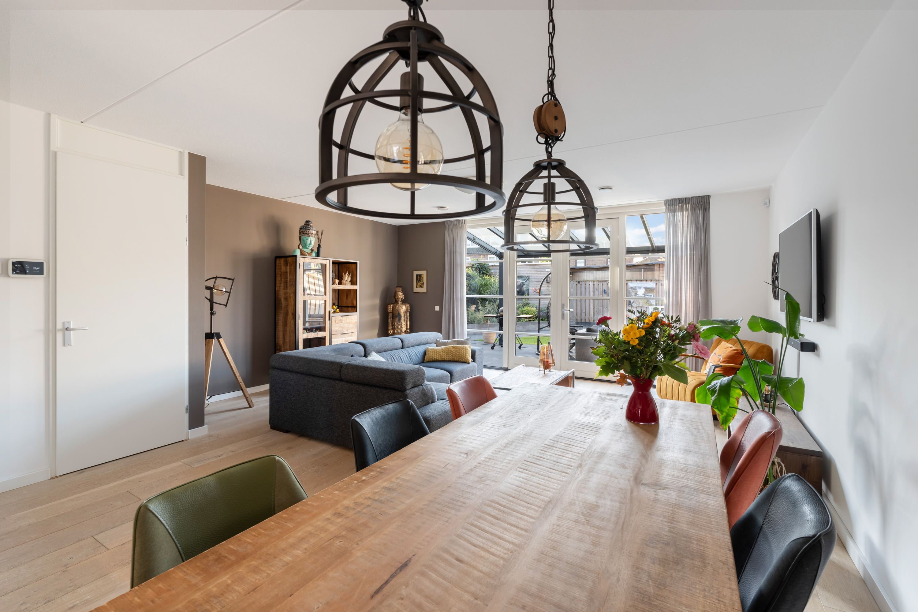 Entree hal met garderobekast, meterkast. Trapopgang naar de 1e verdieping. Luxe betegeld toilet met fonteintje. Via een zwart stalen/glasdeur “Gers” naar de heerlijk lichte woonkamer welke is voorzien van een glazen achterpui met openslaande deuren naar de zonnige tuin. Stucwerk wanden en een fijne trap-/bergkast. De luxe complete open keuken is aan de voorzijde gelegen en voorzien van een neutraal keukenblok aan beide zijden met voldoende kastruimte, lades, inductiekookplaat en afzuigkap. Amerikaanse koelkast, combi-oven, vaatwasmachine, natuursteen bovenblad en een quooker. Laag glas aan de voorzijde van de keuken met draai-/kiepramen. De gehele begane grond is voorzien van een fraaie houten vloer met een 3-groeps vloerverwarming.