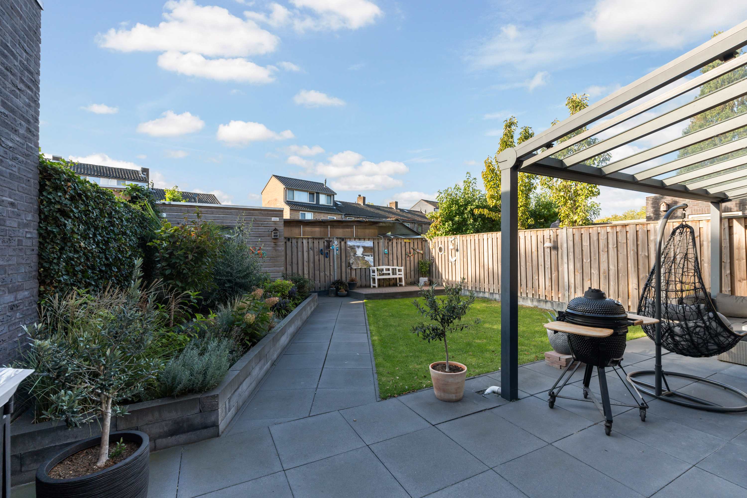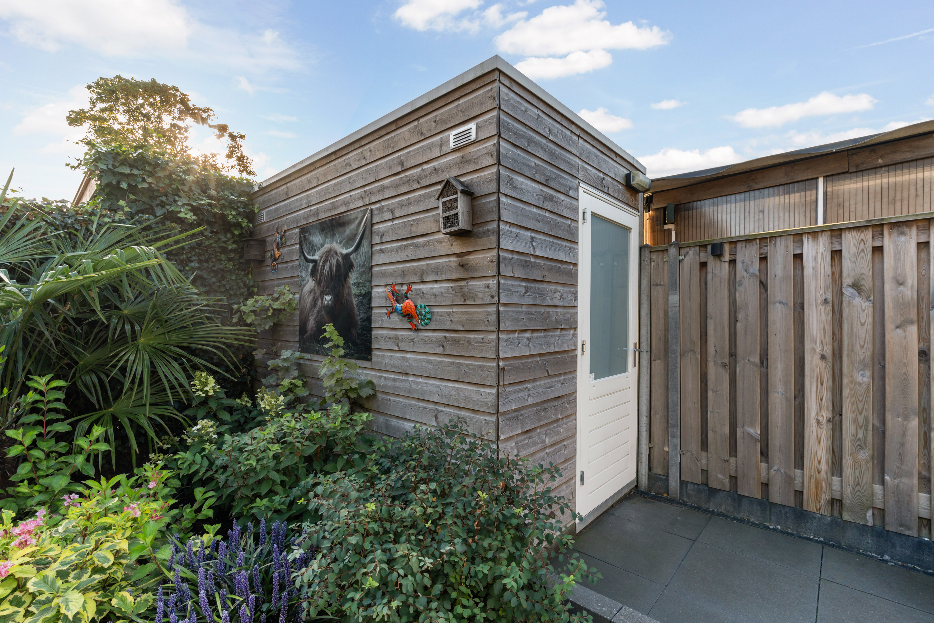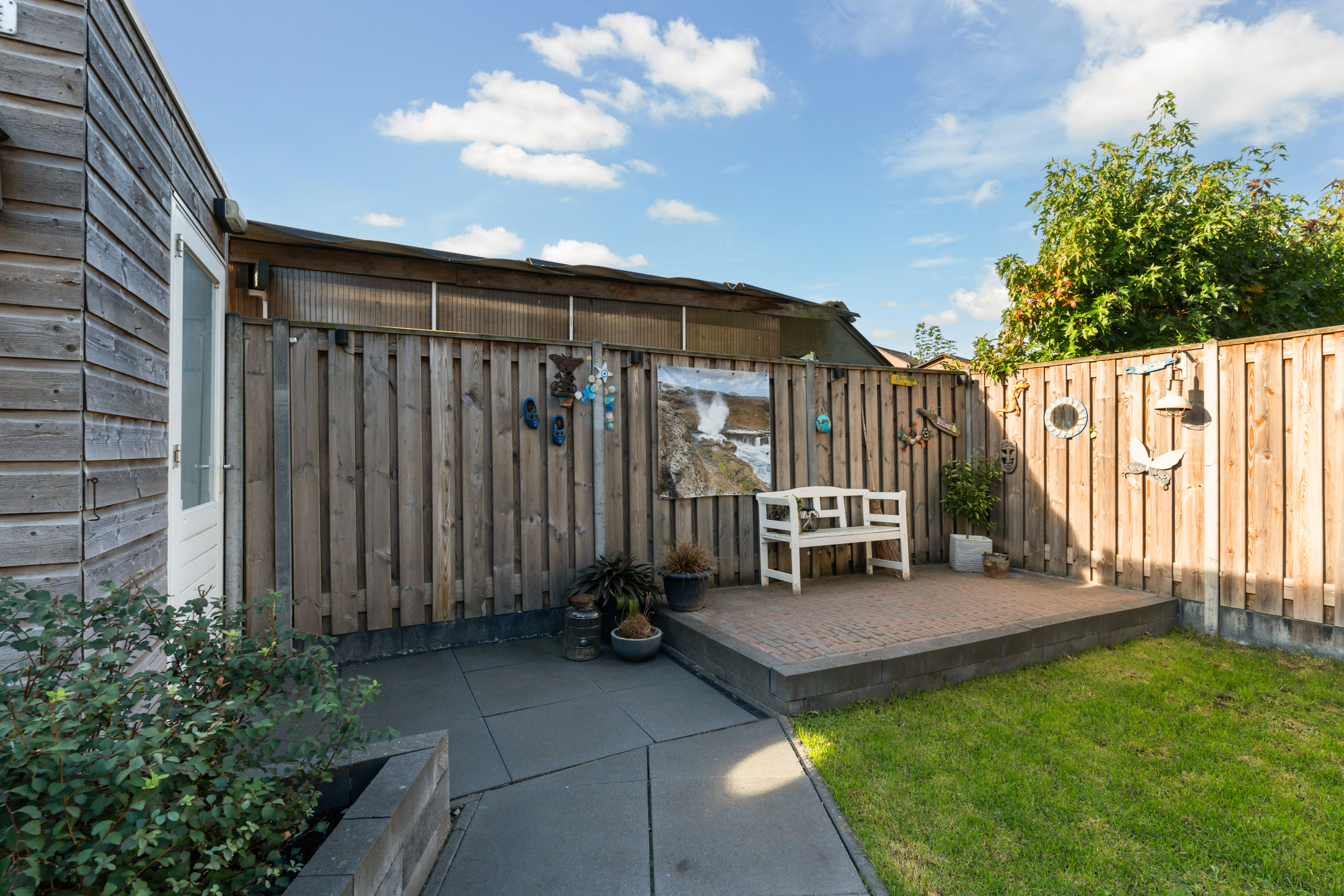 De achtertuin is gelegen op het zuiden, heeft veel privacy en is circa 12 meter diep en circa 9 meter breed. Is geheel omheind en grotendeels voorzien van straatwerk. Vaste planten en een stukje gras. Achter in de tuin staat tevens een houten berging welke is voorzien van elektra. Aan de achtergevel van de woning is een overkapping geplaatst welke is voorzien van zonwering en verlichting. Via een afgesloten poort aan de zijkant van de woning, kom je in de carport en parkeermogelijkheden voor 2 auto’s naast de woning. De voortuin is onderhoudsvriendelijk gemaakt met een beukhaag en siergrind.