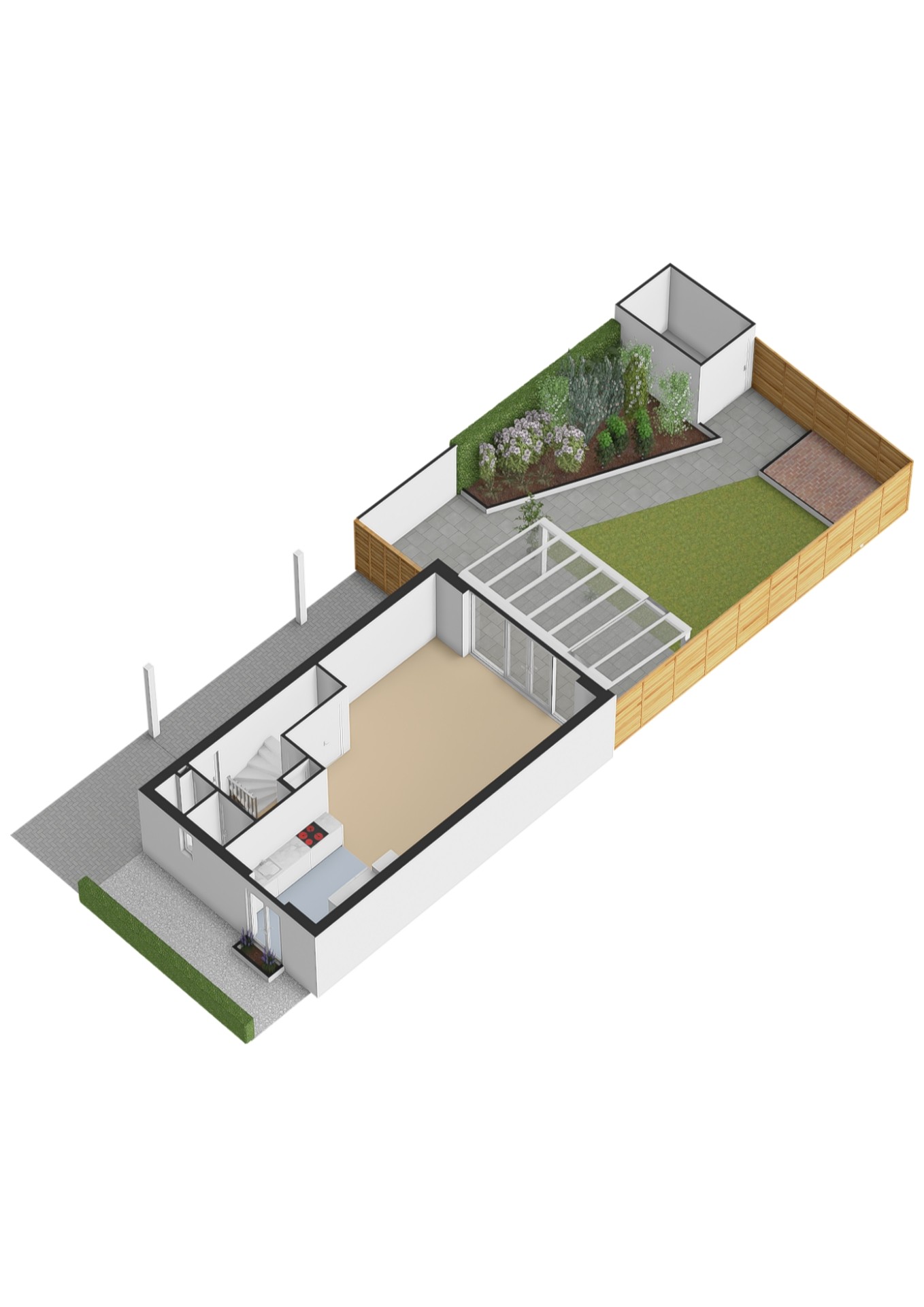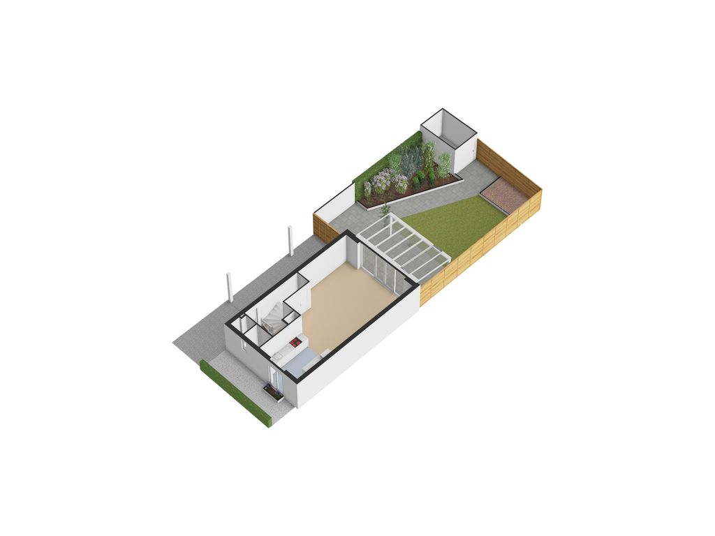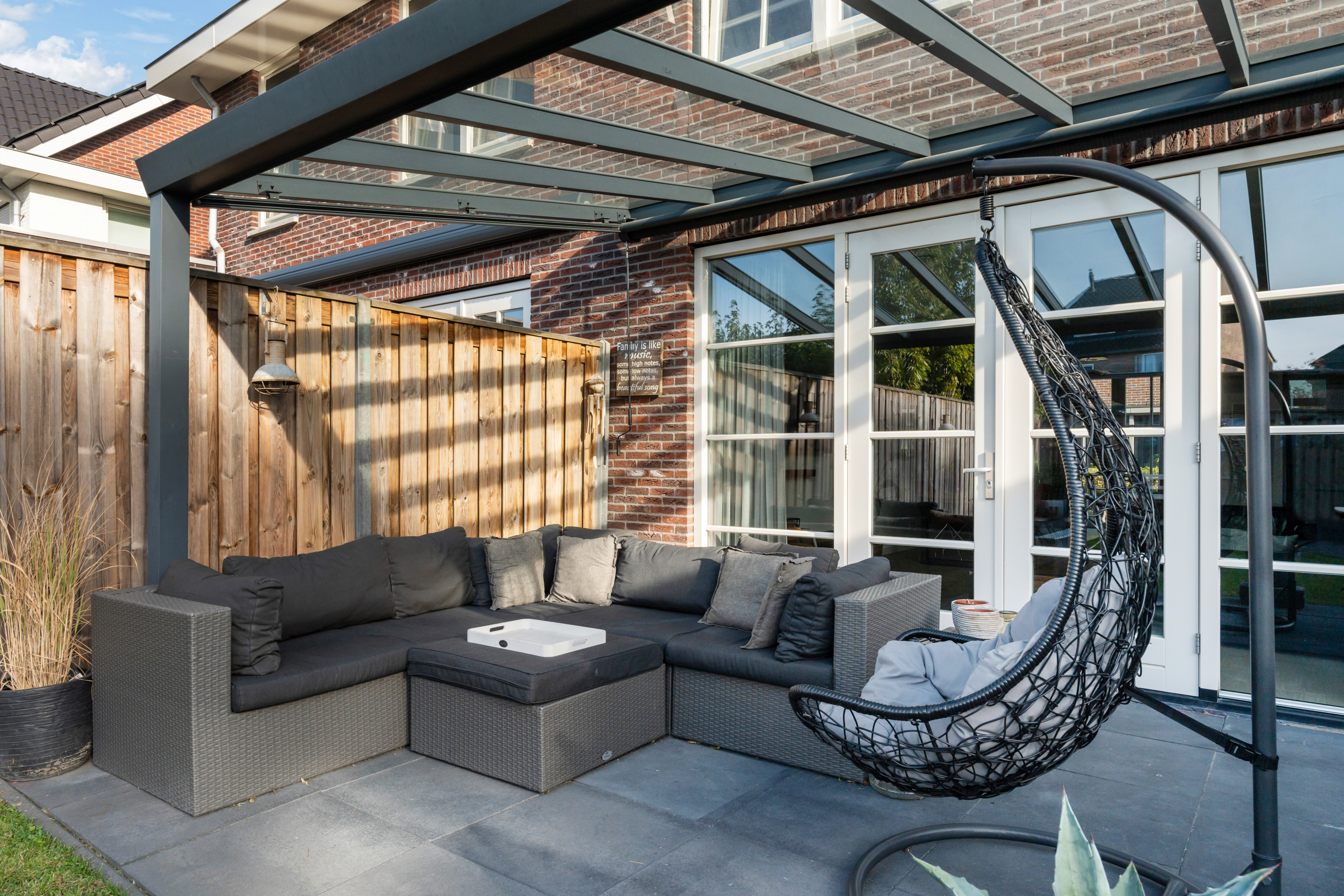 De achtertuin is gelegen op het zuiden, heeft veel privacy en is circa 12 meter diep en circa 9 meter breed. Is geheel omheind en grotendeels voorzien van straatwerk. Vaste planten en een stukje gras. Achter in de tuin staat tevens een houten berging welke is voorzien van elektra. Aan de achtergevel van de woning is een overkapping geplaatst welke is voorzien van zonwering en verlichting. Via een afgesloten poort aan de zijkant van de woning, kom je in de carport en parkeermogelijkheden voor 2 auto’s naast de woning. De voortuin is onderhoudsvriendelijk gemaakt met een beukhaag en siergrind.