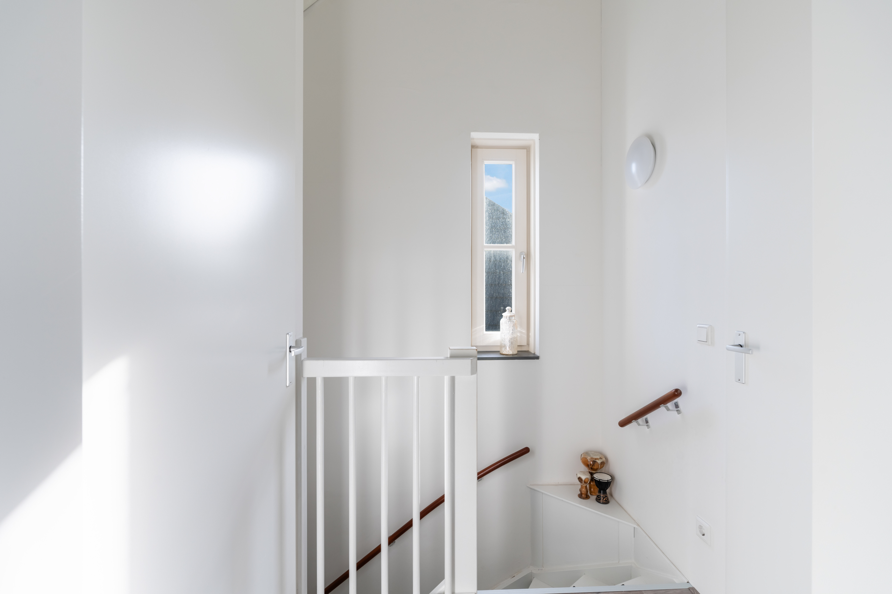 Trappenhuis is voorzien van strak stucwerk wanden, overloop met vaste, open trapopgang naar de 2e verdieping en een extra zijraam voor een prettige lichtinval.
