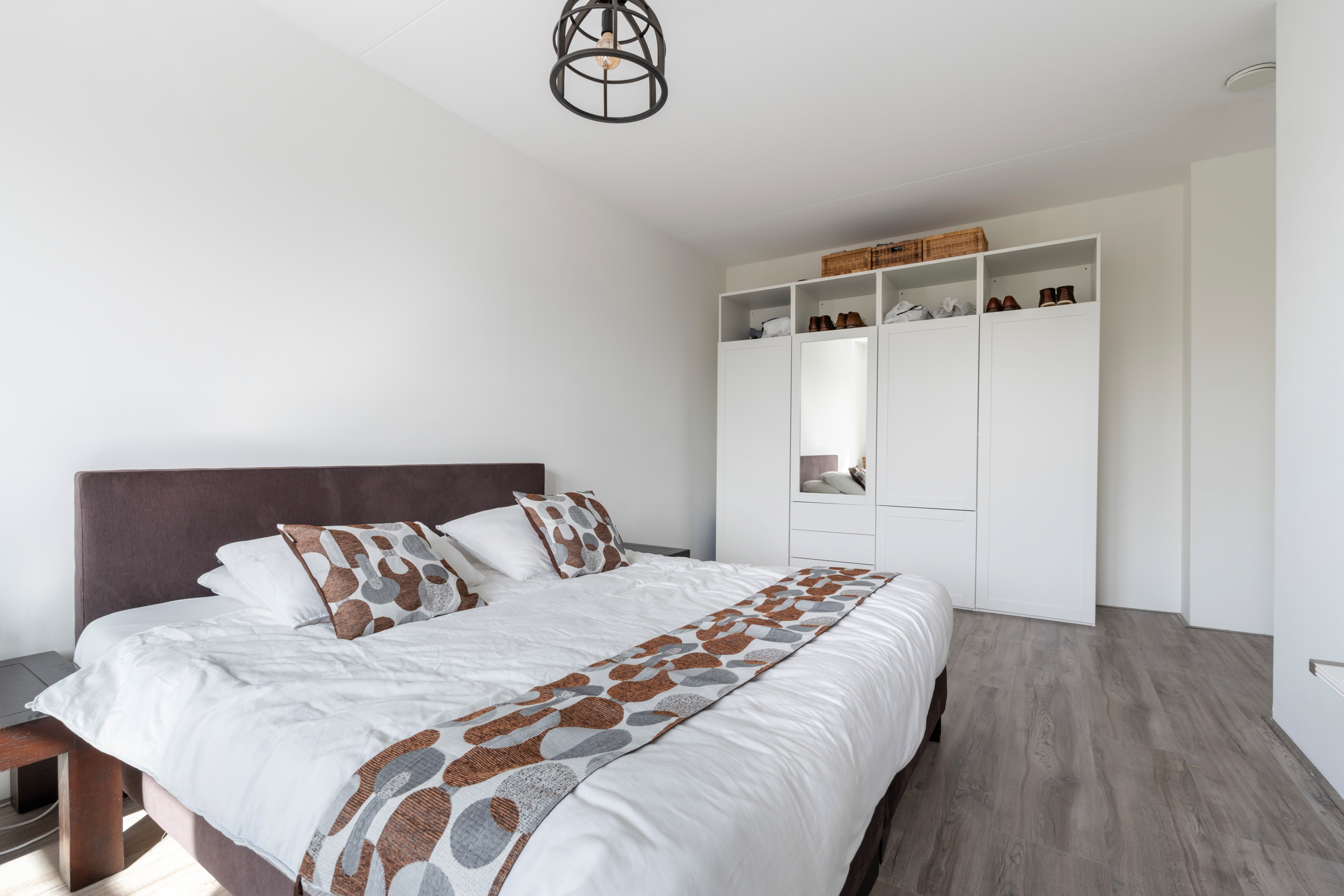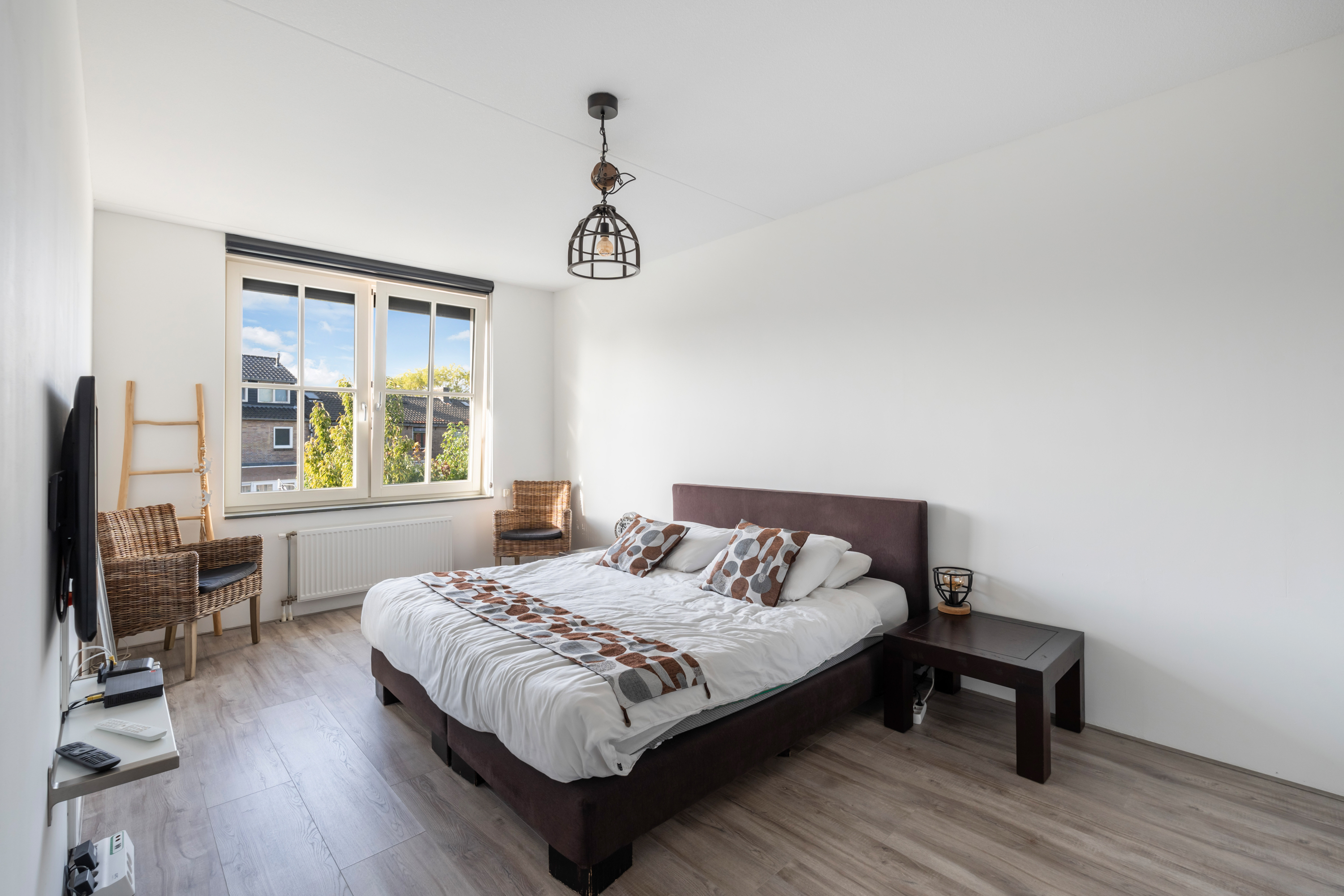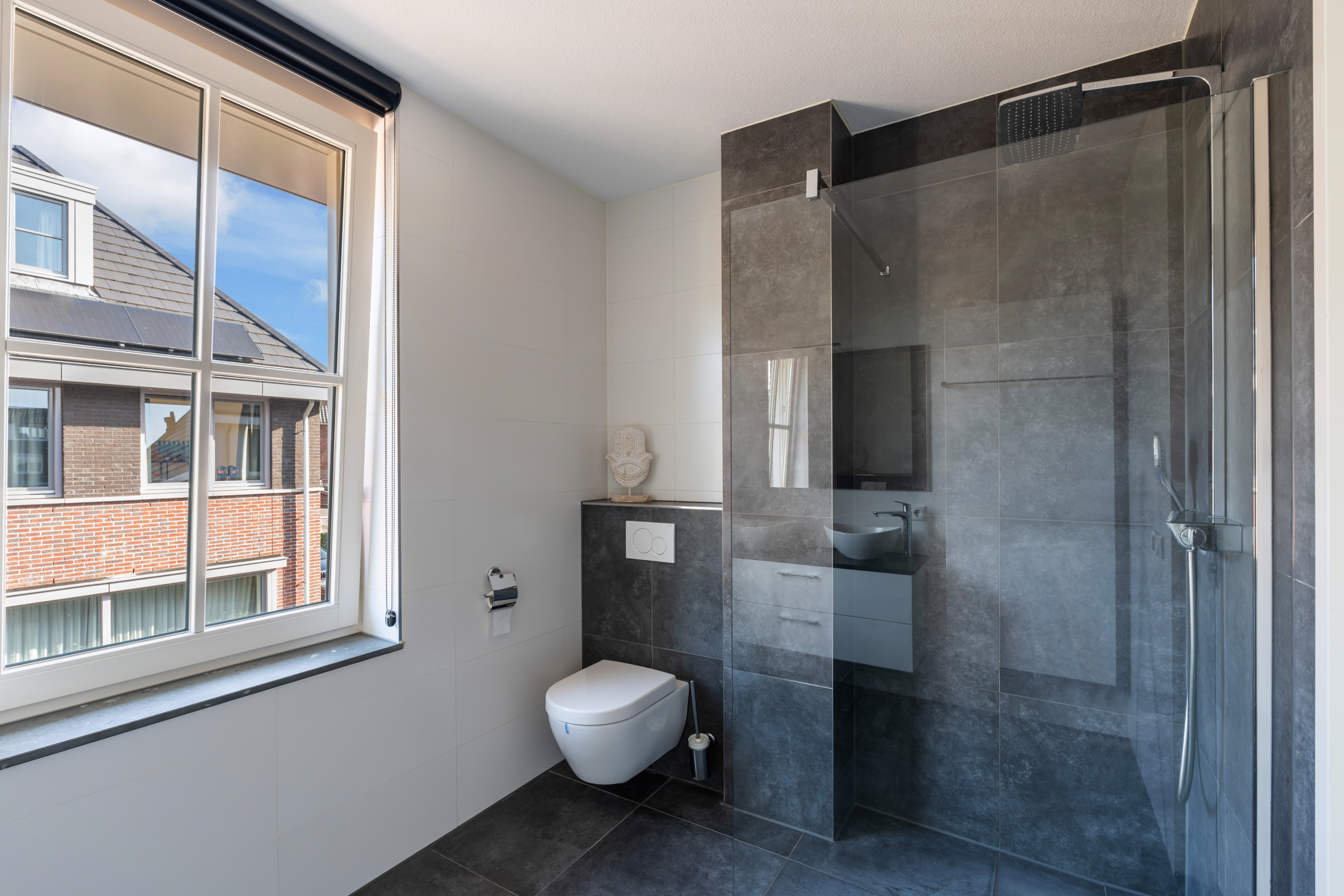 Slaapkamer 1, gelegen aan de achterzijde (10 m²). Slaapkamer 2, de masterbedroom gelegen aan de achterzijde van circa (21 m²). Slaapkamer 3, gelegen aan de voorzijde (13 m²). De slaapkamers aan de achterzijde zijn beiden voorzien van een elektrische rolluik. De overloop en slaapkamers zijn allen voorzien van een fraaie laminaatvloer en allemaal voorzien van stucwerk wanden en plafonds. De luxe geheel betegelde badkamer is gelegen aan de voorzijde van de woning (lichtinval middels te openen raam), voorzien van royale inloopdouche met regendouche, 2e toilet, wastafelmeubel met dubbele waskom en een design radiator.