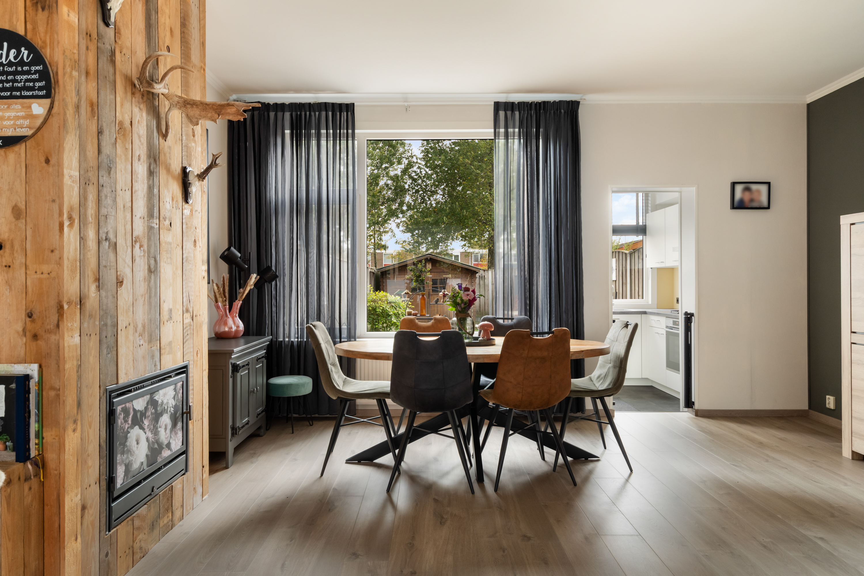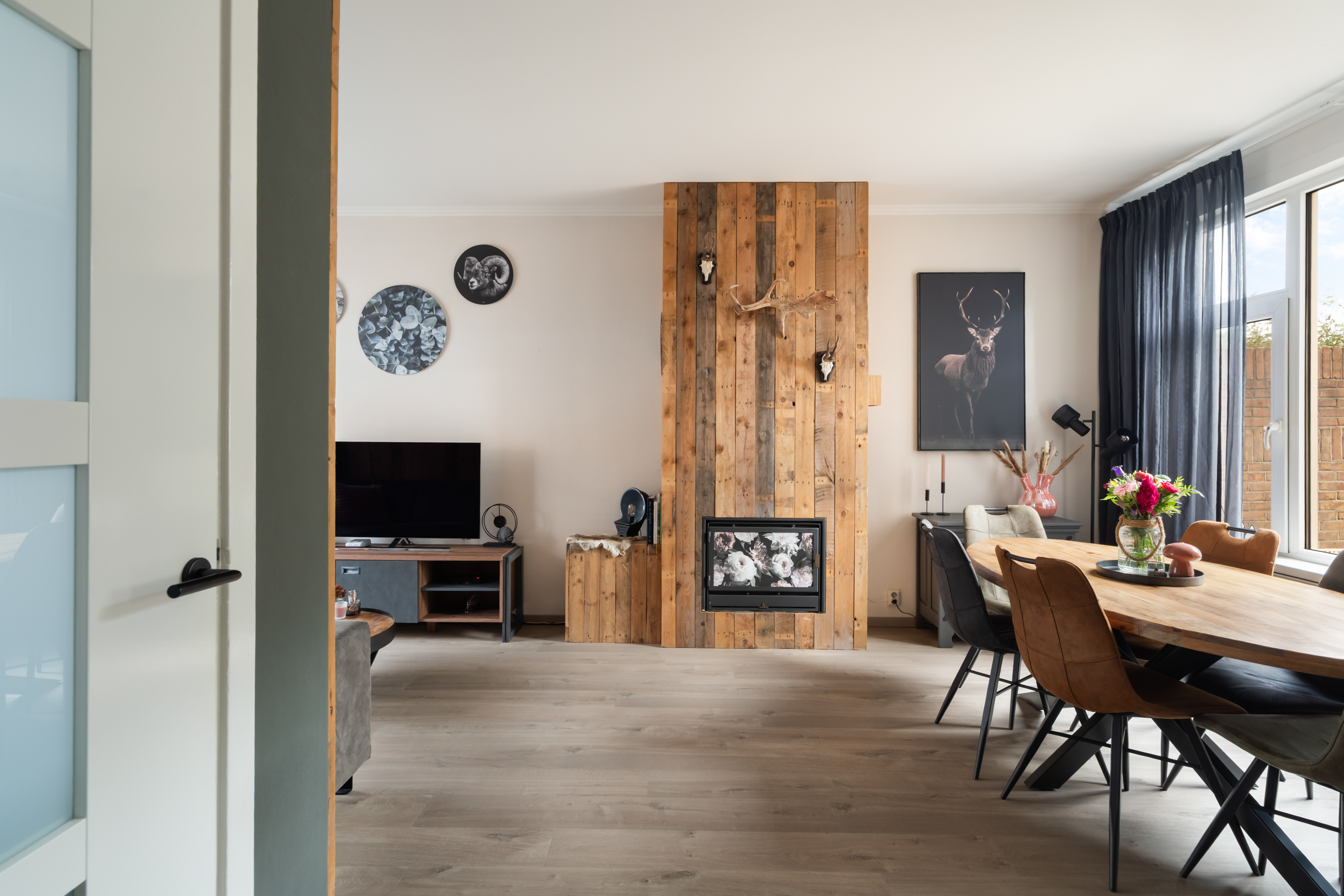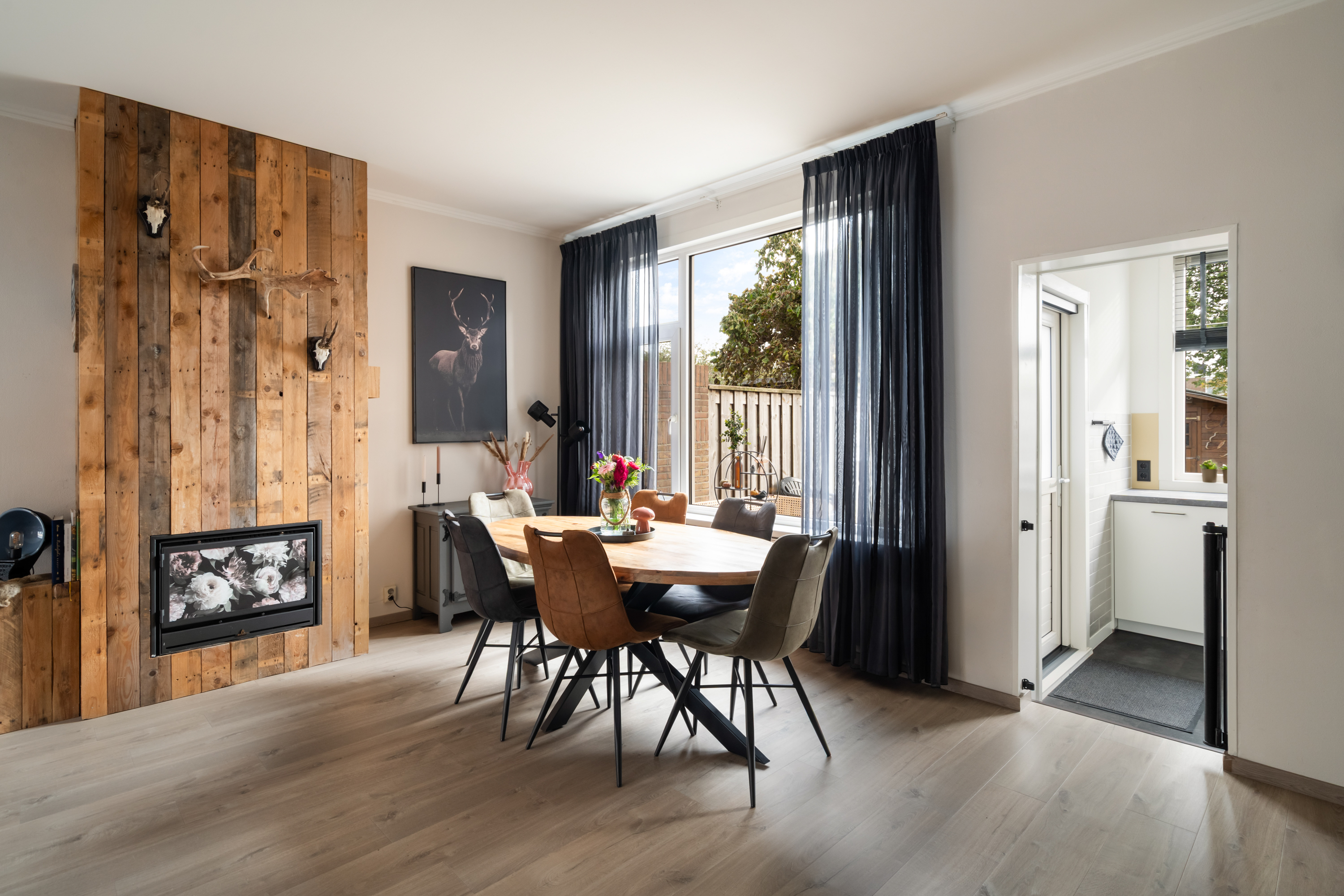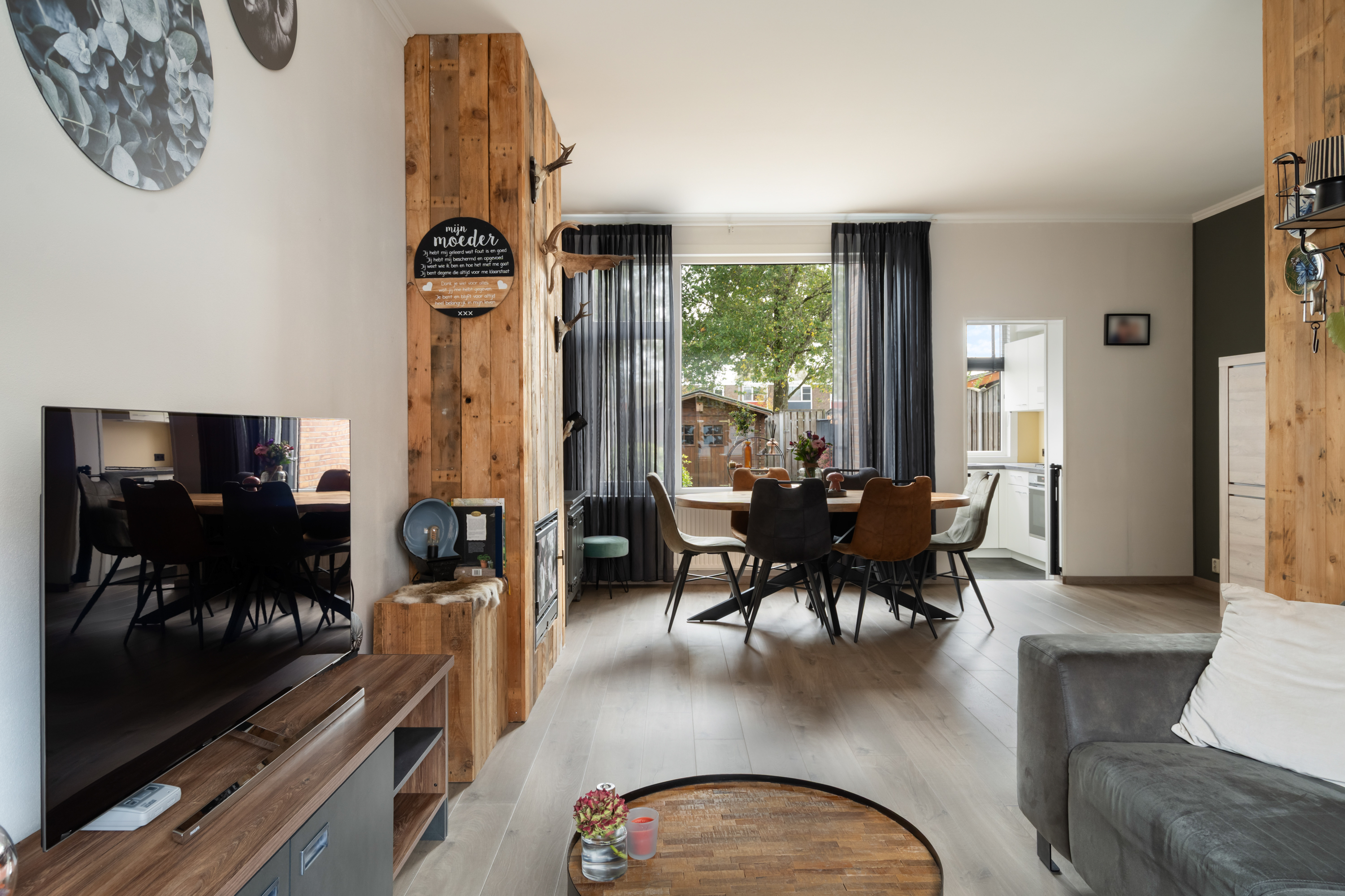 Entree gang waarin een keurig tot halfhoog betegeld toilet, in 2022 fraai gestoffeerde trap naar de 1e verdieping en deur met glas naar de sfeervolle woonkamer. De woonkamer is deels voorzien van steigerdelen wandafwerking, gezellige houtkachel, stucwerkplafond en een ruime trap-/bergkast met daarin de elektrische installatie. Aansluitend de luxe nieuwe keuken (2022) in hoekopstelling, welke is voorzien van o.a. een inductiekookplaat, afzuigkap, koelkast, vaatwasmachine, hetelucht oven en een hoek-carrouselkast. De apparatuur is allemaal van het merk “Bosch”. Deur naar de achtertuin. De gehele begane grond is voorzien van een fraaie laminaatvloer (bj. 2023).