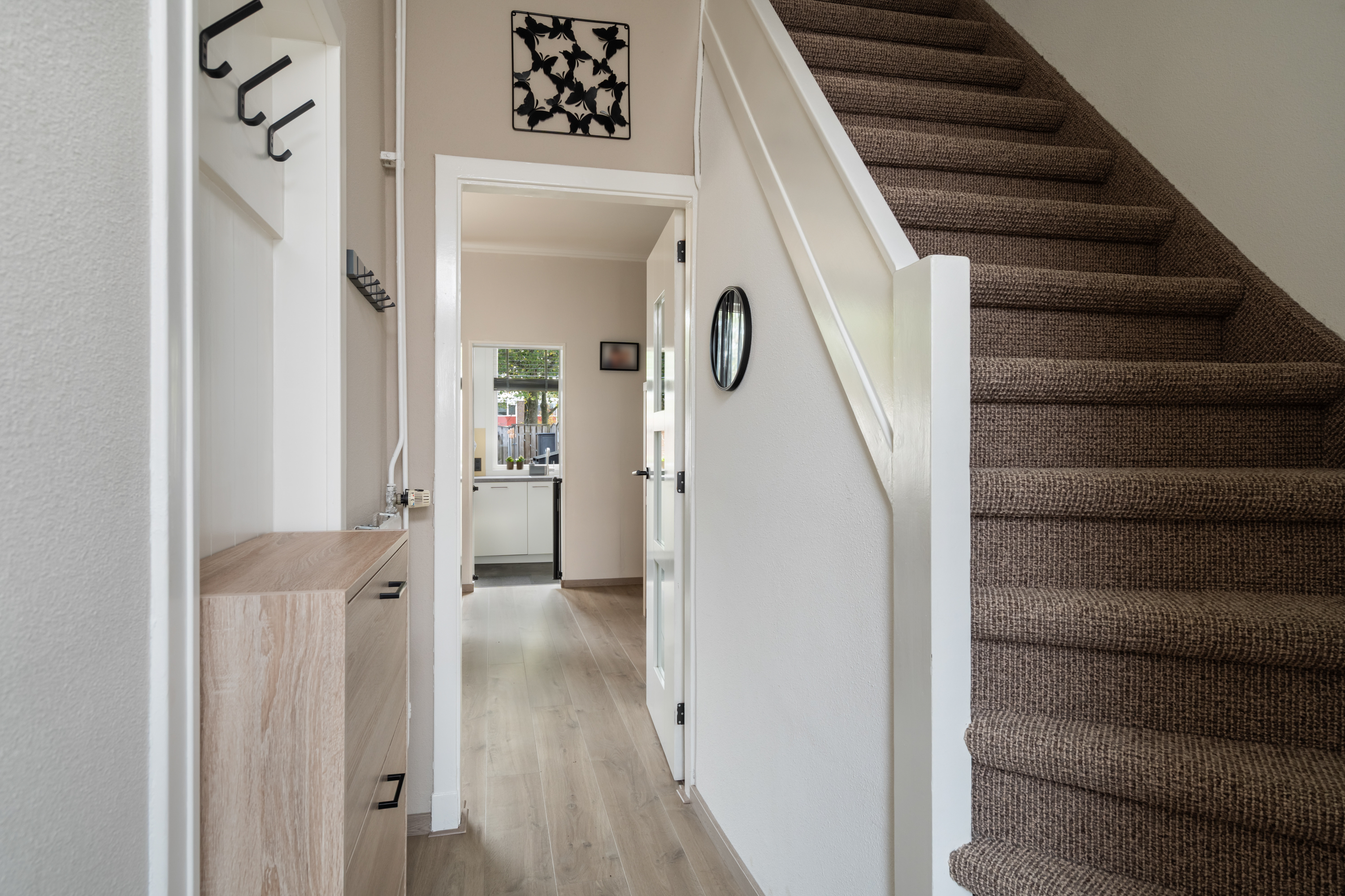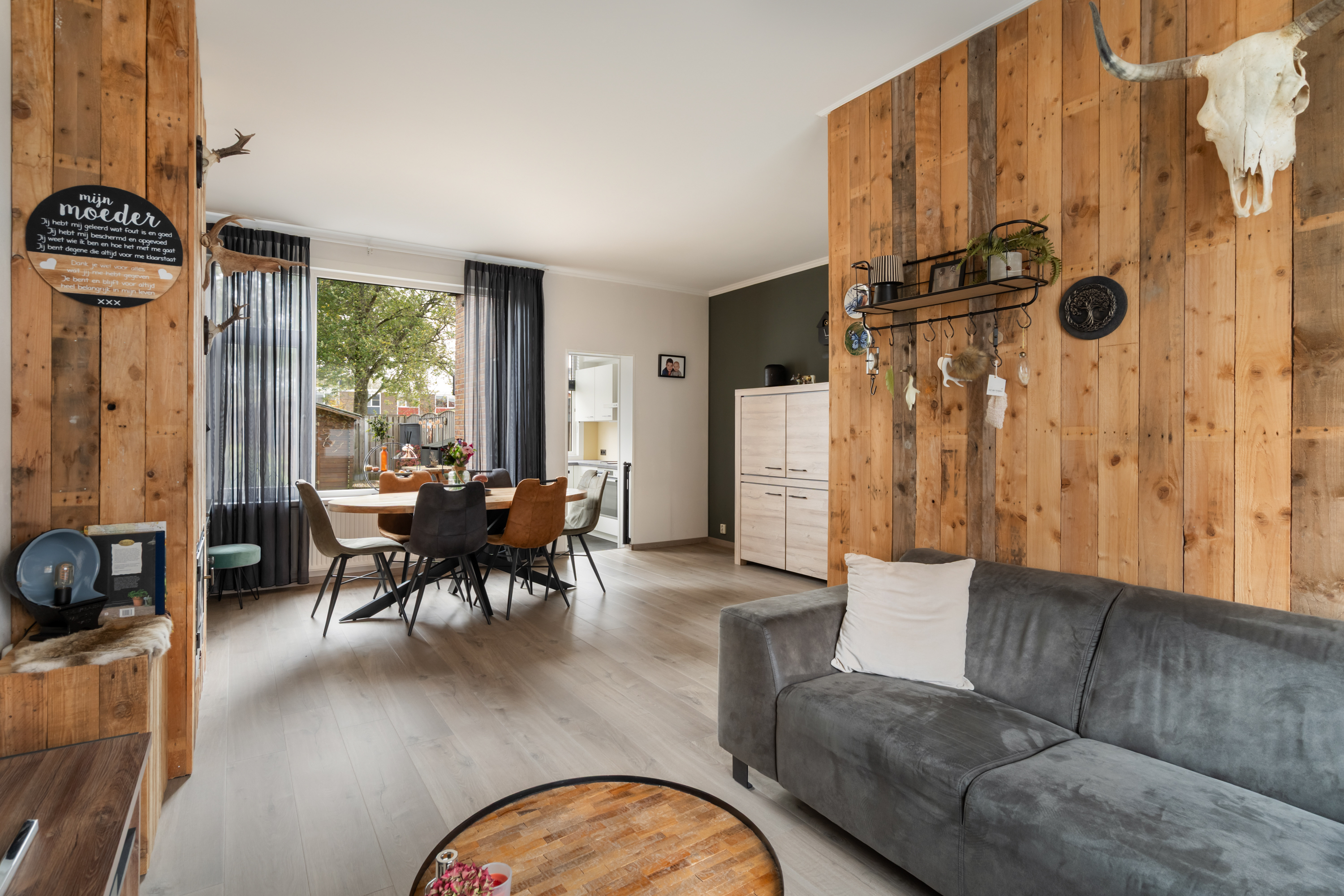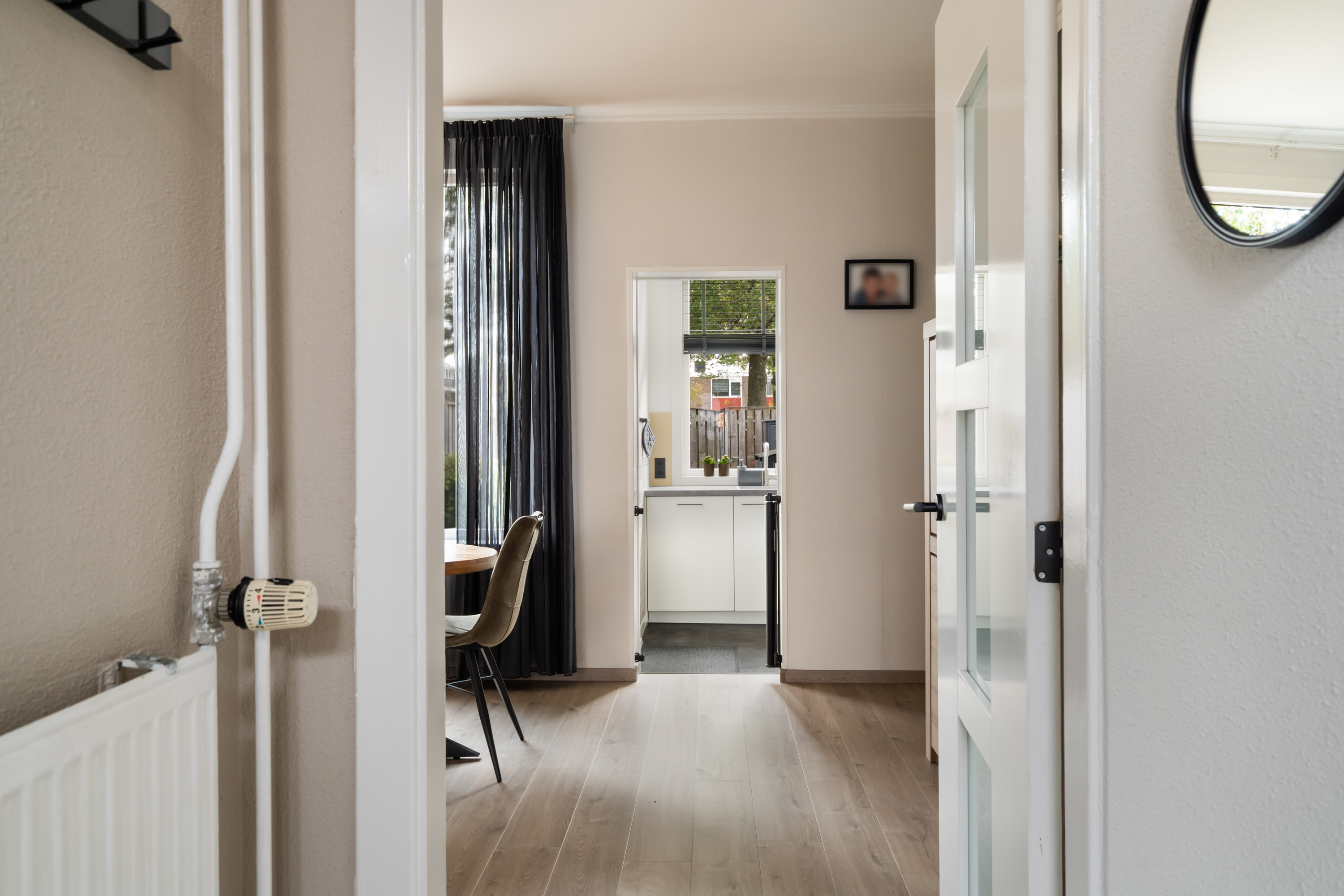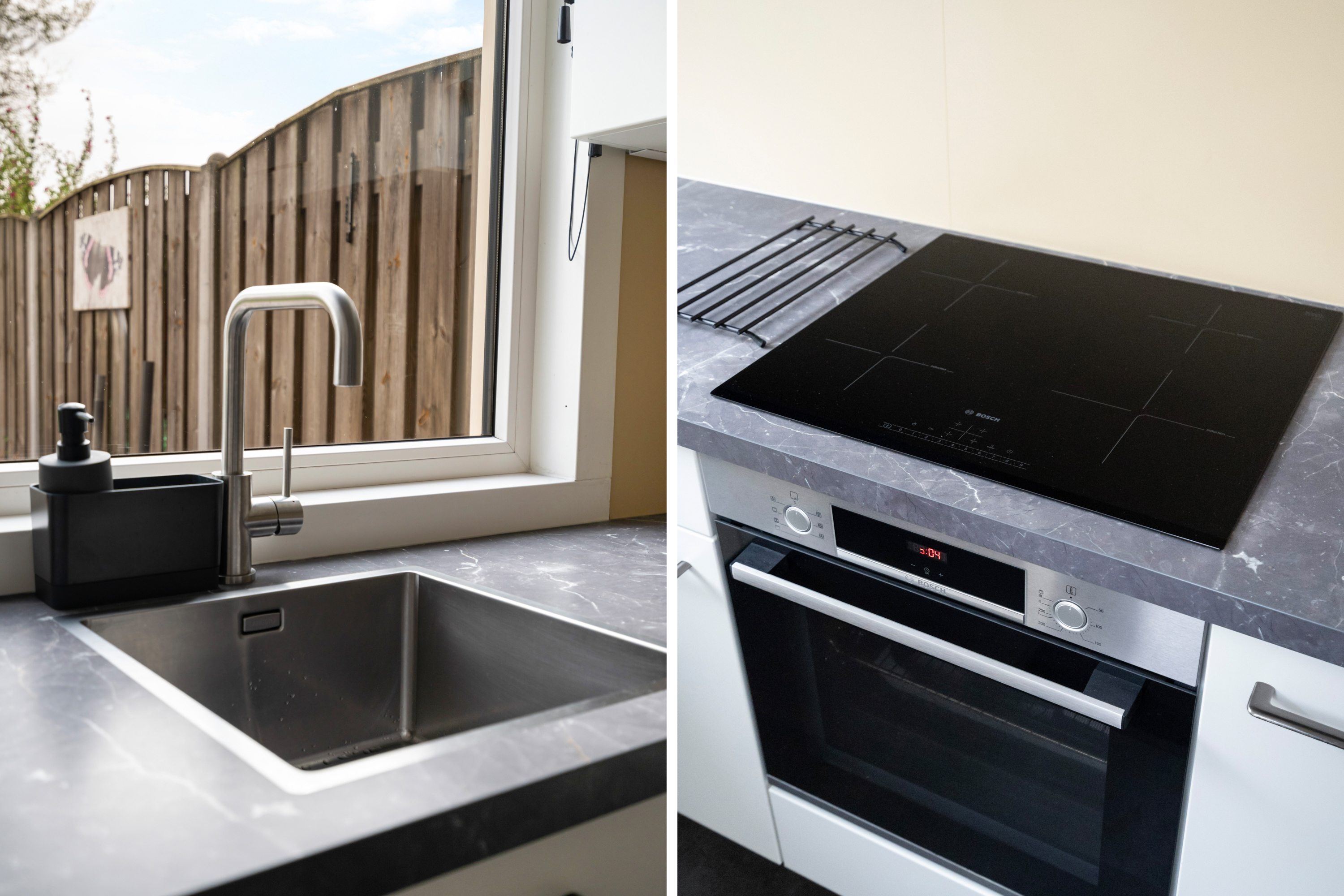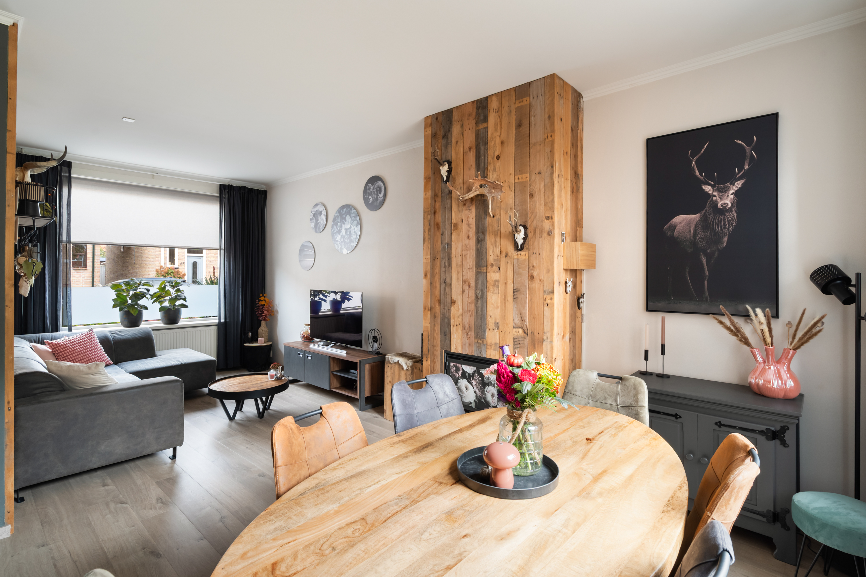 Entree gang waarin een keurig tot halfhoog betegeld toilet, in 2022 fraai gestoffeerde trap naar de 1e verdieping en deur met glas naar de sfeervolle woonkamer. De woonkamer is deels voorzien van steigerdelen wandafwerking, gezellige houtkachel, stucwerkplafond en een ruime trap-/bergkast met daarin de elektrische installatie. Aansluitend de luxe nieuwe keuken (2022) in hoekopstelling, welke is voorzien van o.a. een inductiekookplaat, afzuigkap, koelkast, vaatwasmachine, hetelucht oven en een hoek-carrouselkast. De apparatuur is allemaal van het merk “Bosch”. Deur naar de achtertuin. De gehele begane grond is voorzien van een fraaie laminaatvloer (bj. 2023).