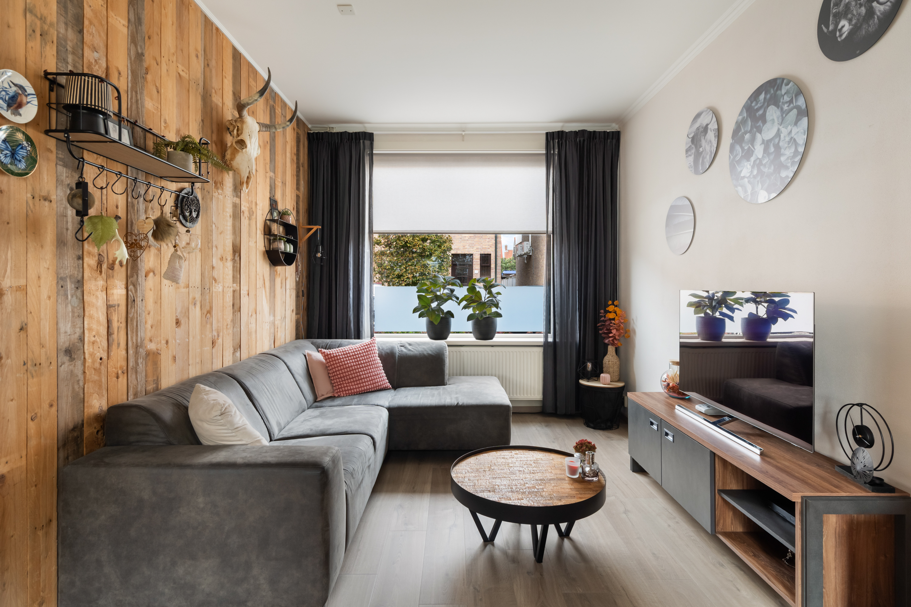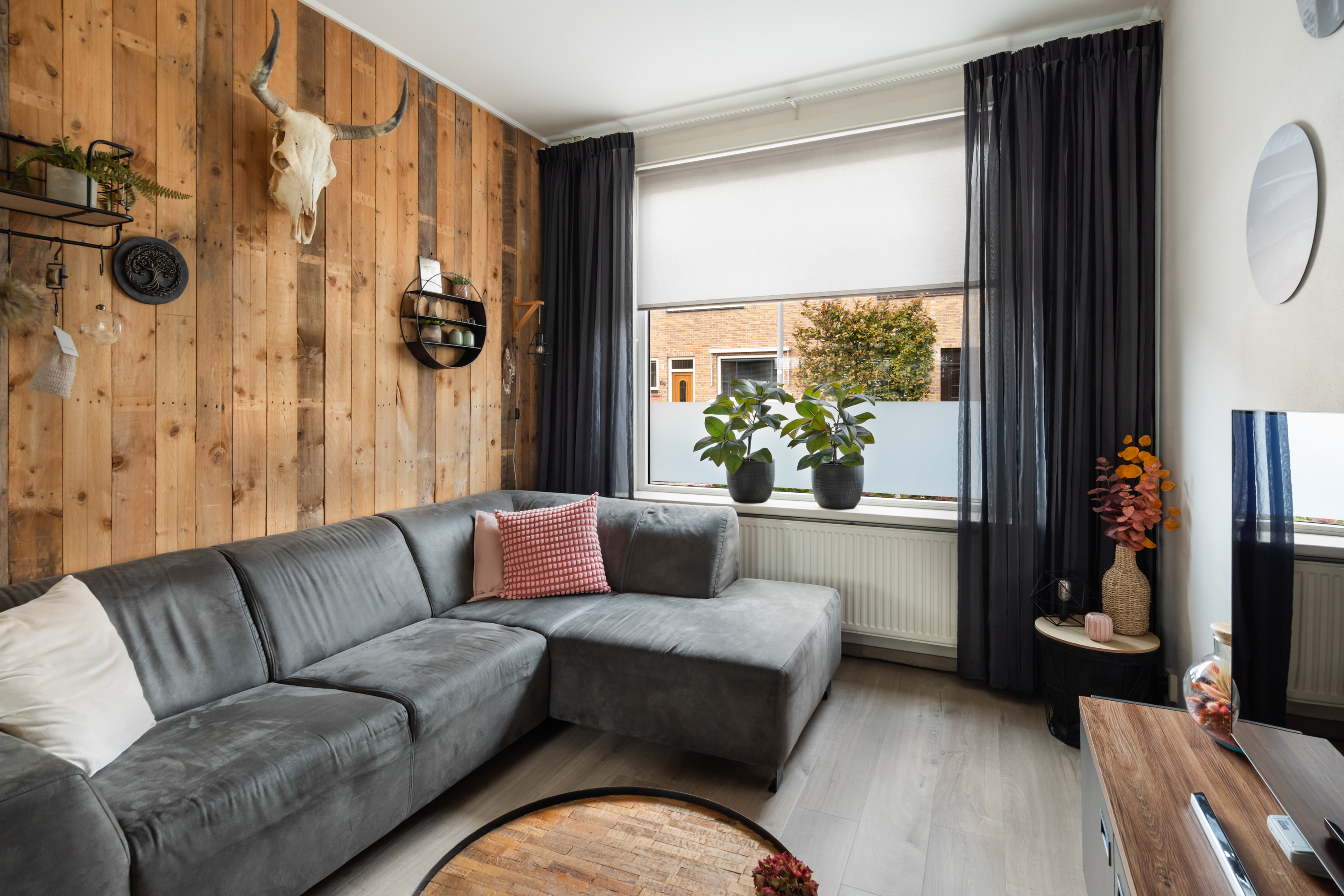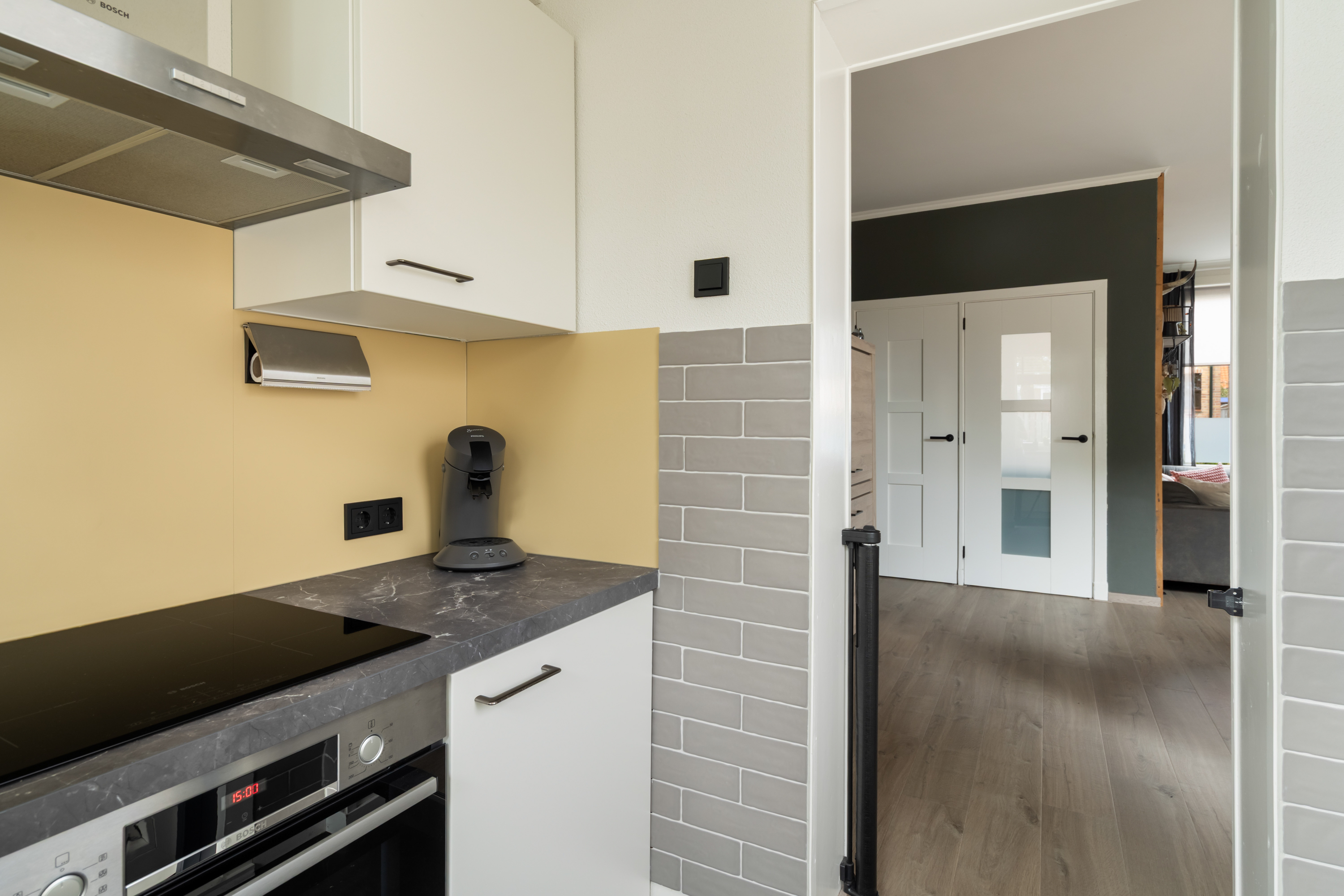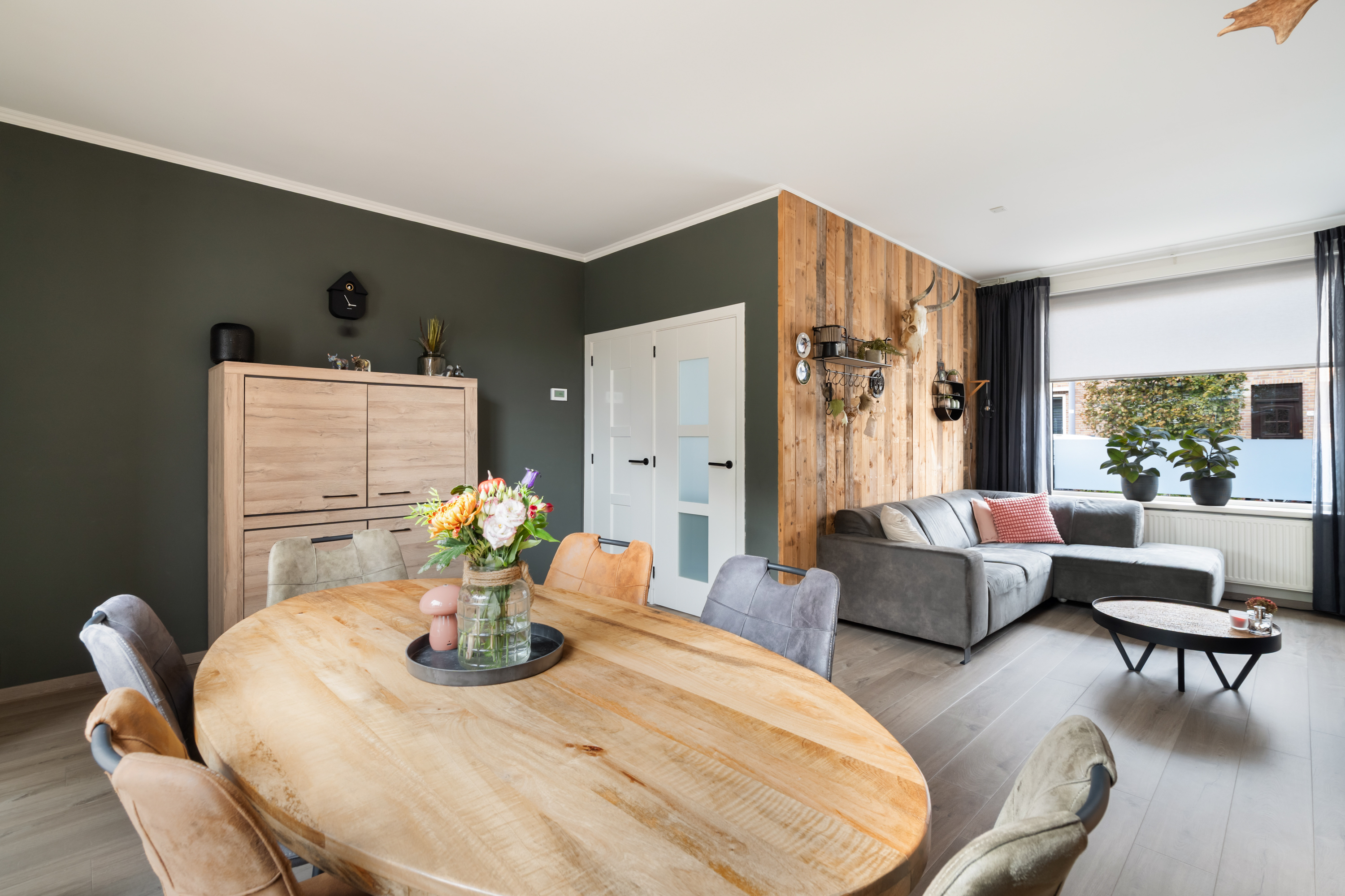 Entree gang waarin een keurig tot halfhoog betegeld toilet, in 2022 fraai gestoffeerde trap naar de 1e verdieping en deur met glas naar de sfeervolle woonkamer. De woonkamer is deels voorzien van steigerdelen wandafwerking, gezellige houtkachel, stucwerkplafond en een ruime trap-/bergkast met daarin de elektrische installatie. Aansluitend de luxe nieuwe keuken (2022) in hoekopstelling, welke is voorzien van o.a. een inductiekookplaat, afzuigkap, koelkast, vaatwasmachine, hetelucht oven en een hoek-carrouselkast. De apparatuur is allemaal van het merk “Bosch”. Deur naar de achtertuin. De gehele begane grond is voorzien van een fraaie laminaatvloer (bj. 2023).