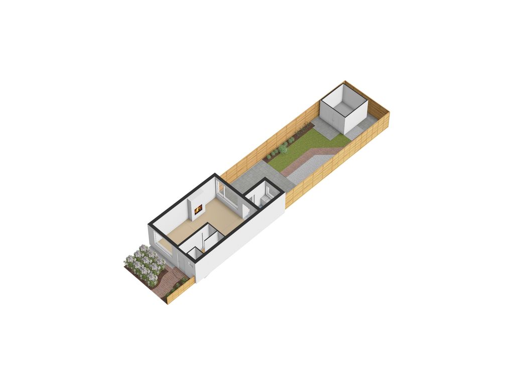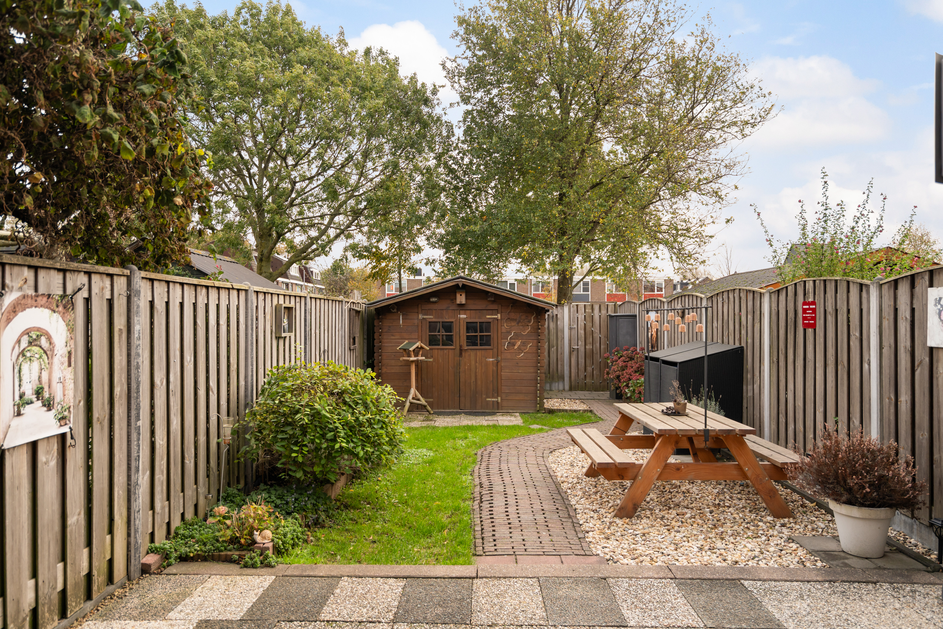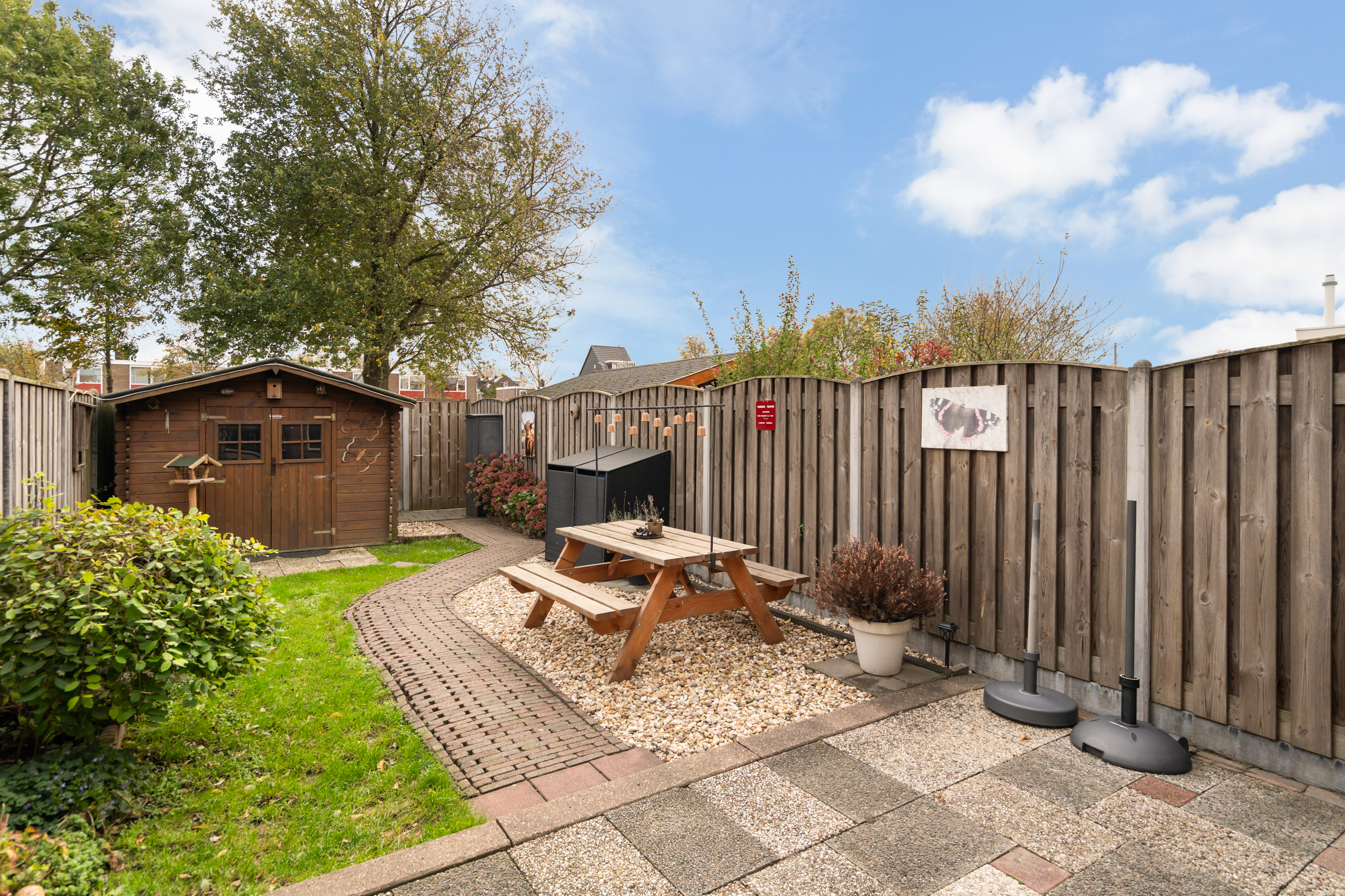 Achtertuin op het zuiden, circa 16 meter diep, deels bestraat, deels gras en grind, een houten blokhut en een achter uitgang.
