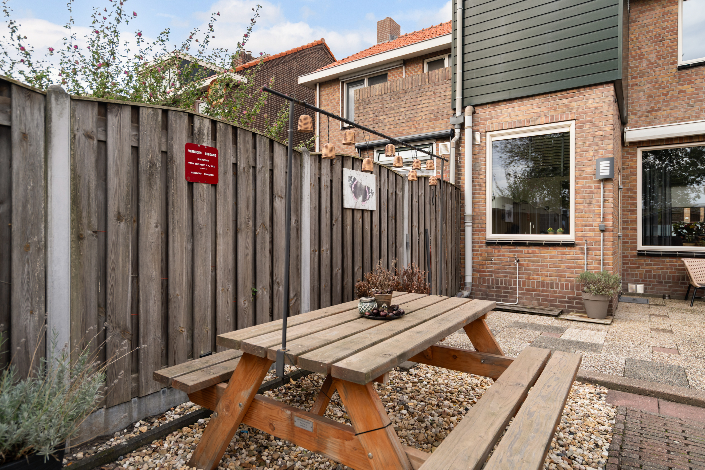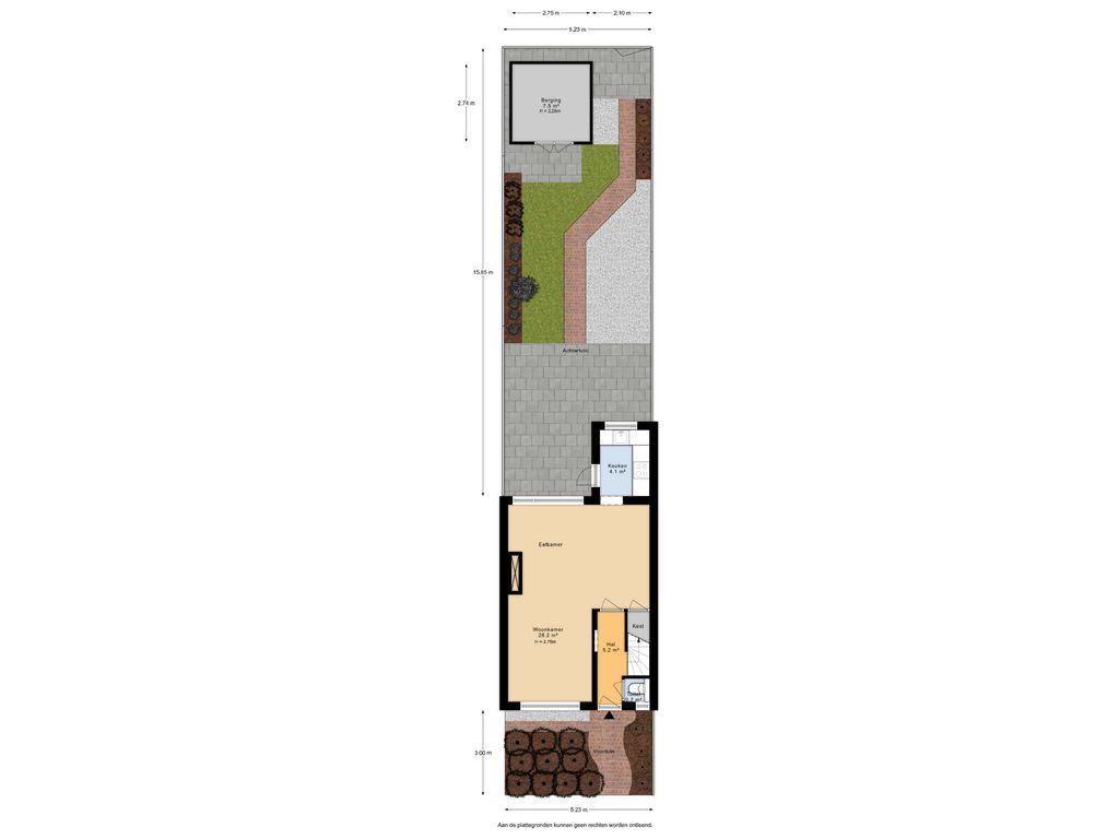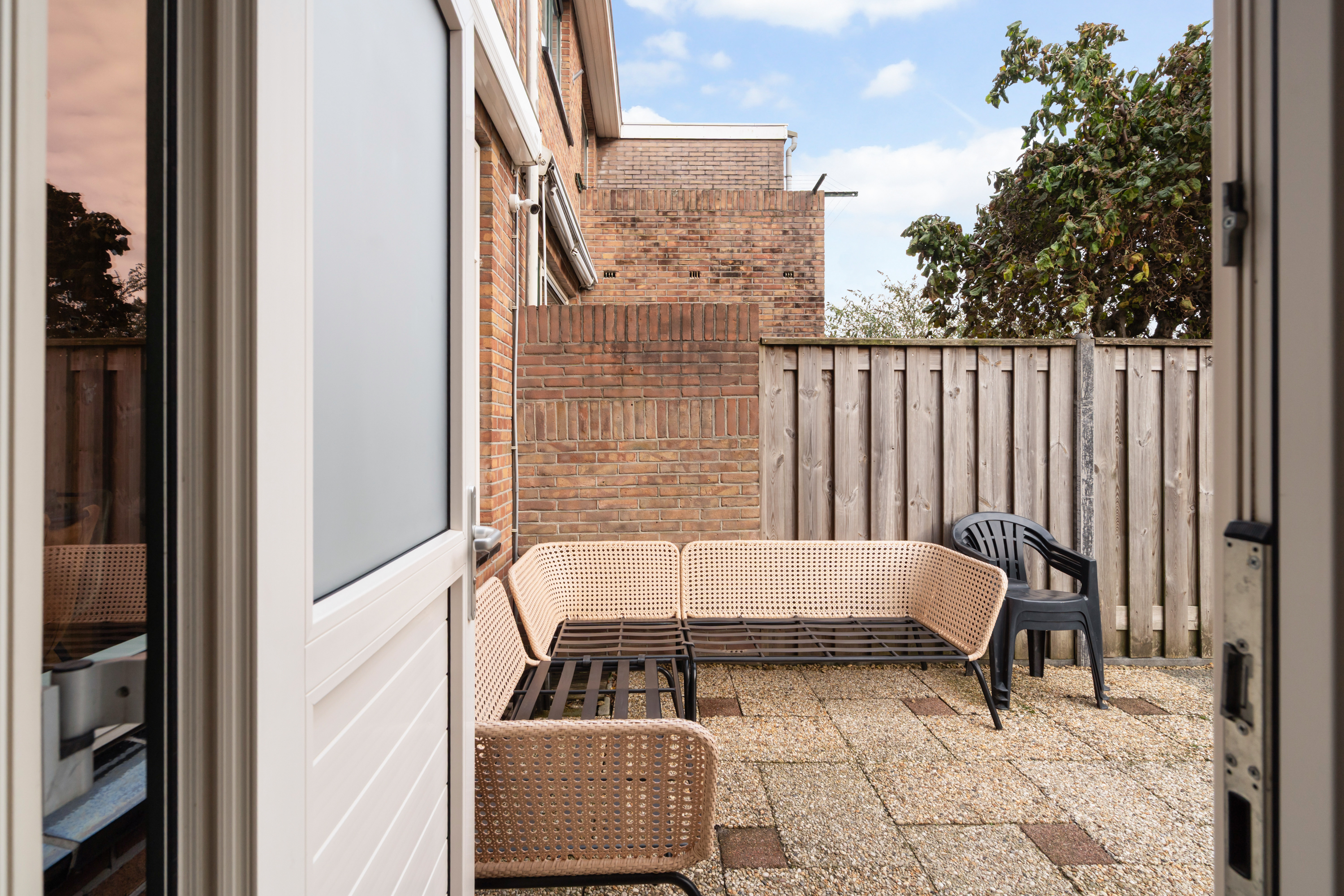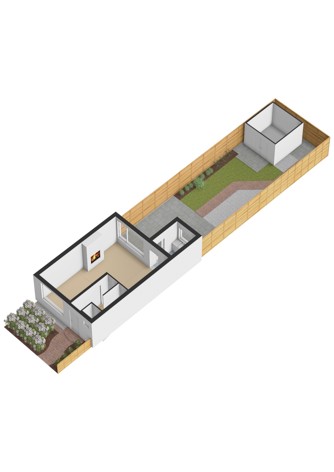 Achtertuin op het zuiden, circa 16 meter diep, deels bestraat, deels gras en grind, een houten blokhut en een achter uitgang.