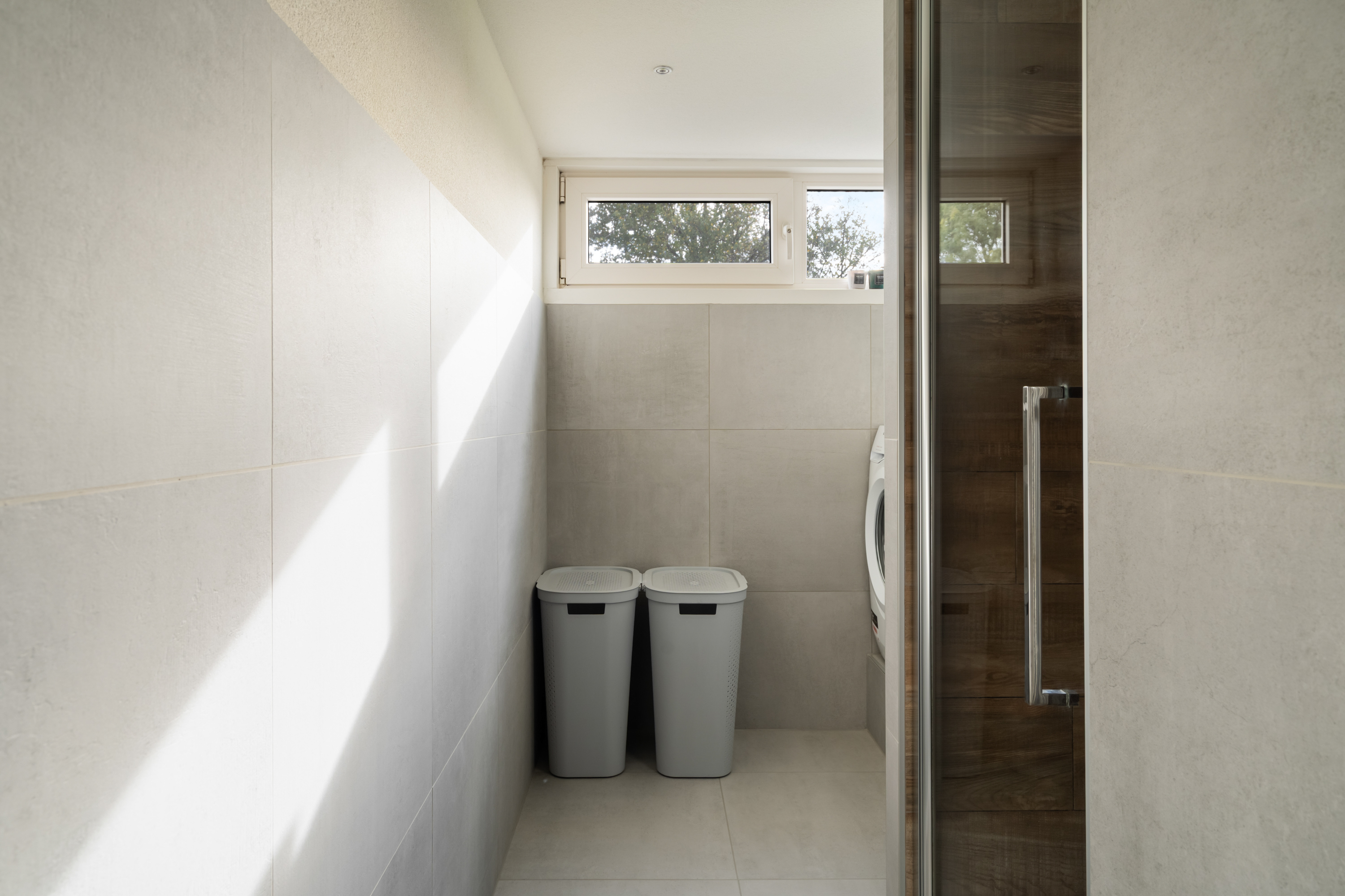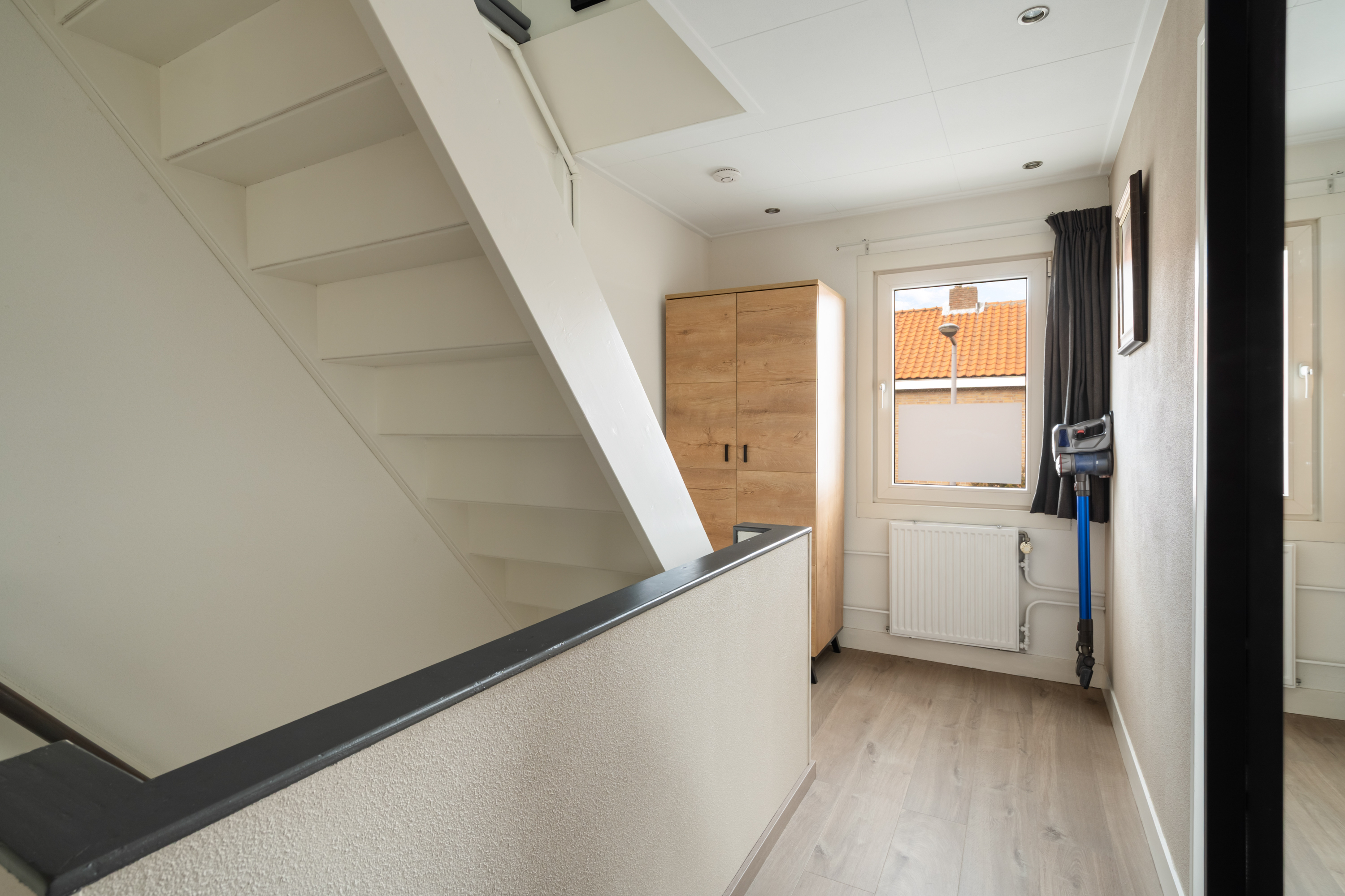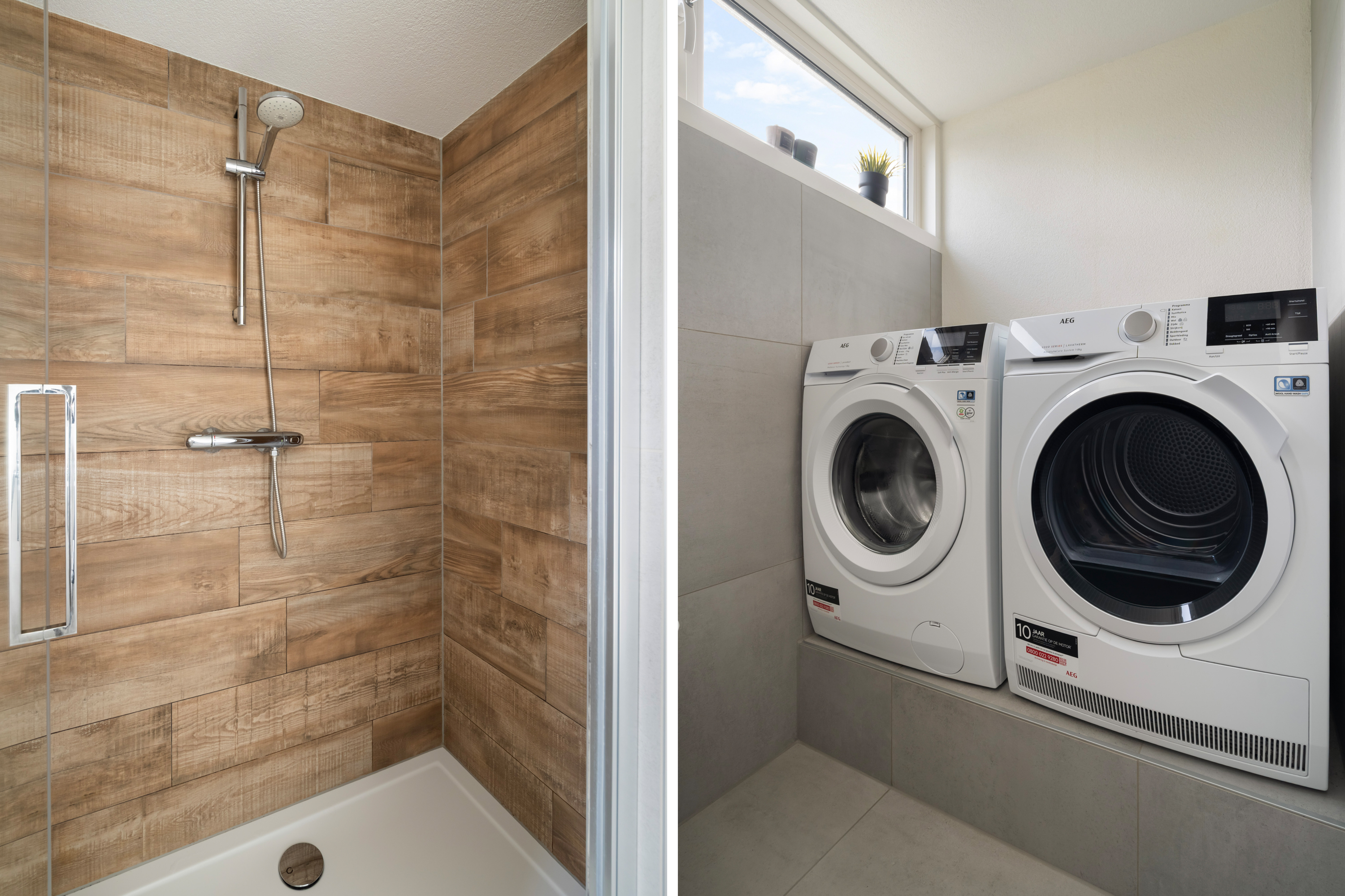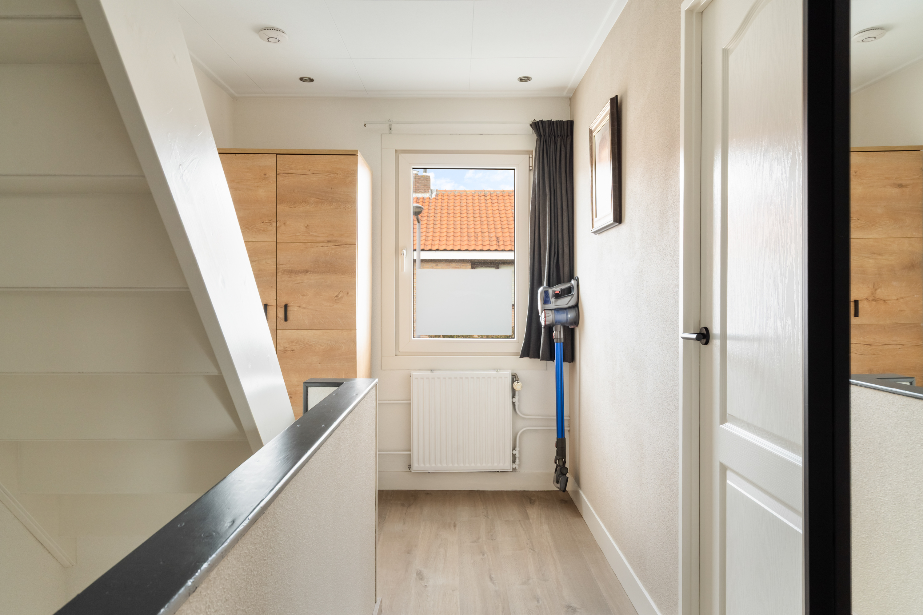 Overloop waarop vaste trap naar 2e verdieping, diverse bergruimte. 1e slaapkamer gelegen aan de voorzijde van de woning (2.84 x 2.64) voorzien van een vinylvloer. 2e slaapkamer gelegen aan de achterzijde van de woning (4.34 x 2.84) voorzien van een vinylvloer. De geheel betegelde luxe royale badkamer (5.47 x 1.86) uit 2019 is voorzien van een douchecabine, een dubbele wastafel met meubel, een toilet en een wasmachine-/drogeraansluiting.