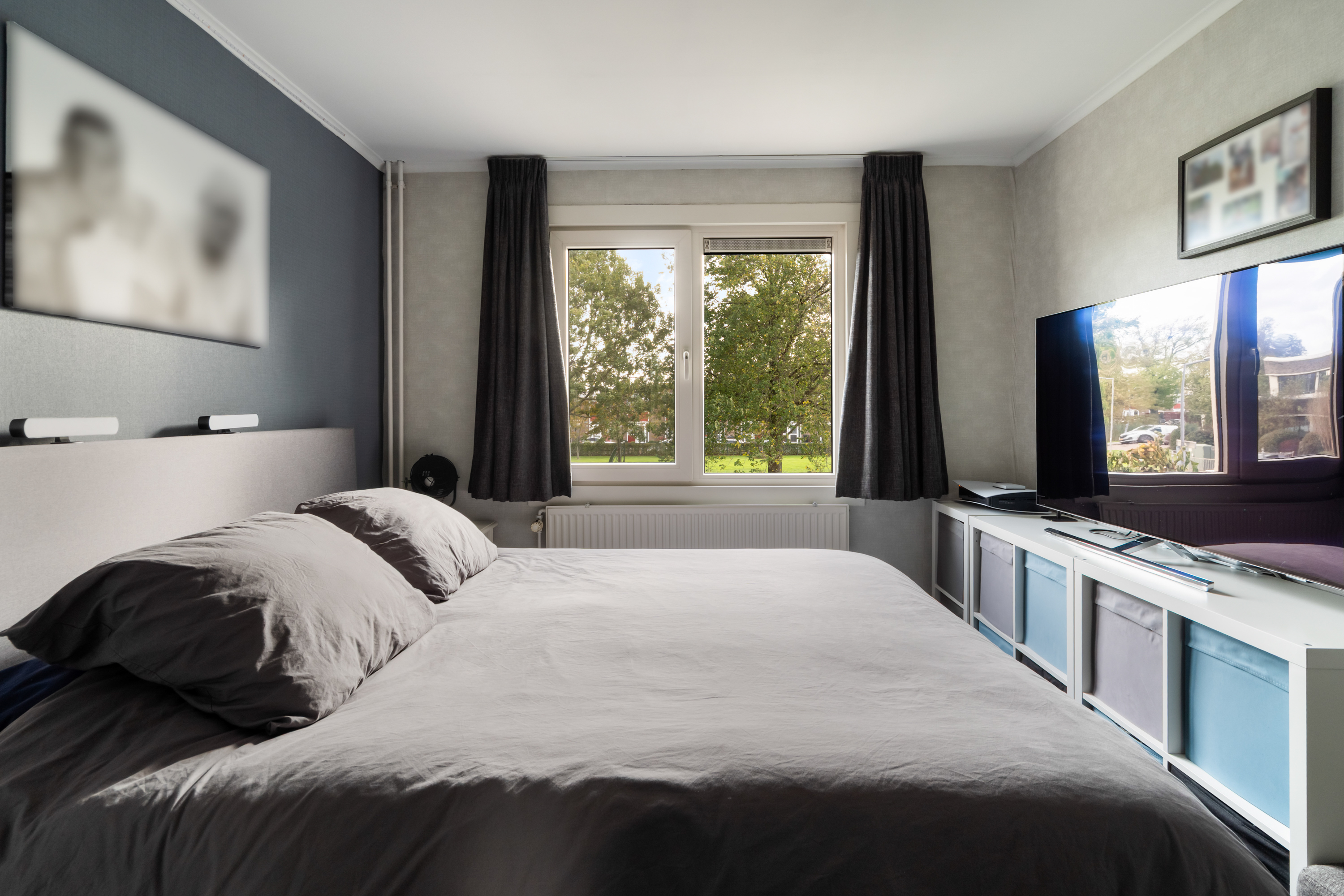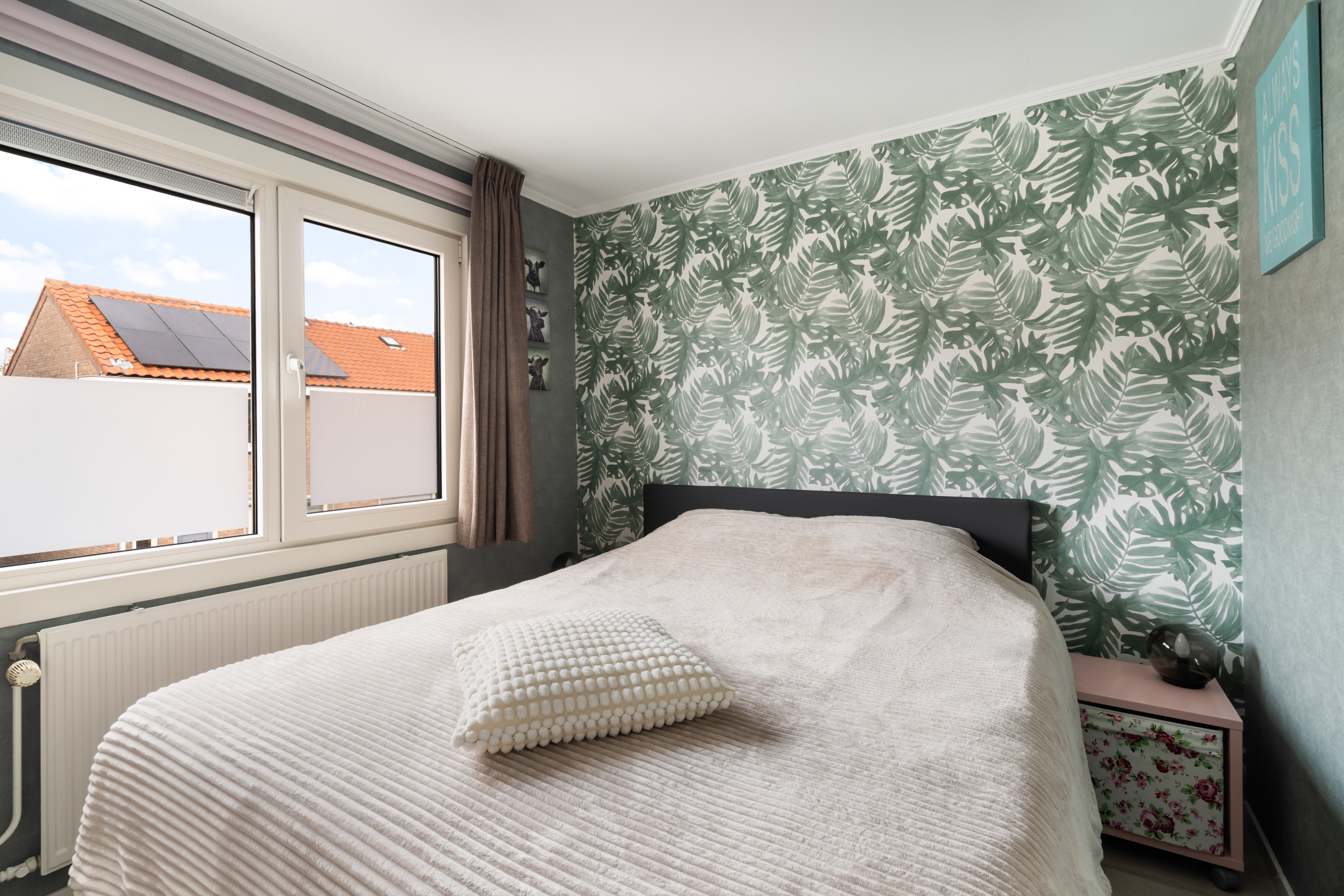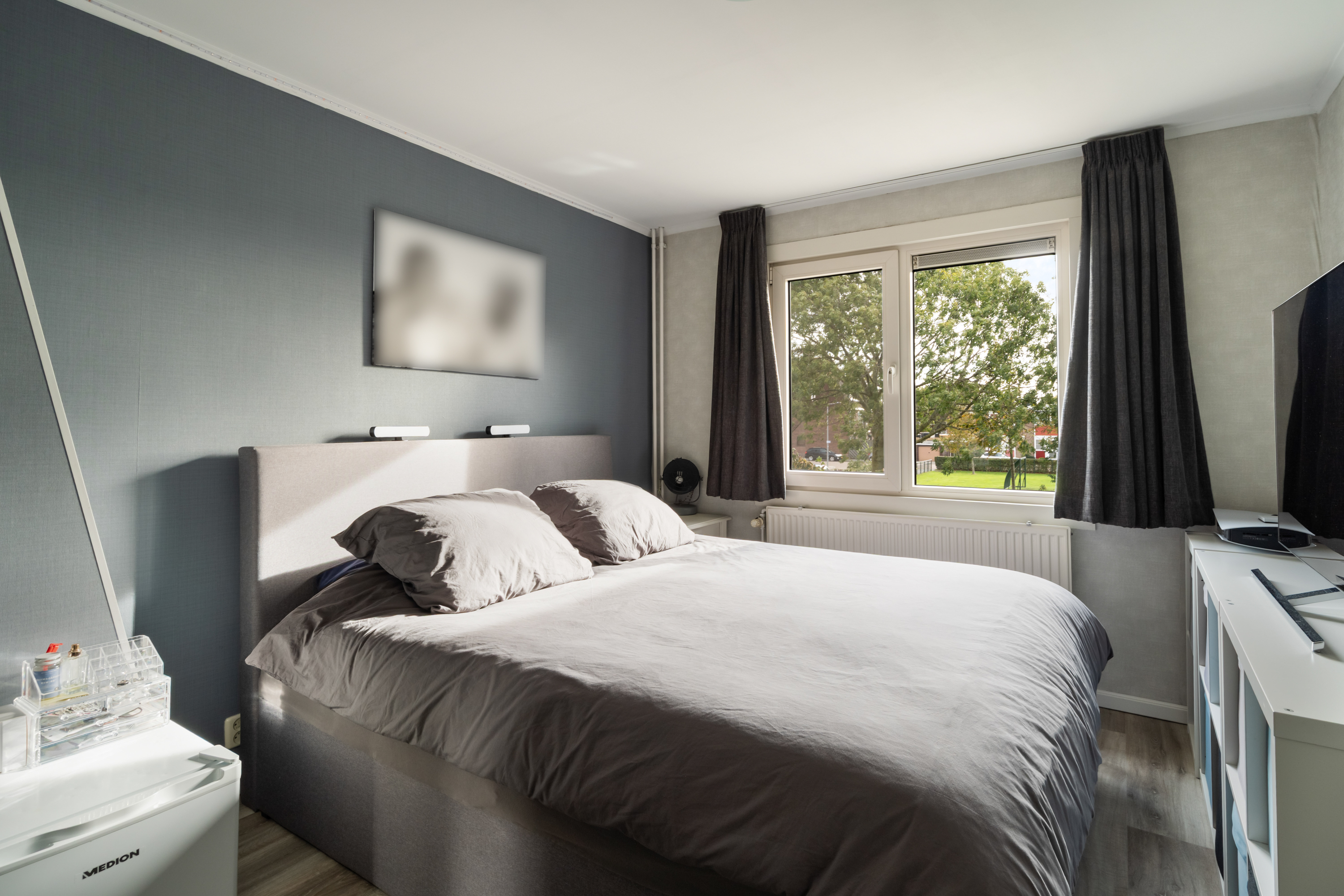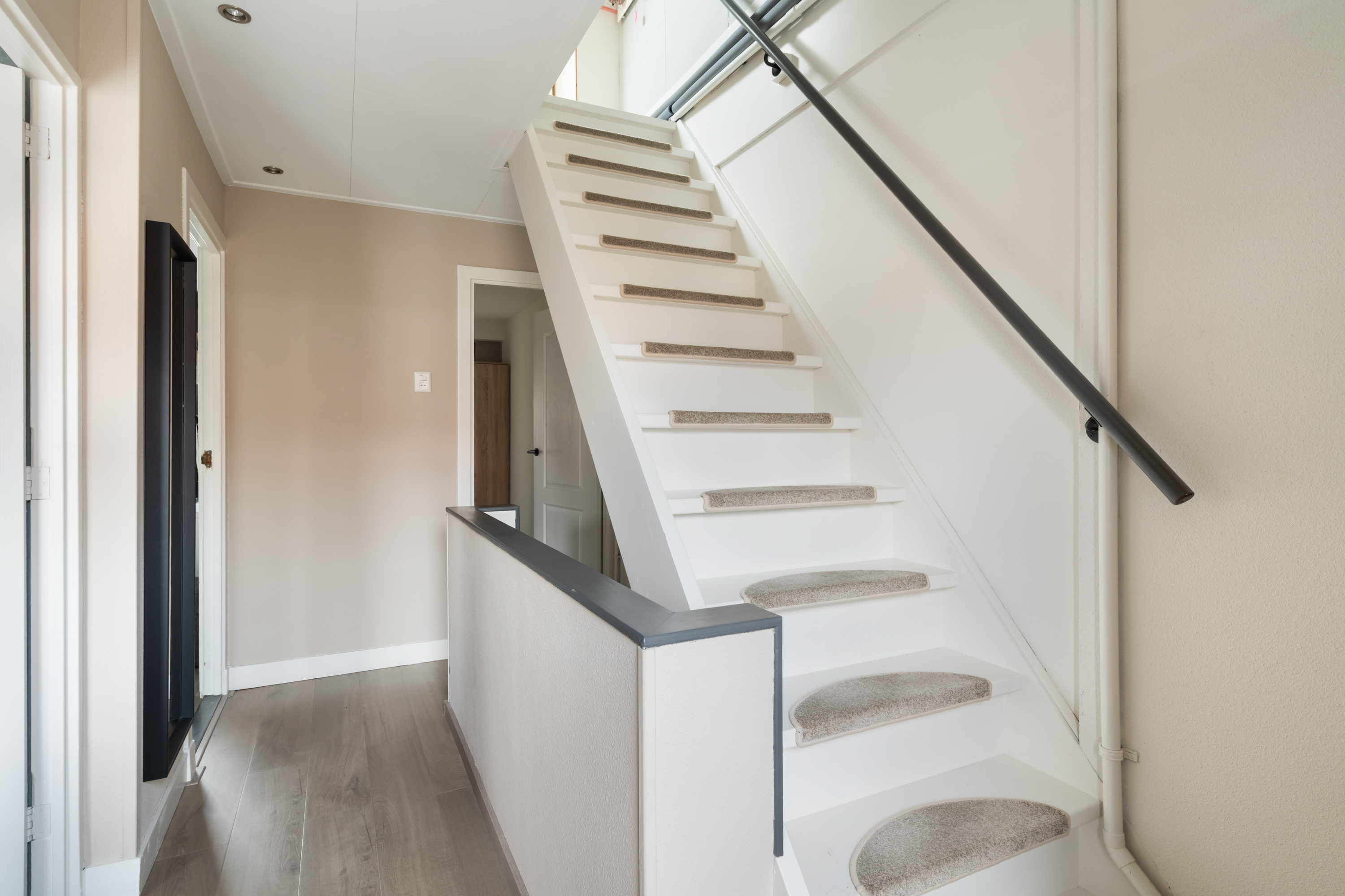 Overloop waarop vaste trap naar 2e verdieping, diverse bergruimte. 1e slaapkamer gelegen aan de voorzijde van de woning (2.84 x 2.64) voorzien van een vinylvloer. 2e slaapkamer gelegen aan de achterzijde van de woning (4.34 x 2.84) voorzien van een vinylvloer. De geheel betegelde luxe royale badkamer (5.47 x 1.86) uit 2019 is voorzien van een douchecabine, een dubbele wastafel met meubel, een toilet en een wasmachine-/drogeraansluiting.