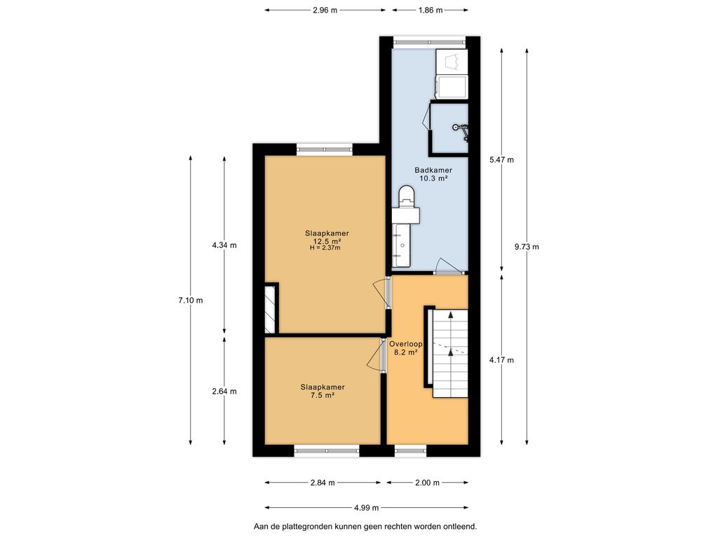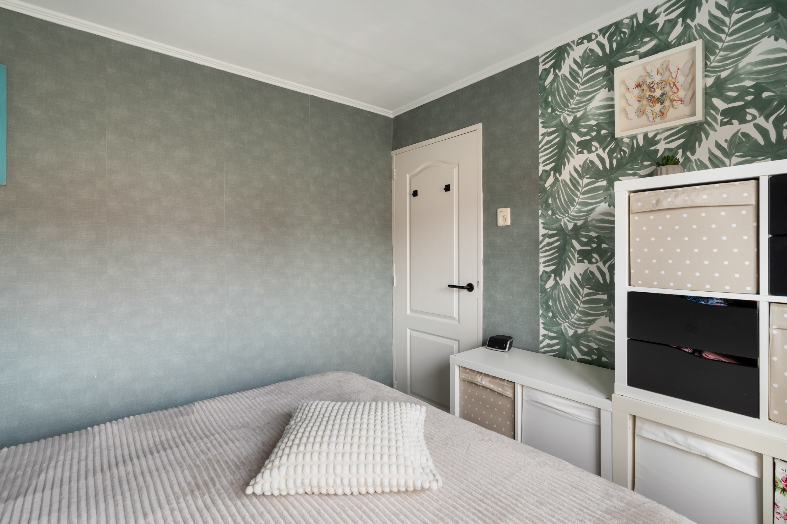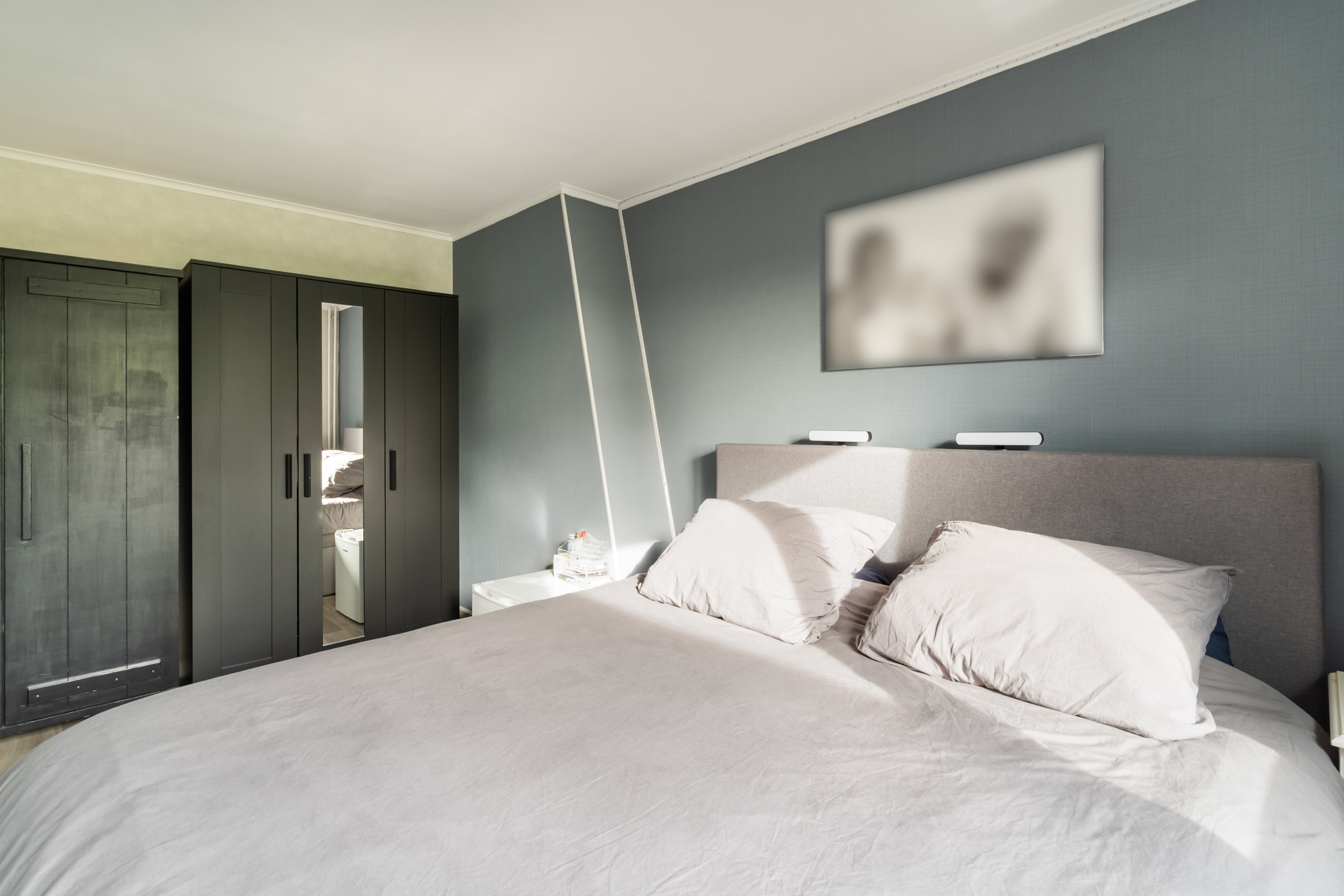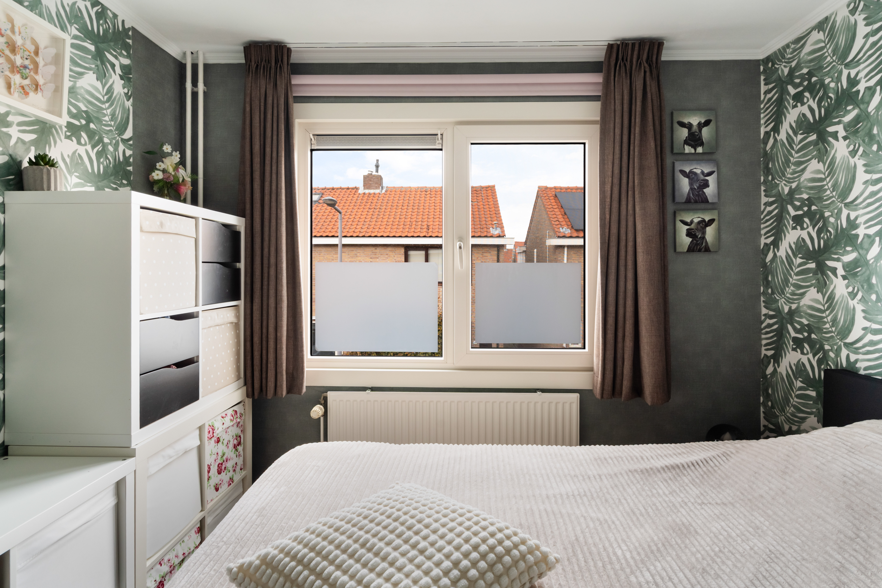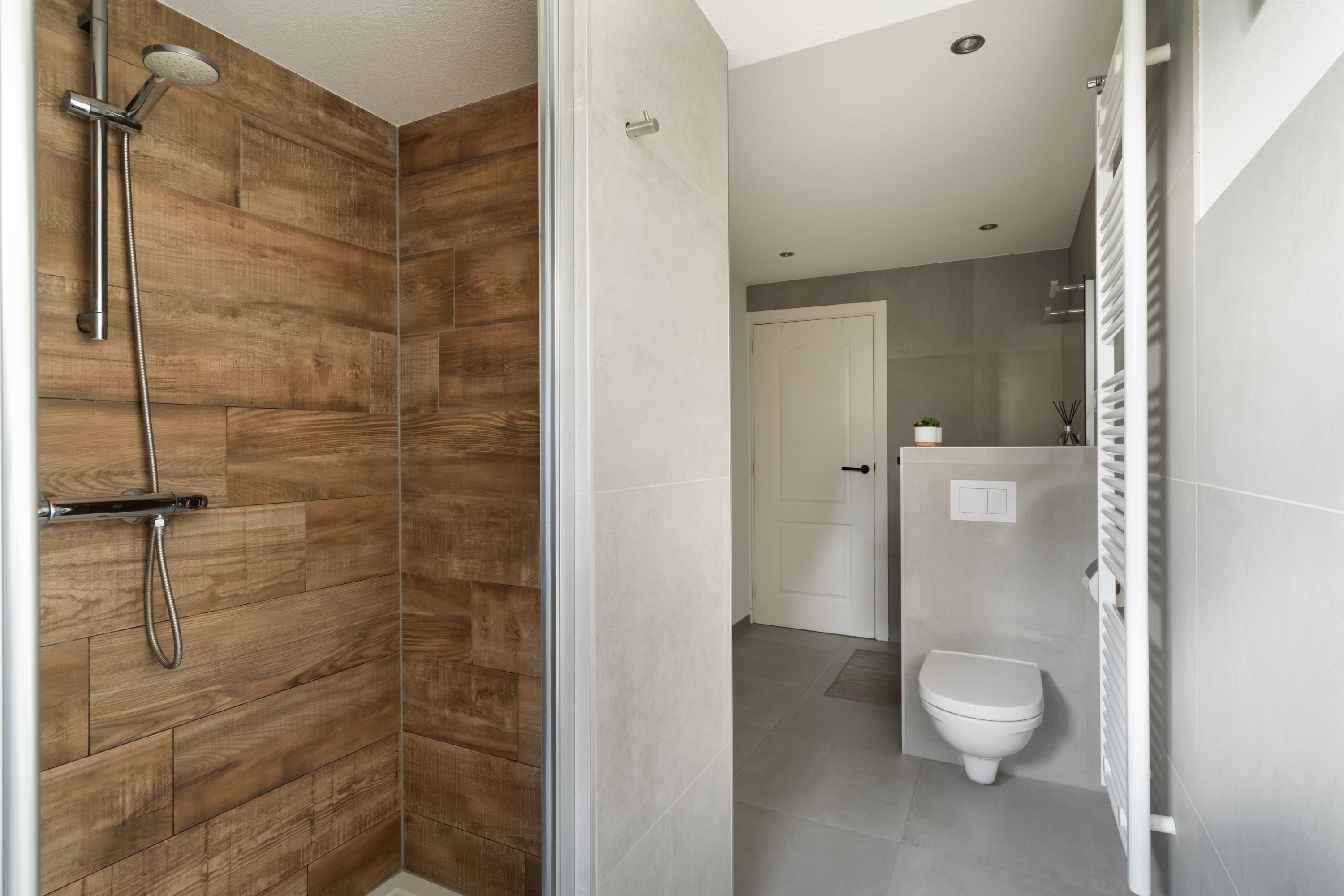 Overloop waarop vaste trap naar 2e verdieping, diverse bergruimte. 1e slaapkamer gelegen aan de voorzijde van de woning (2.84 x 2.64) voorzien van een vinylvloer. 2e slaapkamer gelegen aan de achterzijde van de woning (4.34 x 2.84) voorzien van een vinylvloer. De geheel betegelde luxe royale badkamer (5.47 x 1.86) uit 2019 is voorzien van een douchecabine, een dubbele wastafel met meubel, een toilet en een wasmachine-/drogeraansluiting.