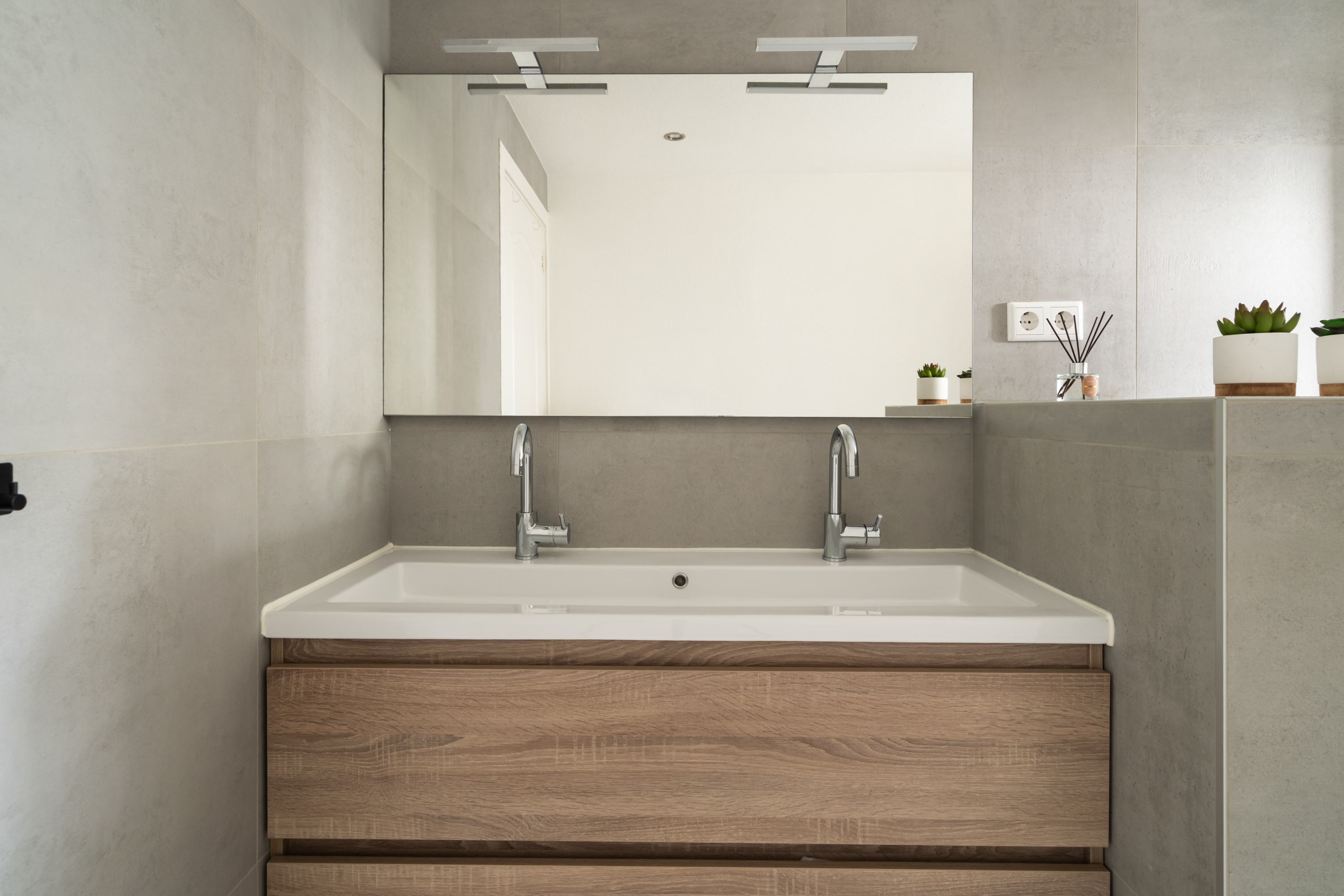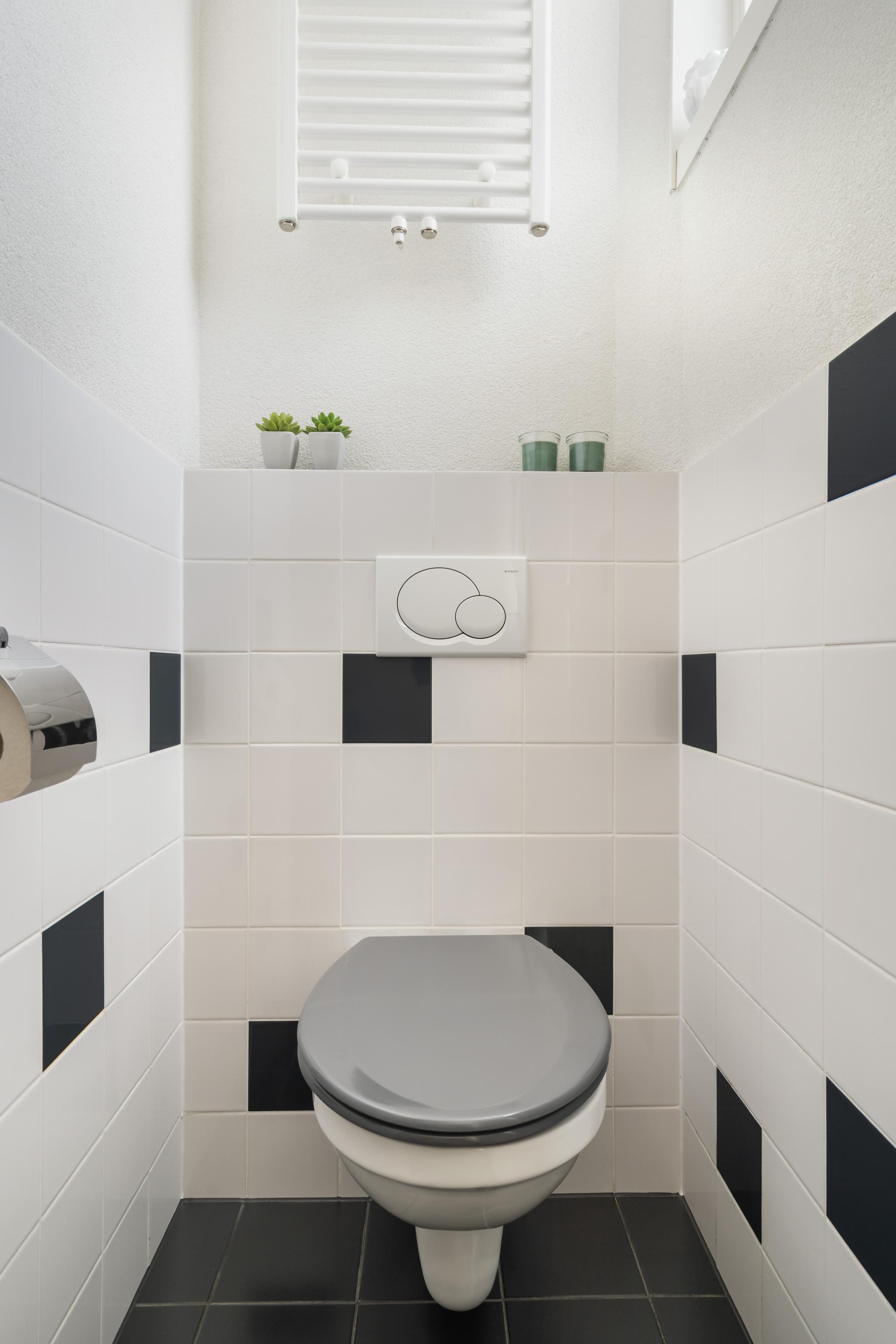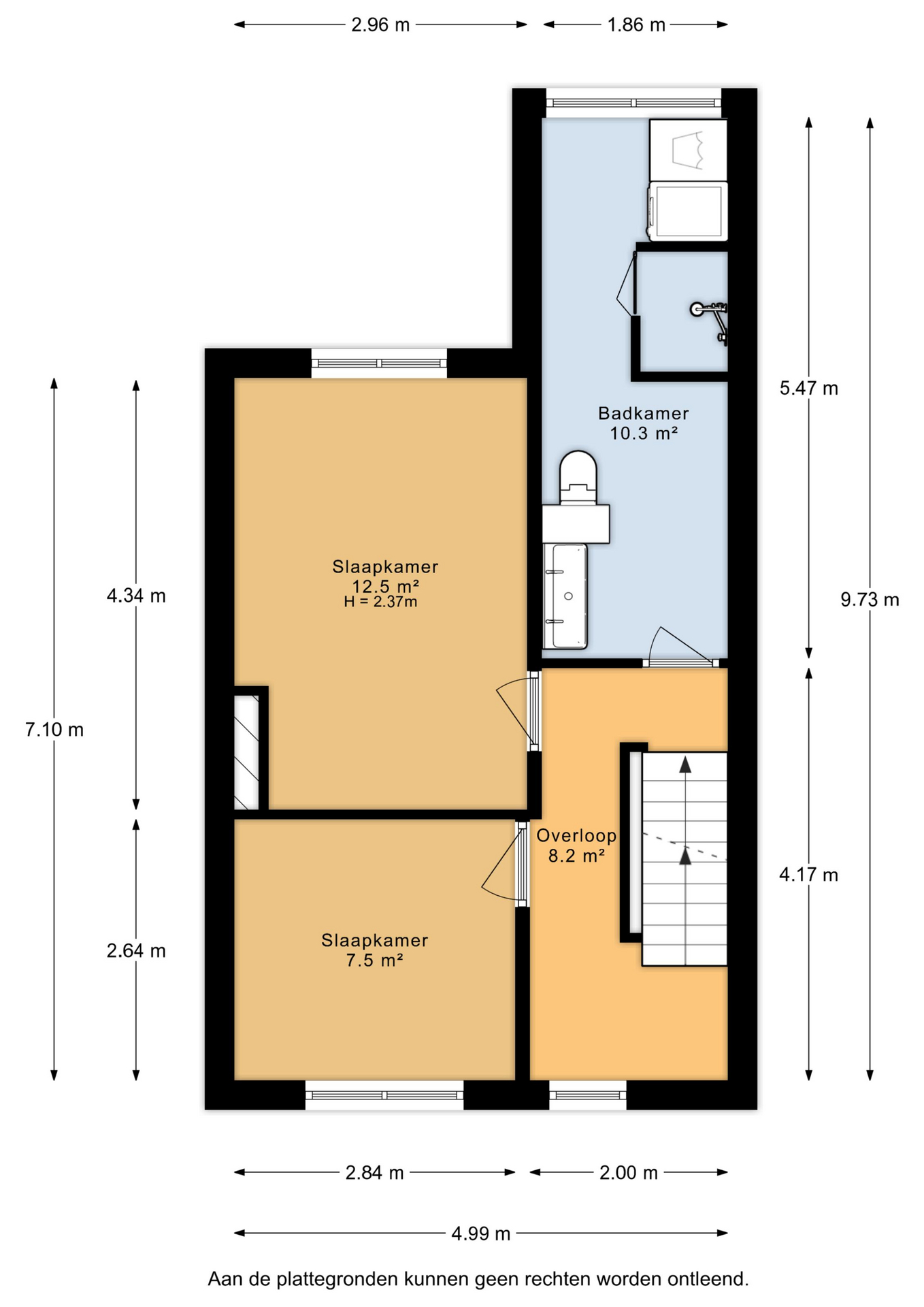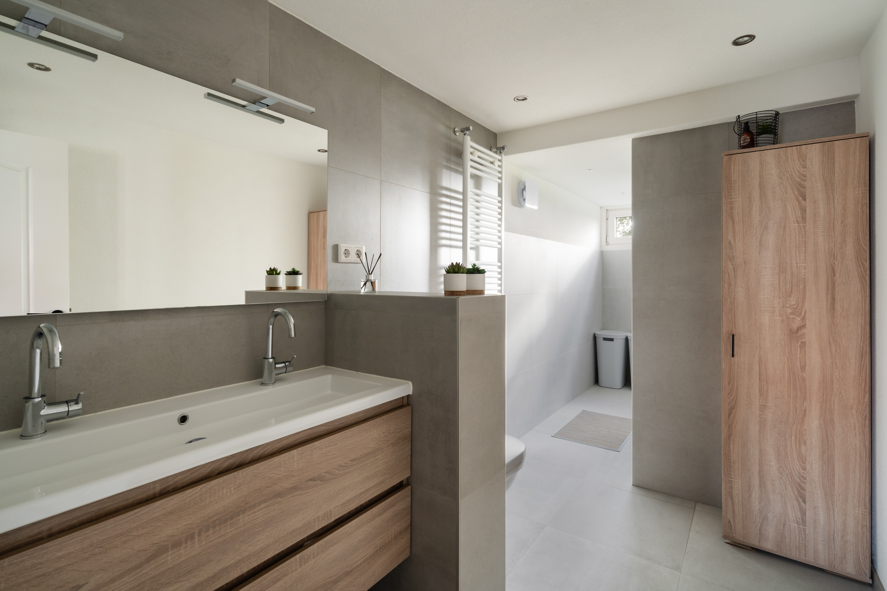 Overloop waarop vaste trap naar 2e verdieping, diverse bergruimte. 1e slaapkamer gelegen aan de voorzijde van de woning (2.84 x 2.64) voorzien van een vinylvloer. 2e slaapkamer gelegen aan de achterzijde van de woning (4.34 x 2.84) voorzien van een vinylvloer. De geheel betegelde luxe royale badkamer (5.47 x 1.86) uit 2019 is voorzien van een douchecabine, een dubbele wastafel met meubel, een toilet en een wasmachine-/drogeraansluiting.
